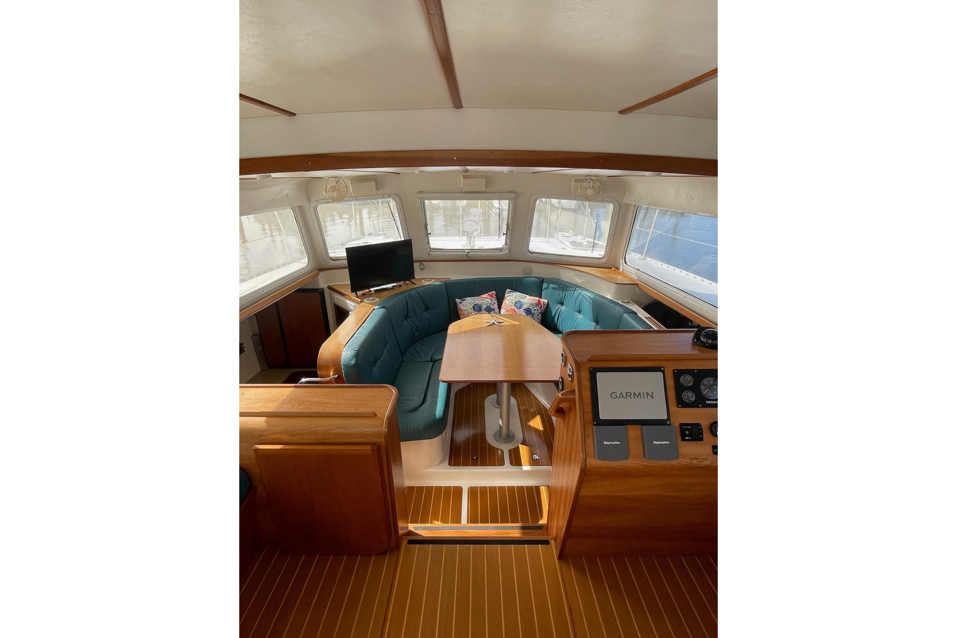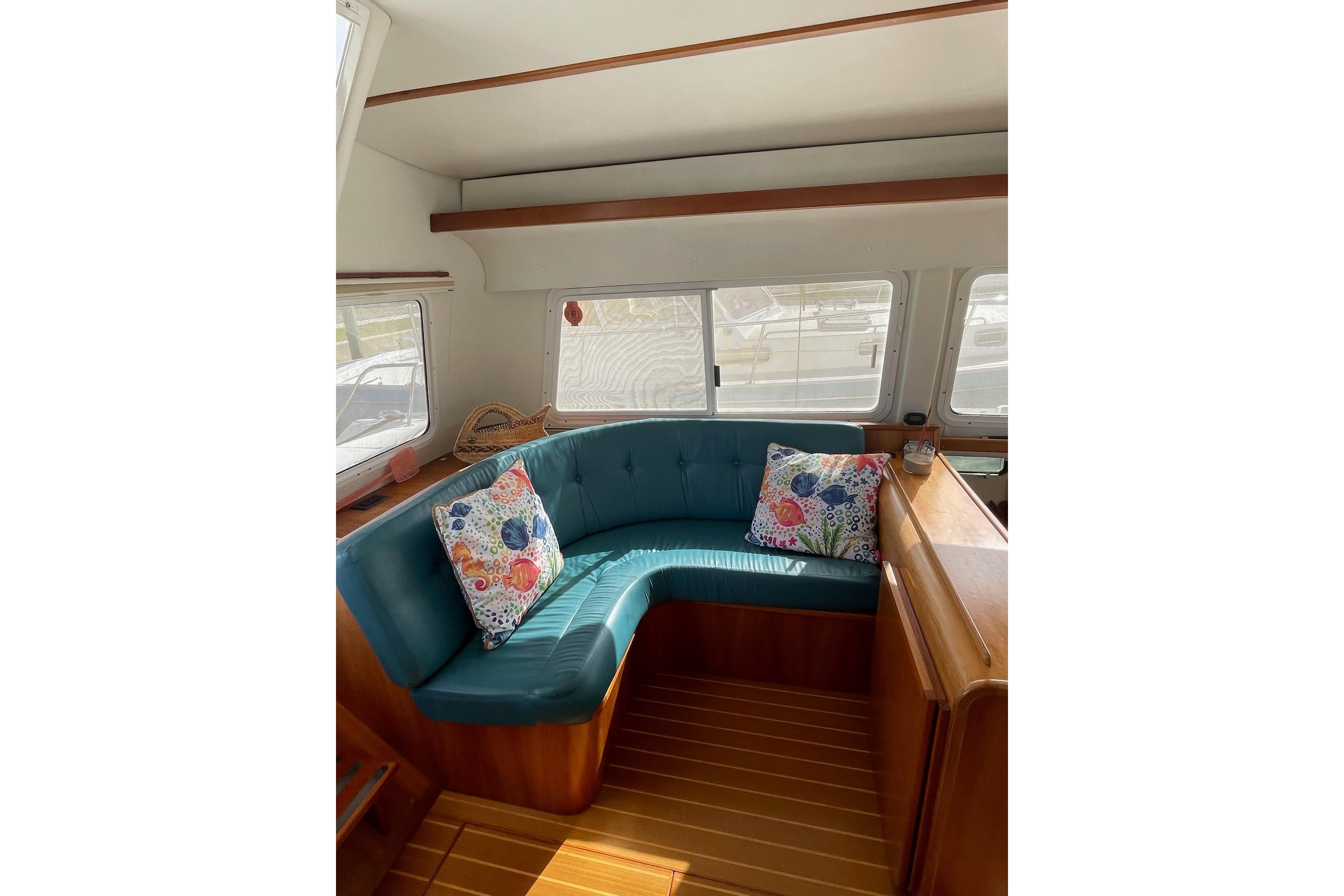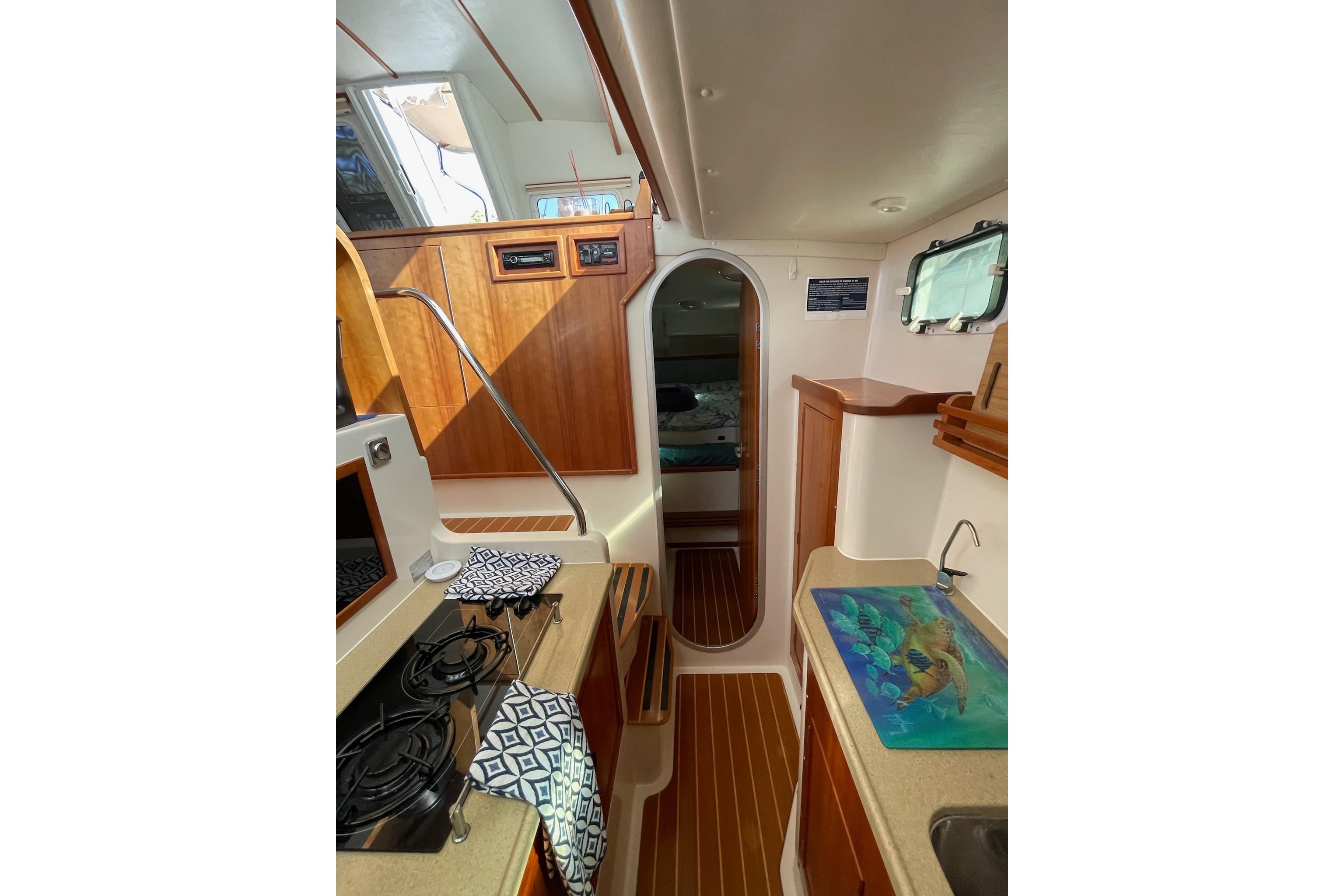 Entering through the glass sliding door aft, you step down into the spacious Salon including the Lower Helm Station with seat…Moving forward, the salon is centerline with a large U-shaped lounge and table that can be converted into a King Size berth…The Galley is down and midship in the port side hull along with one Stateroom aft…The Head & Shower is down and forward in the starboard side along with the Master Stateroom aft…Throughout the boat teak and holly flooring makes for a homey feel…Storage is also abundant with tons of cabinets and under floor dry storage
