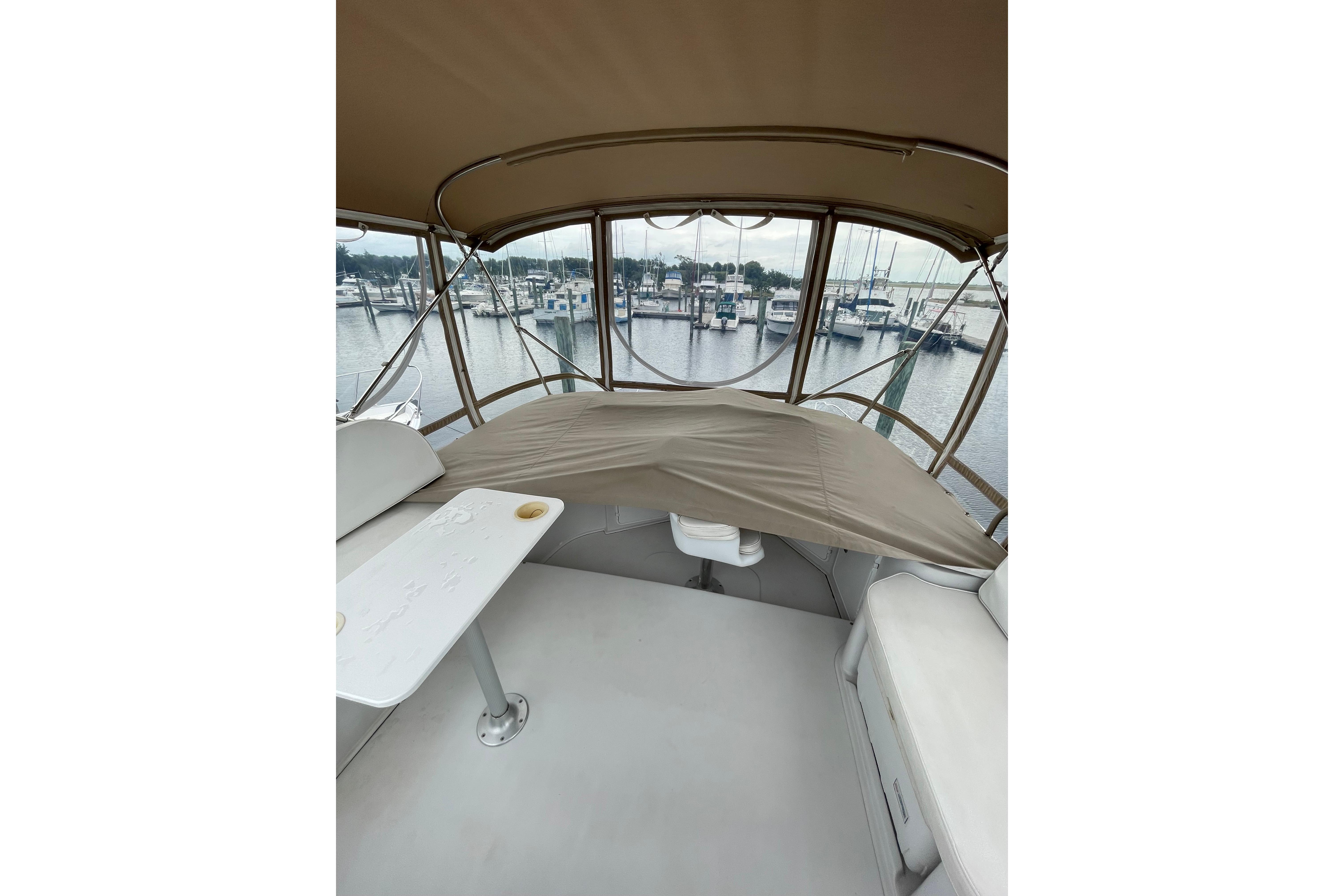 The Flybridge has a beautiful layout…A wide array of cushions allow for large group seating…The Radar Mast and Bimini Top can easily be dropped down for cruising under low structures…