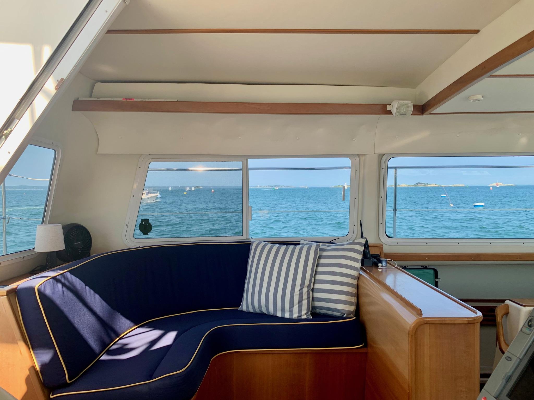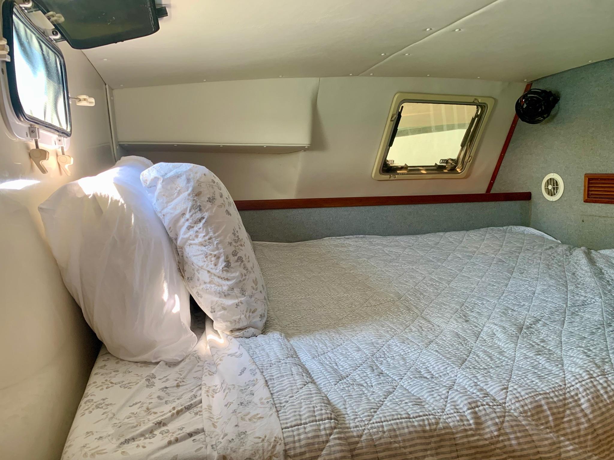 As you enter the vessel, you will note a large salon area, a curved seating area on your left and a lower helm on your right. You are surrounded by windows and a door that provide outstanding 360 degree visibility. The height and light of that openness that make the boat feel much larger than a 34 footer. In this area, you will find space to entertain 6 to 8; people, a table that seats six and drops down to make a queen size berth. On the port side midship is the galley containing a refrigerator/freezer, double sink, and Gourmet air fryer oven, pantry and lots of storage. Aft of that is a stateroom with queen size berth and again lots of storage area. On the starboard side midship is a changing area with lots of shelf and hanging storage. Forward is the head with Lavac manual salt water toilet, large showering area and a medicine cabinet. Aft is what is usually considerad the master stateroom with a queen berth lots cabinets, hanging storage, opening port, tan, and large opening hatch aft. Both staterooms have heat and AC.
