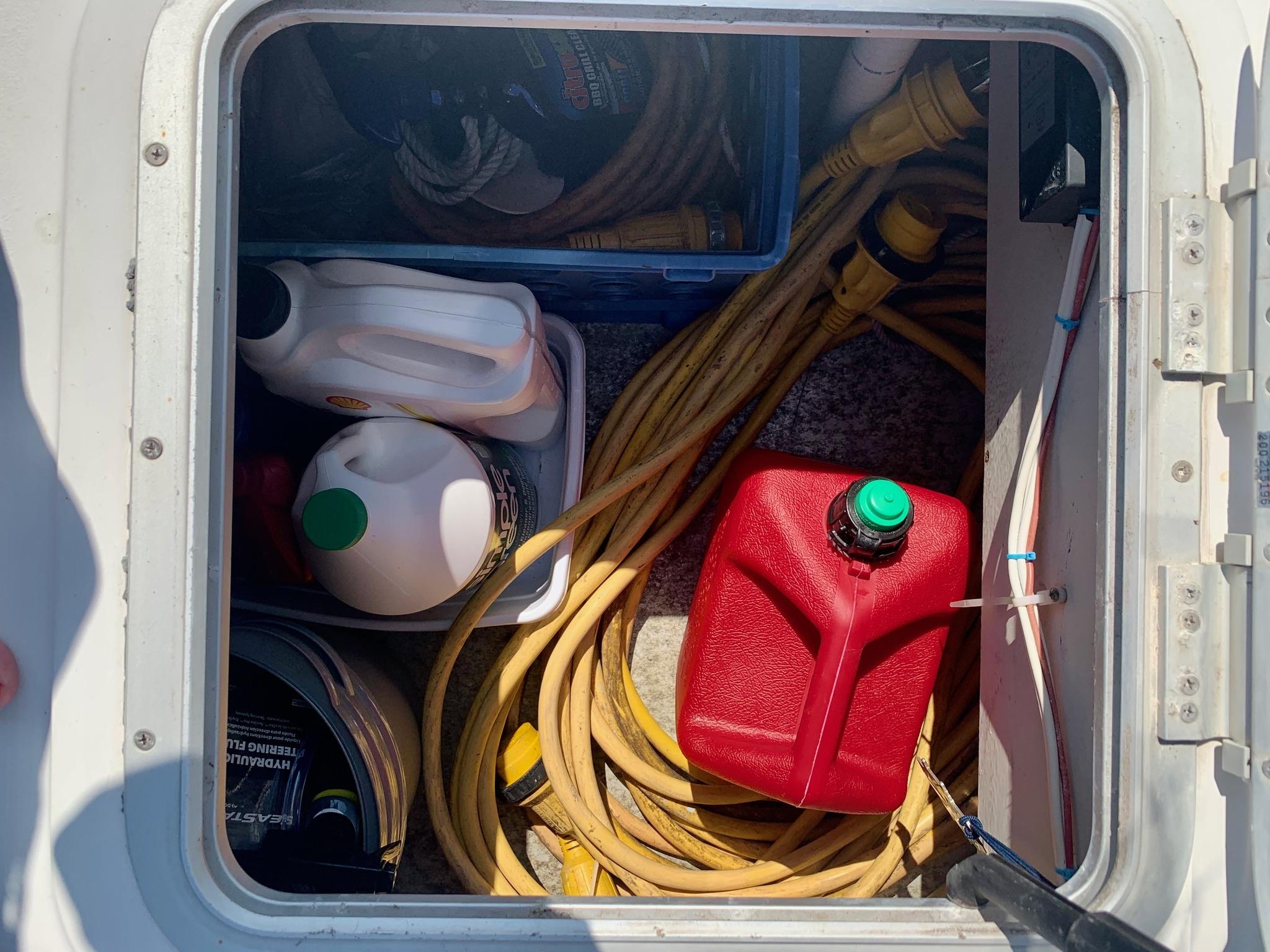 Ascending the stairs to the flybridge, you will find a large open seating area, great far entertaining in nice weather. The Todd helm chairs are custom as well as the instrument/steering wheel cover. There are two new folding chairs. On the foredeck you will find four lockers, two are all the way forward in the hull. On the port side the generator is located in a sound insulated compartment with lots of storage forward. The starboard side is primarily far storage but also contains the black water discharge pump and the raw water wash down pump all at eye level far ease of maintenance. In between the two hull storage areas are two smaller hatches that give access to the fresh water tank and the forward fuel tank. Lots of storage is available above both tanks. In between these two lockers is the anchor chain storage area that is accessible from behind the seat in the salon.