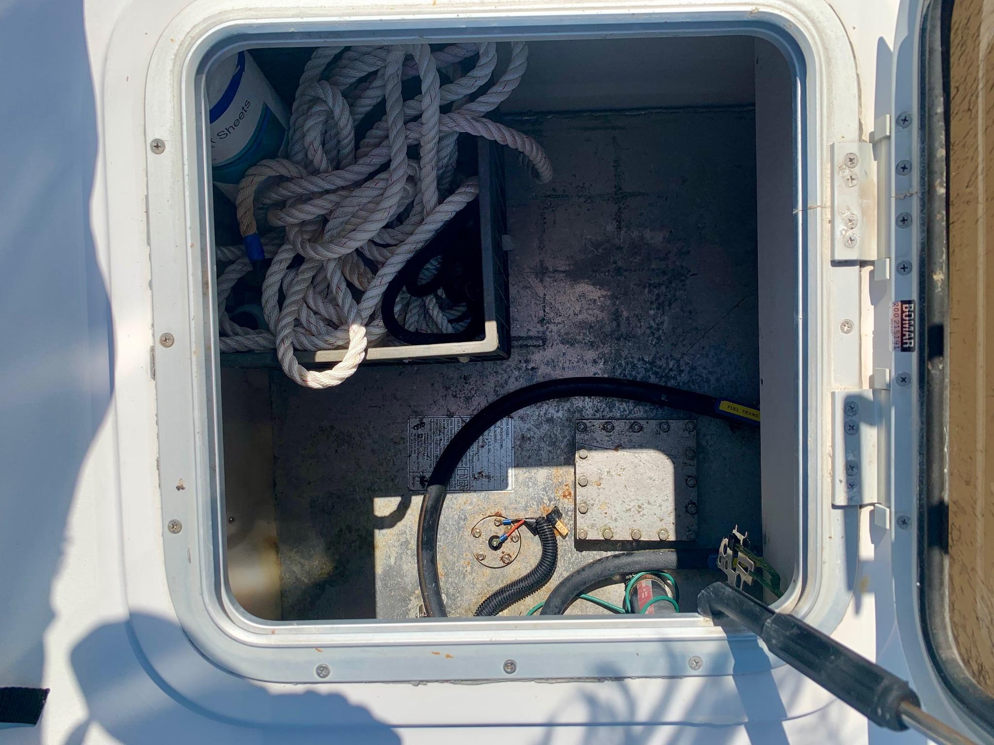In addition to the deck equipment, this boat has a Heavy Duty Radar Mast with GPS Antenna, Radar Dome, VHF Antenna, and the required navigational lights. The PDQ 34 features large storage locker in each hull at the bow. The generator is installed in the port bow locker and is very accessible for maintenance. Each hull has a water-tight “crash” bulkhead built in below the waterline in the forward section of each hull. There are also nice storage areas located on top of the auxiliary fuel tank and the water tank.