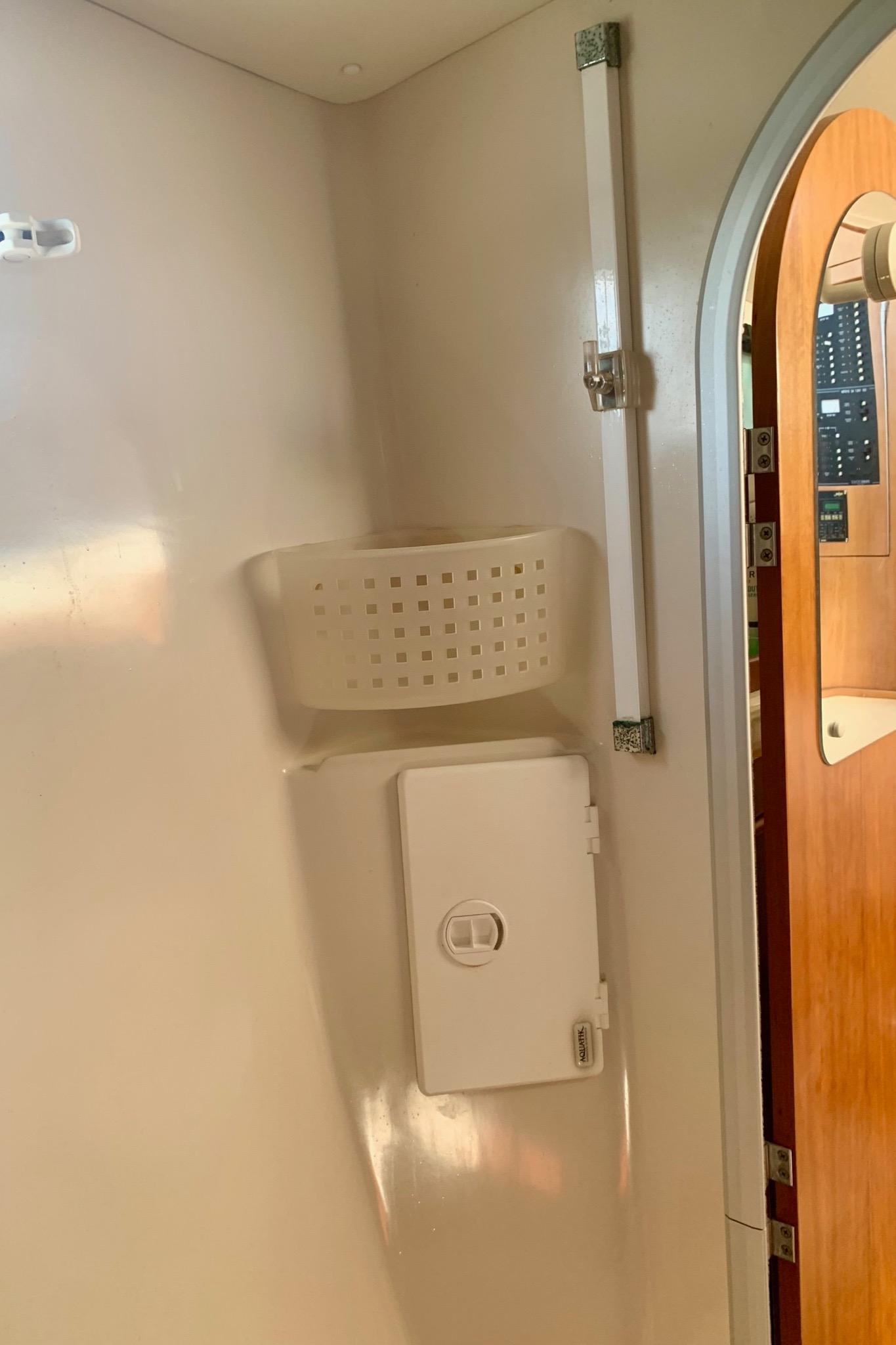 The Head is located on the Starboard Side forward. It contains convenient storage spaces, manual toilet and shower.