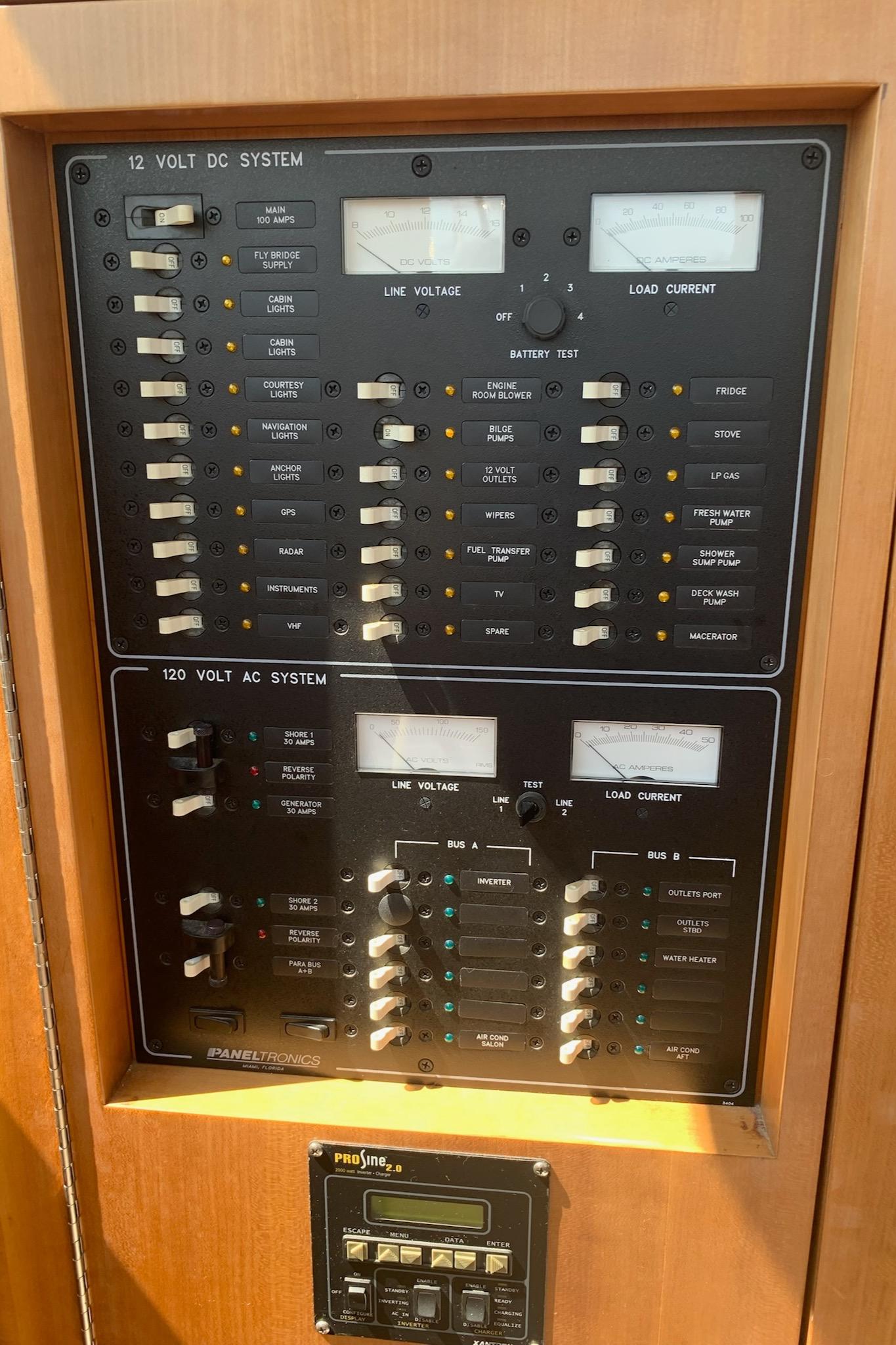 The PDQ 34 electrical system is designed for efficient live-aboard cruising. The critical components are a good reliable generator, larger house battery bank, large capacity charger / inverter and minimum reliance on shore power. Details include: