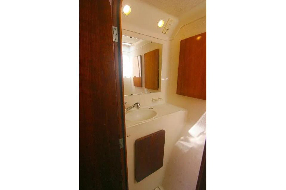 The heads can be supplied by either seawater or fresh water via two-way selectors. A holding tank is connected to the port forward toilet via a selection valve and can be emptied via a deck fitting or by gravity drain to a submerged through-hull.