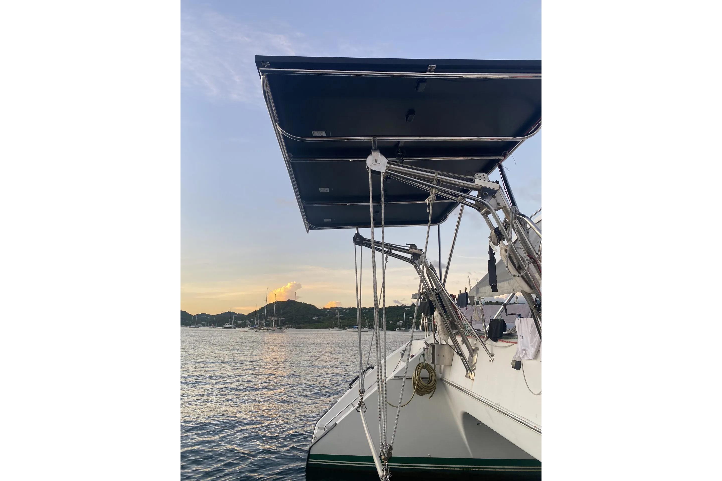 Heavy-duty davits support the dinghy and outboard while at sea, high enough to be clear of the waves. The davits also support a solar array, keeping the dinghy out of the sun and providing unobstructed solar generation.