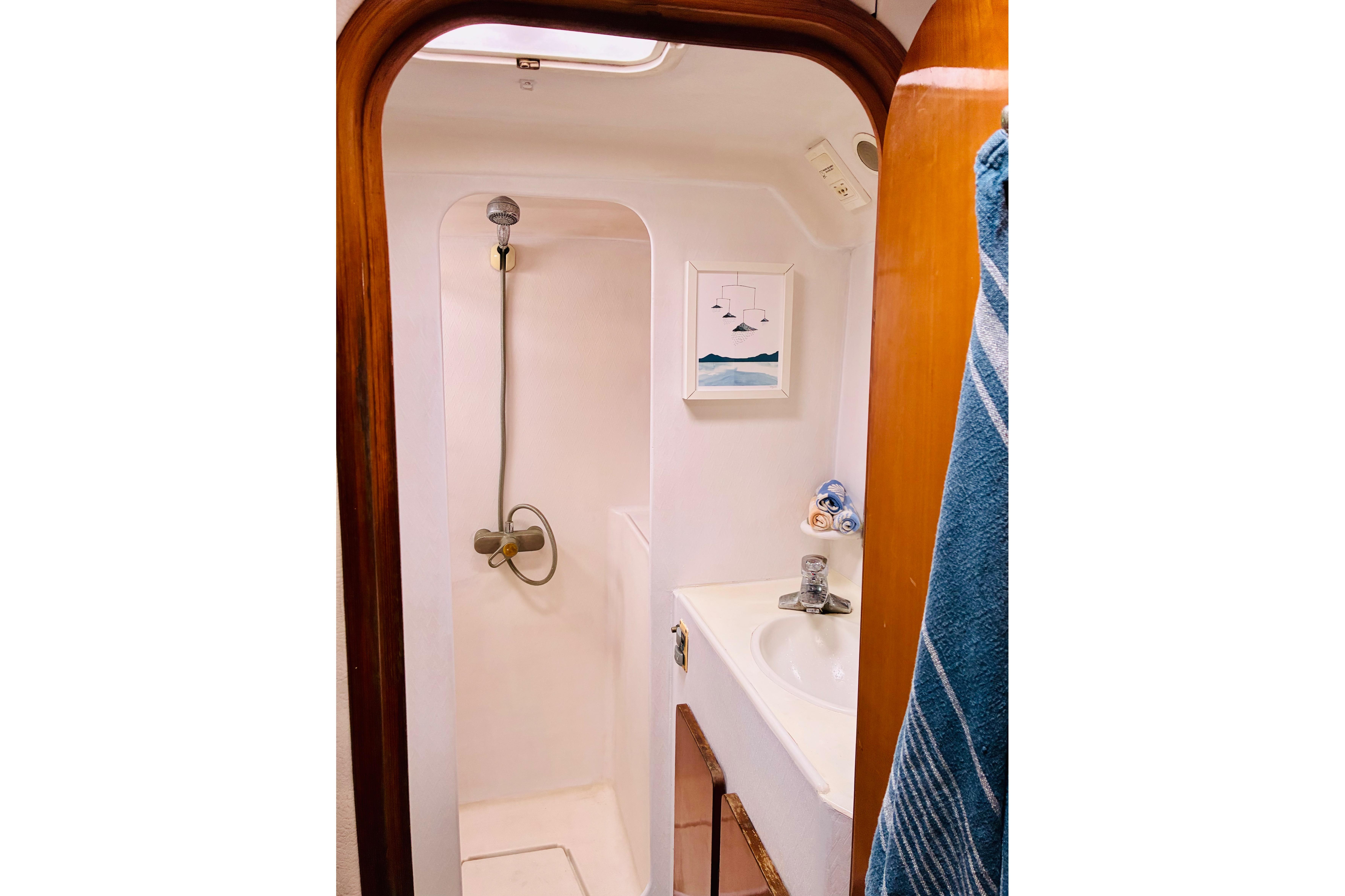 Water and plumbing. There are four heads, with two forward heads having separate shower stalls. The aft heads have pull-out faucets if a shower is desired. Each head drains to a shower pan with a manually activated pump-out. There is also a separate shower room in the starboard hull that has been re-purposed into a wet/scuba locker. The exterior port transom features a handheld shower.