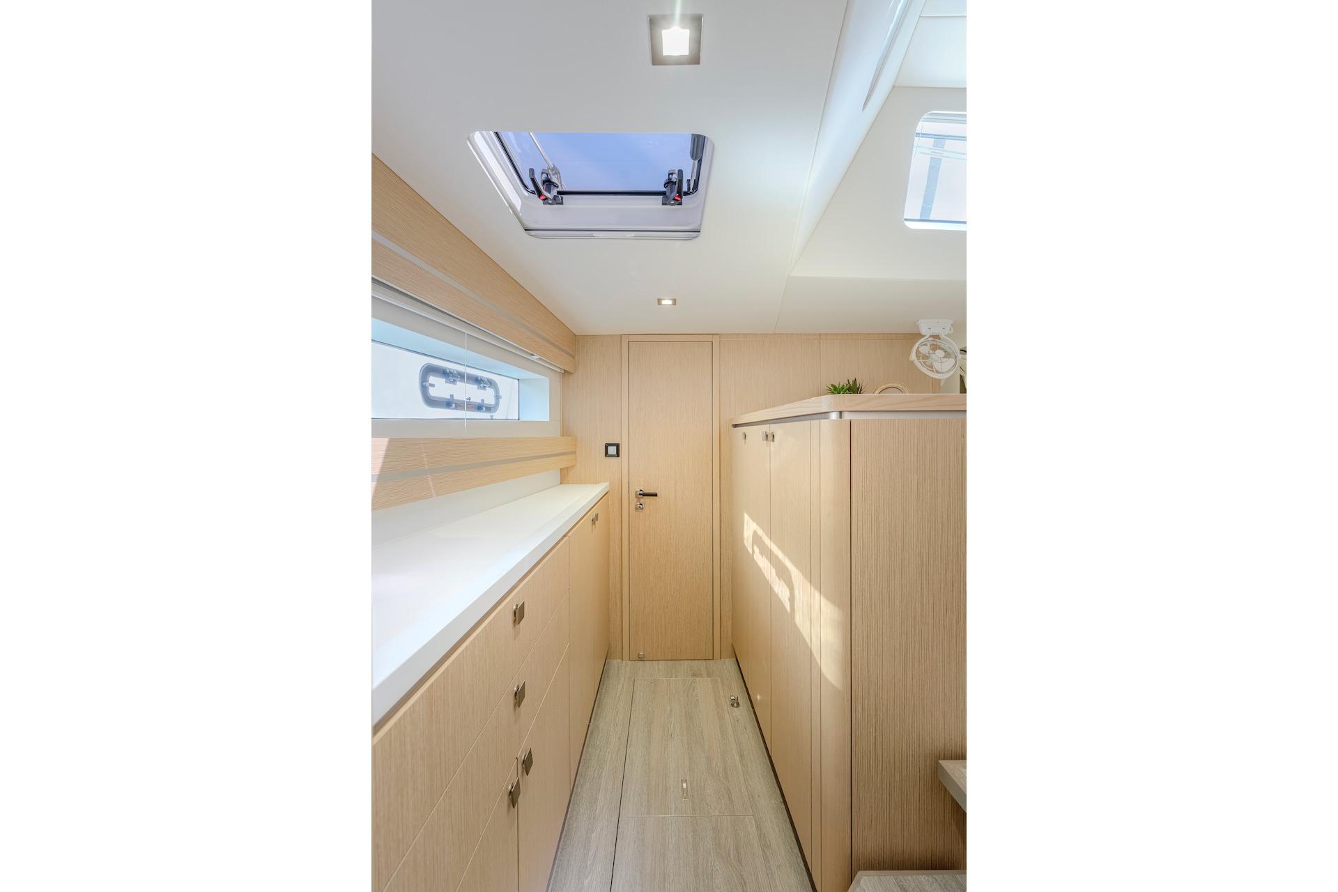 Storage Capacity -Storage capacity is essential for extended time aboard. A dedicated wardrobe in the master suite, a floor to ceiling pantry and large capacity fridge and freezer in addition to a well-appointed galley with plenty of cupboards and counter space are just a start. Also as important are spaces to store wet or bulky items such as fenders and additional sails. Theres also a dedicated location for an easy to deploy life raft in the cockpit that doesnt interfere with the flow of movement.