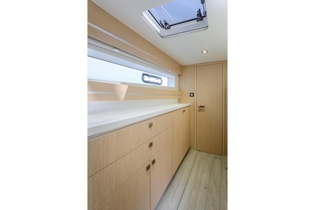 Storage Capacity -Storage capacity is essential for extended time aboard. A dedicated wardrobe in the master suite, a floor to ceiling pantry and large capacity fridge and freezer in addition to a well-appointed galley with plenty of cupboards and counter space are just a start. Also as important are spaces to store wet or bulky items such as fenders and additional sails. Theres also a dedicated location for an easy to deploy life raft in the cockpit that doesnt interfere with the flow of movement.