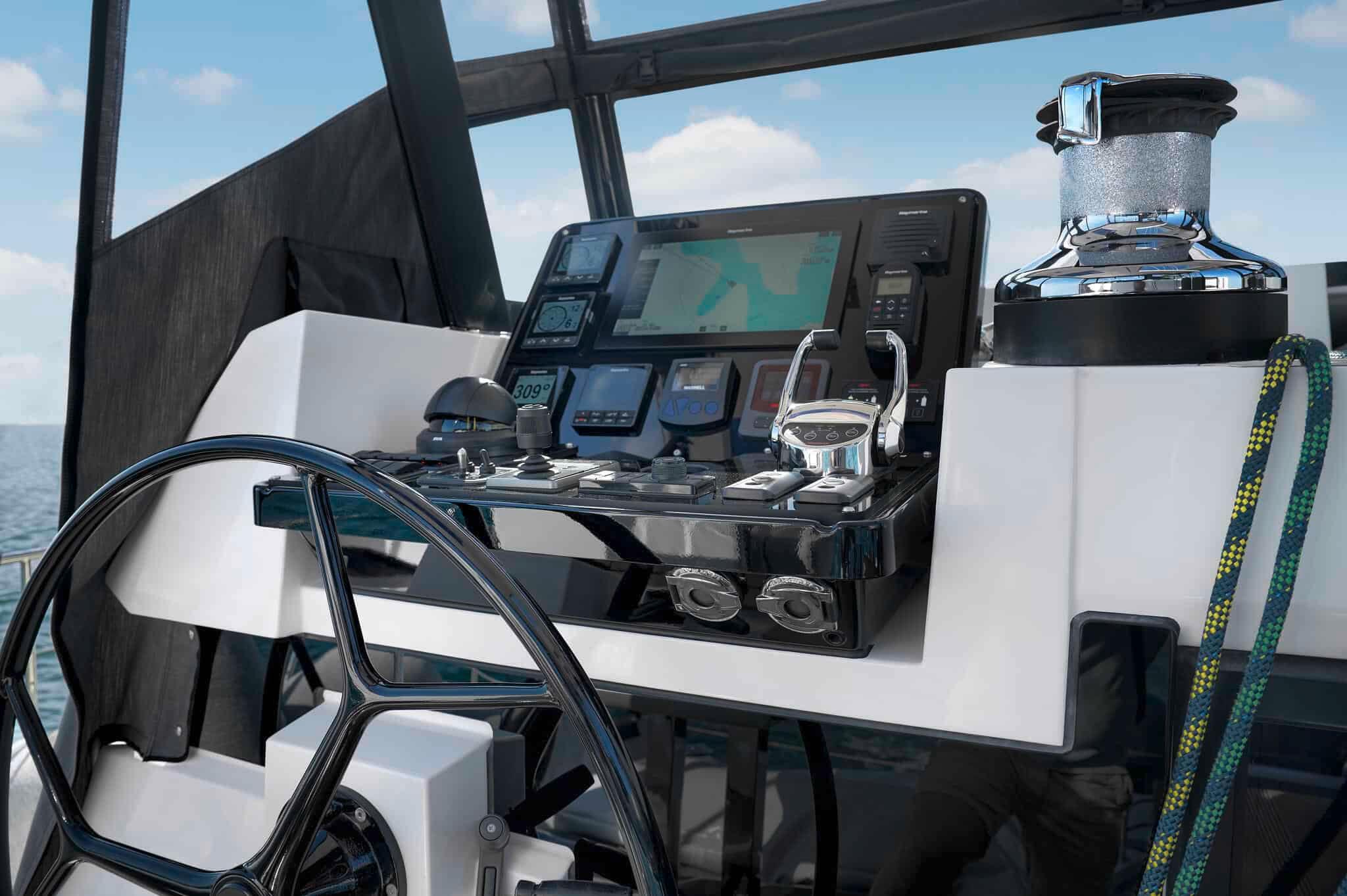 The helm position provides greater visibility and direct communication to the cockpit and the upper fly deck. An intelligent line management system allows you to trim and adjust your sails without ever leaving the helm. Also, single line reefing, main halyard, main sheet and genoa sheets are led to two electric winches right at the helm. The genoa is easily controlled by the standard electric furling system.