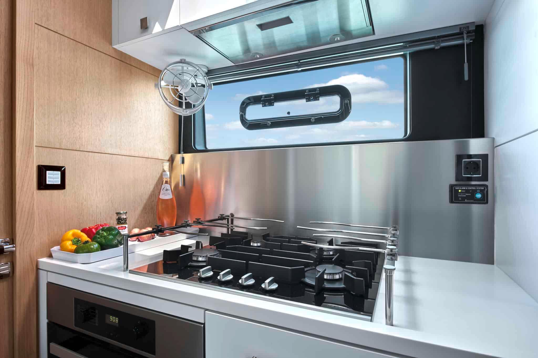 • Inner side – Galley area incl. numerous storages, worktop in synthetic resin (Hi-macs collection – see color chart) equiped with: