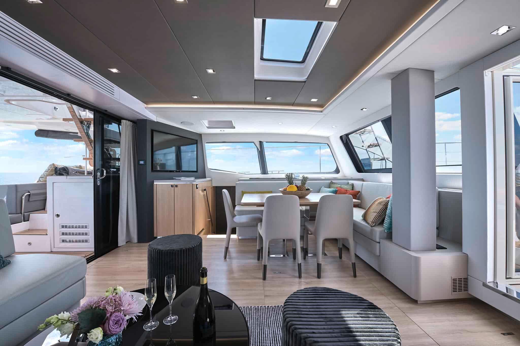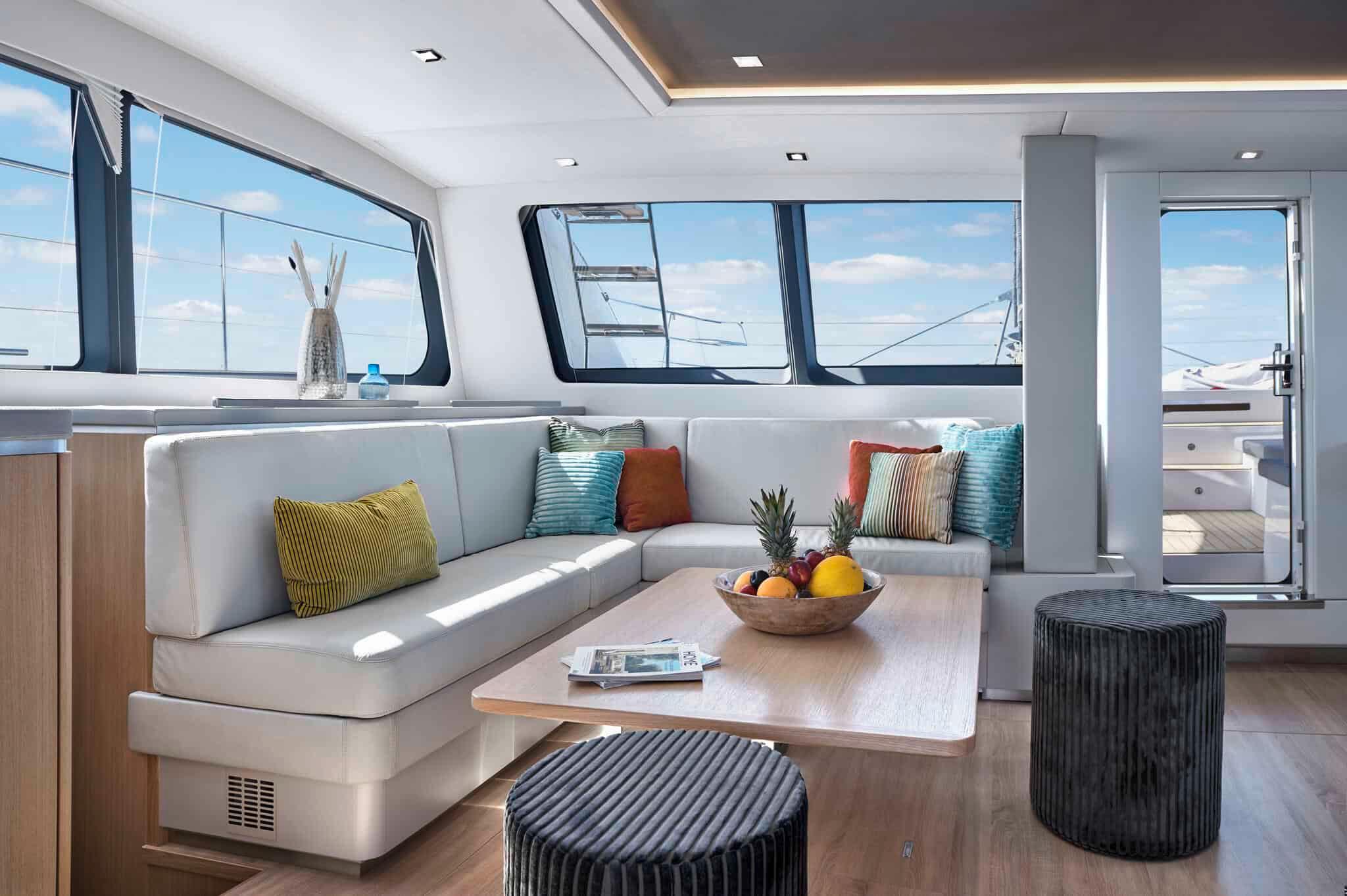 The Privilge Signature 580 is available with a forward lounge that can be accessed from both the salon and the owners suite. A second option that uses the foredeck area for storage is also available, eliminating the forward cockpit lounge and direct access from the salon and owners cabin.
