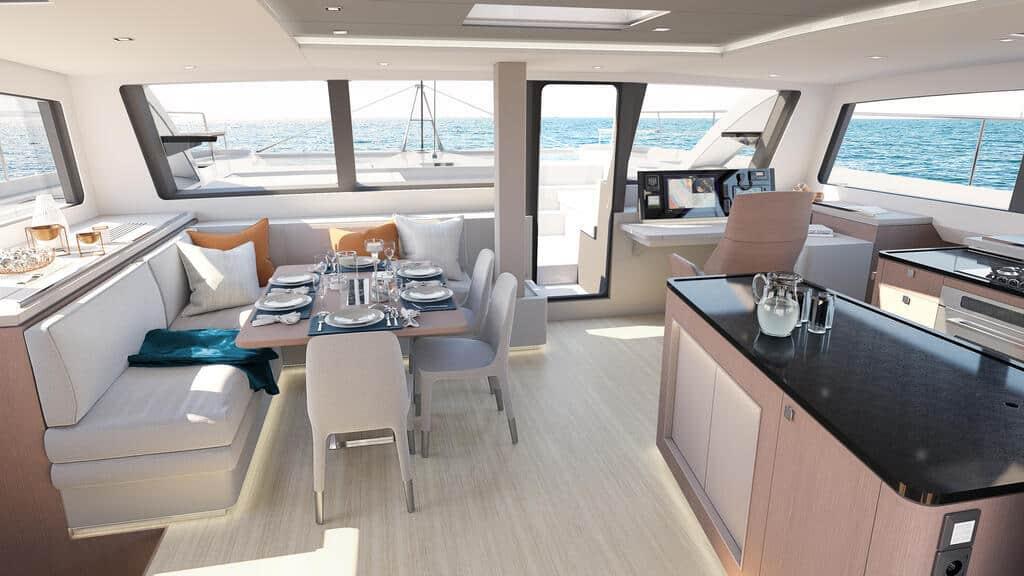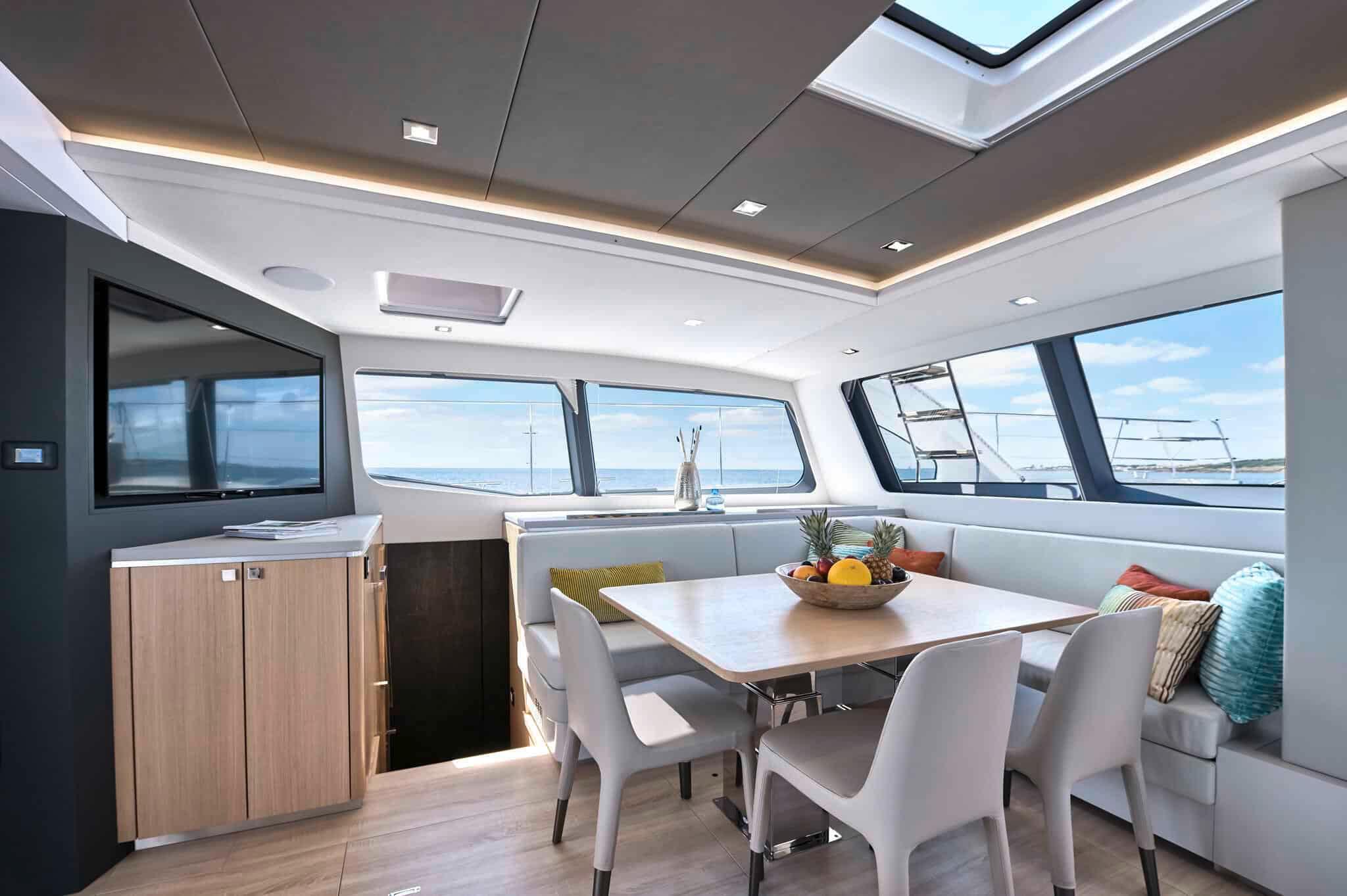 The Privilge Signature 580 is available with a forward lounge that can be accessed from both the salon and the owners suite. A second option that uses the foredeck area for storage is also available, eliminating the forward cockpit lounge and direct access from the salon and owners cabin.