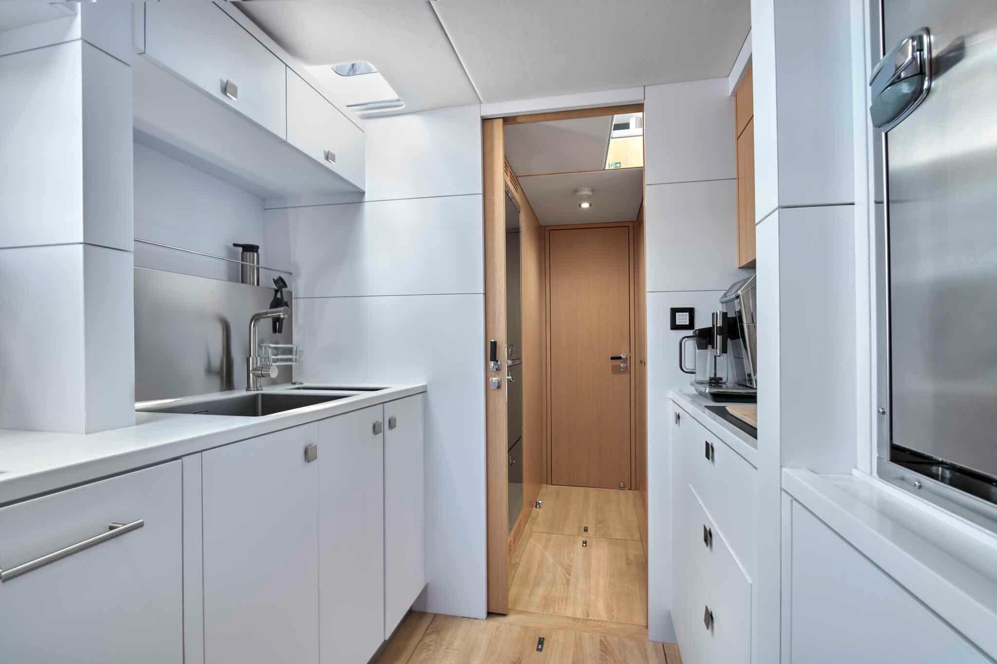 • Inner side – Galley area incl. numerous storages, worktop in synthetic resin (Hi-macs collection – see color chart) equiped with: