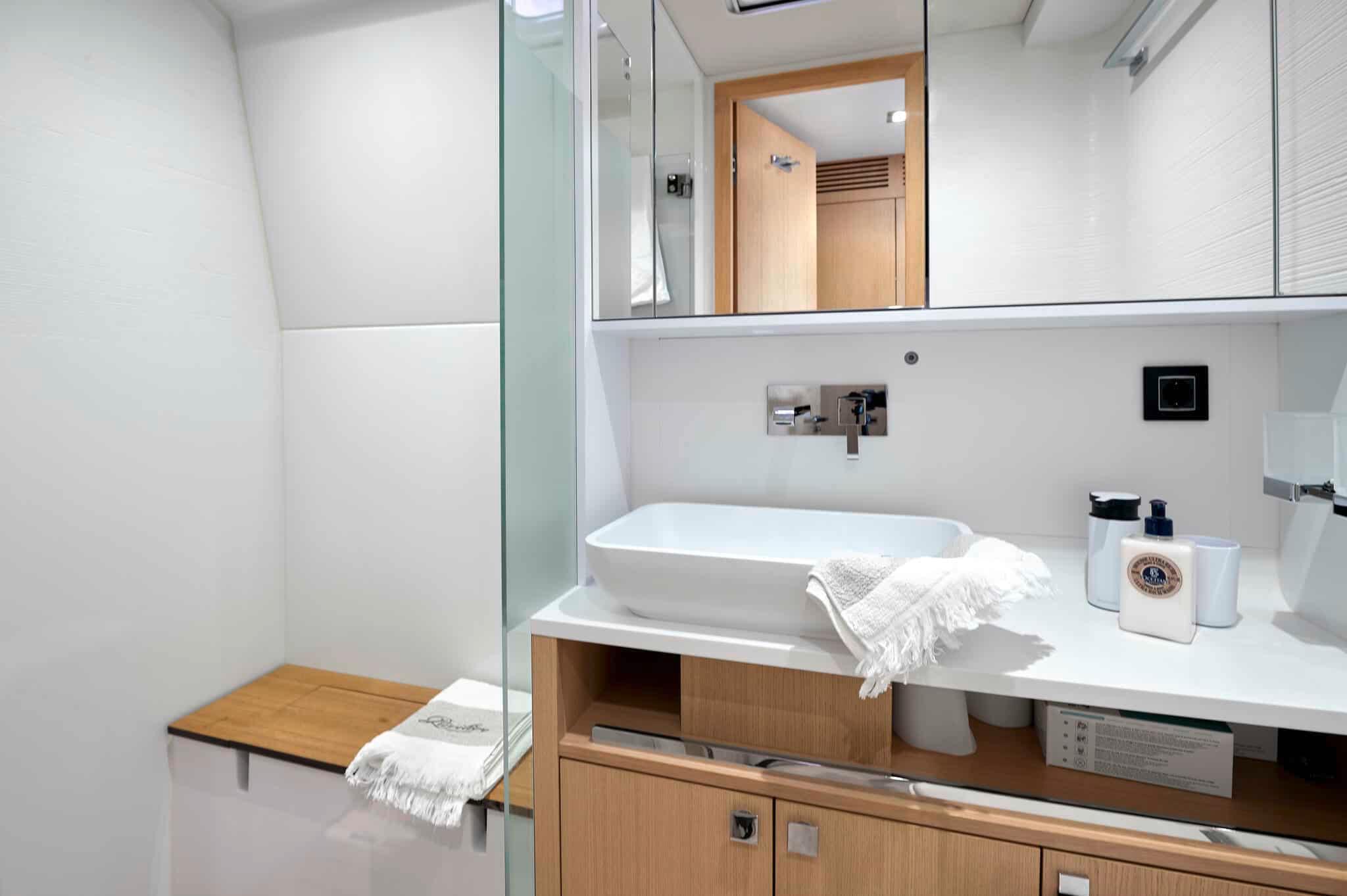 • 230 VAC, 50Hz circuit with 2 outlets in each cabin, 4 in the master suite, 4 in the galley, 2 in the saloon, 2 at chart table, 1 in each head and 1 in each engine room