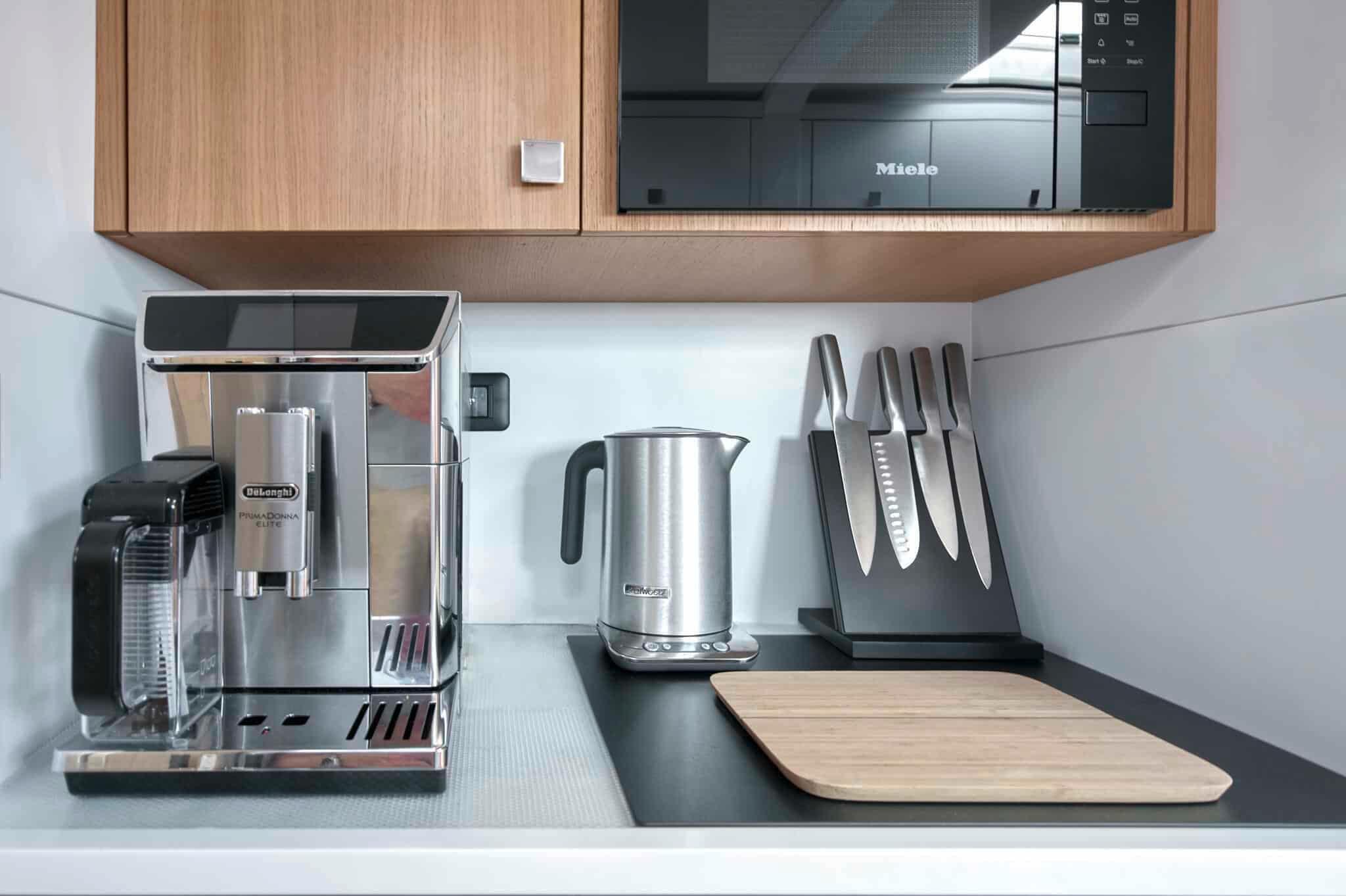 • Outer side – Galley area incl. numerous storages, worktop in synthetic resin (Hi-macs collection – see color chart) equipped with: