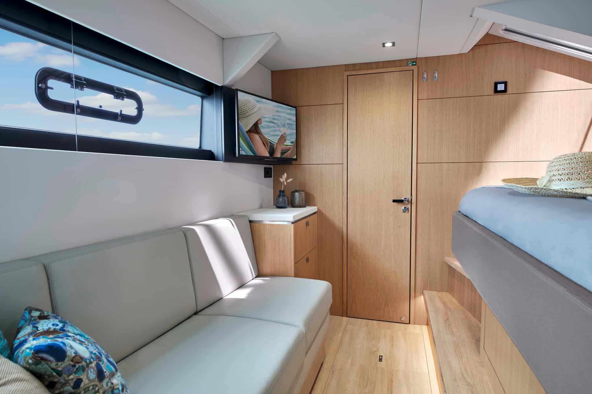 • Aft inner side – 1 transverse double bed 160 x 200 cm with 1 drawer underneath and 2 bedsides