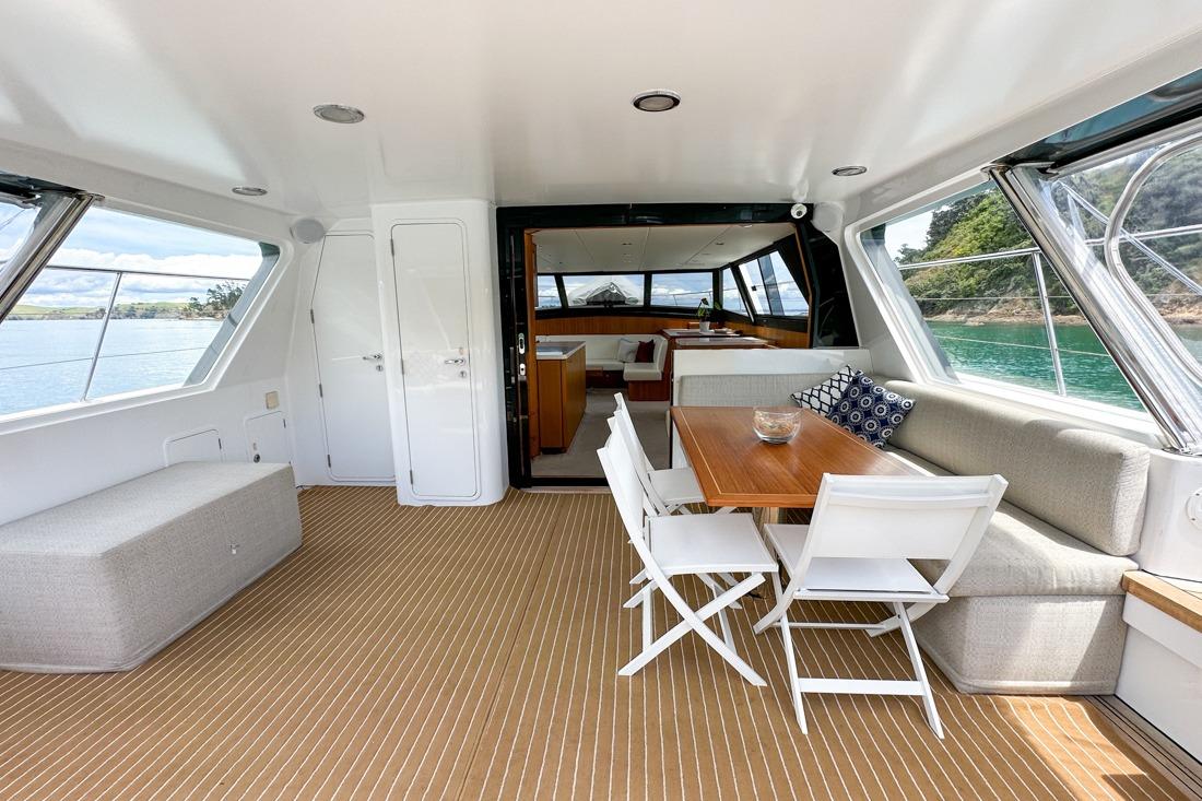 The Simrad electronics suite, including radar, autopilot and multifunction displays, ensure confident navigation. Escape also features a plug in docking controller alongside electronic steering and throttles for precise handling. In 2019, the cockpit interior was redesigned, adding a modern seating arrangement with entertainment in mind, making the space fully enclosed and even more inviting to all those onboard.