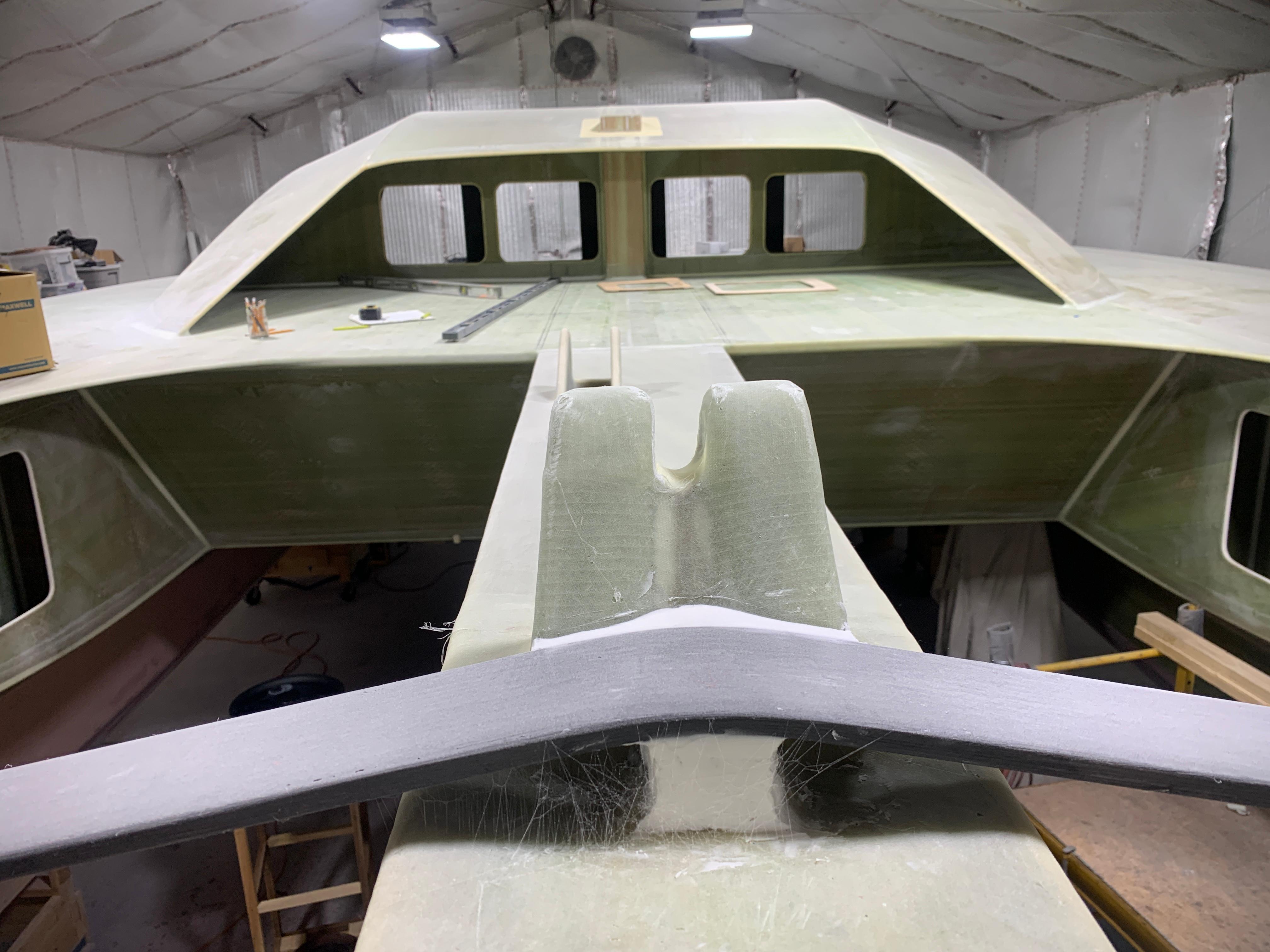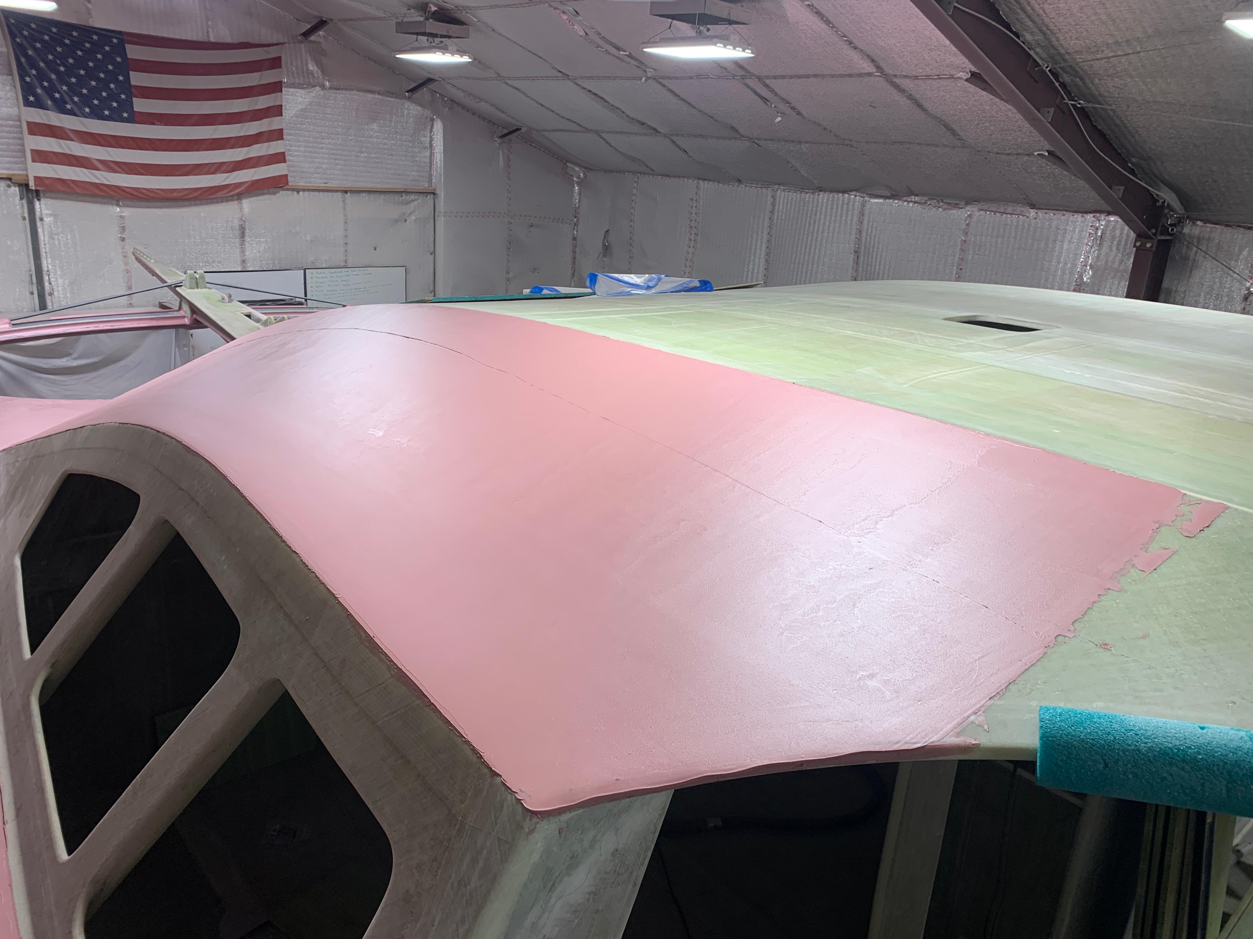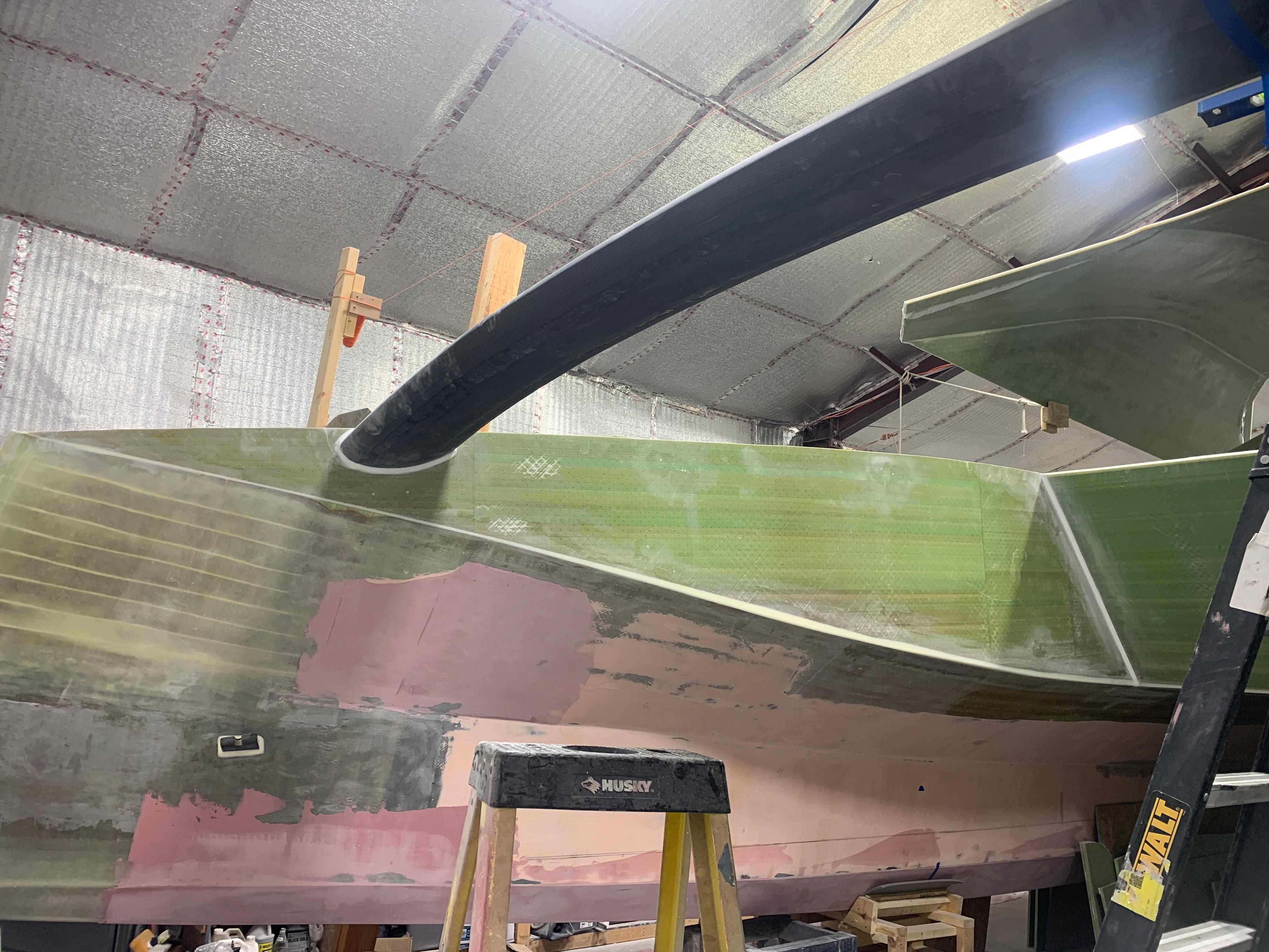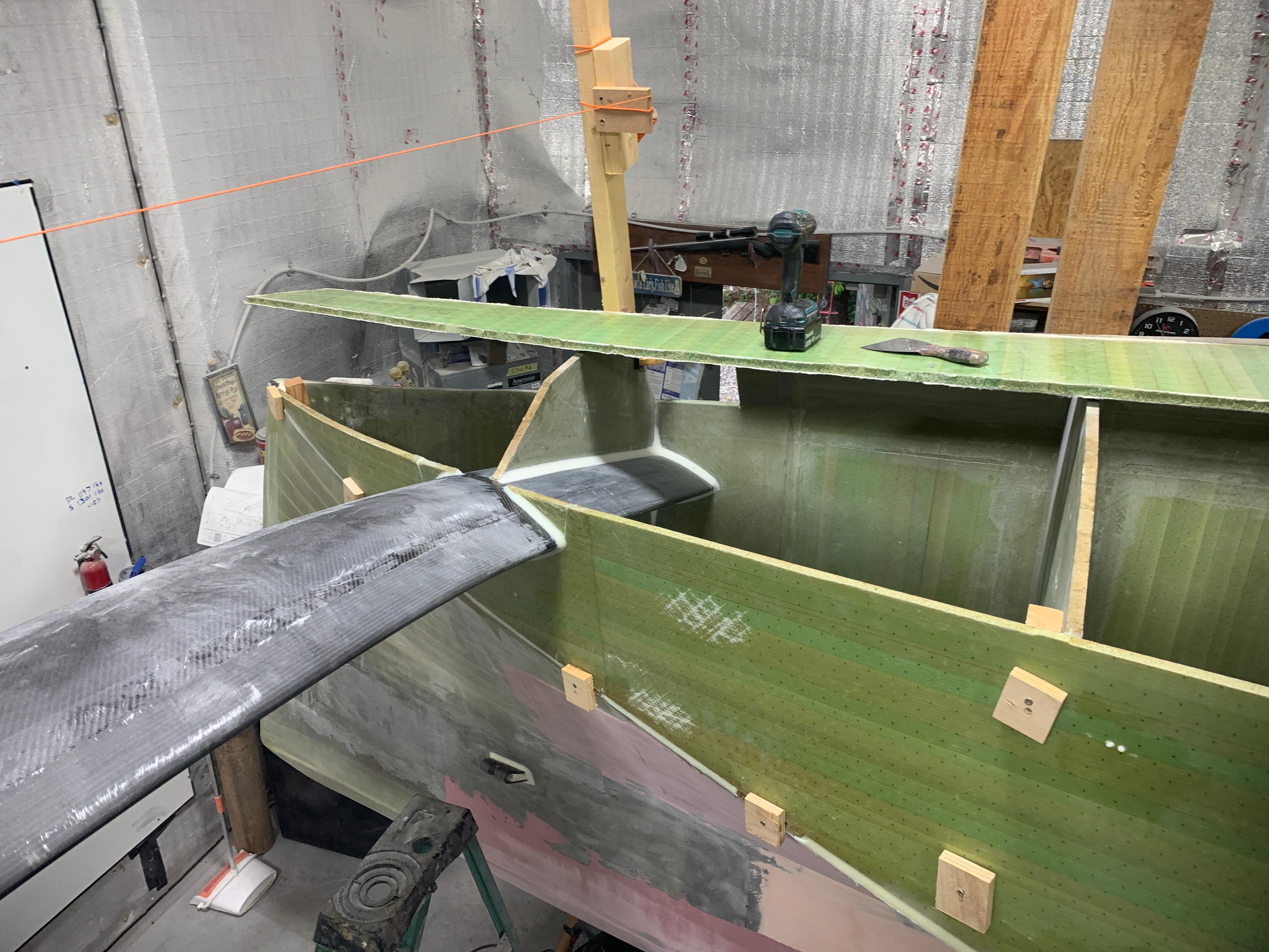 Joined with cabosil/cotton flock high density fillers and epoxy/fiberglass tape lines Faired with epoxy 2 part fairing compound