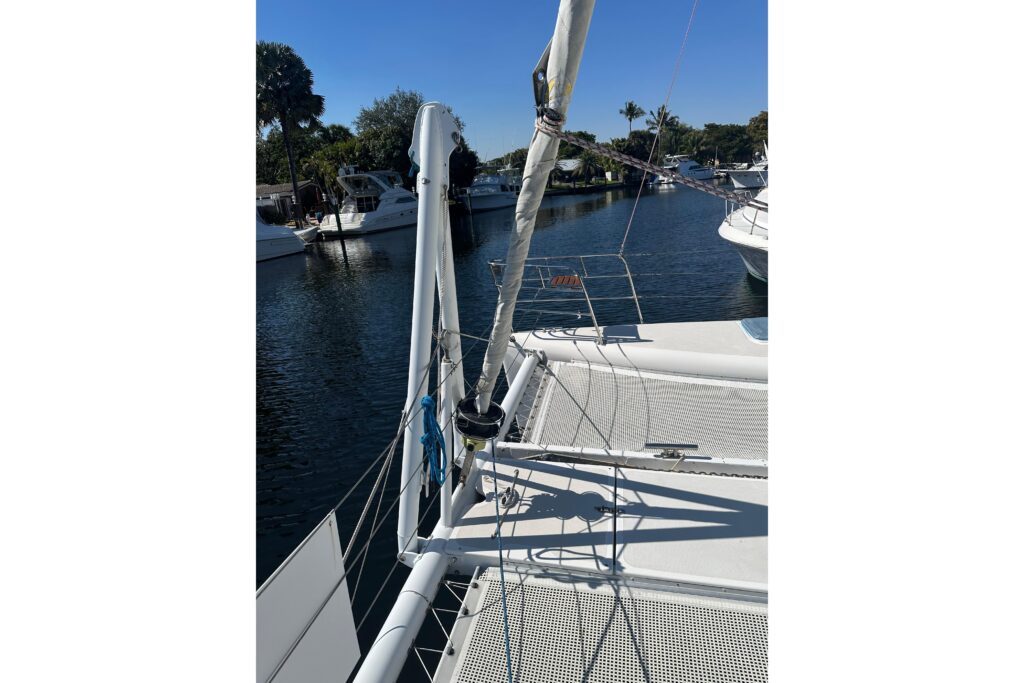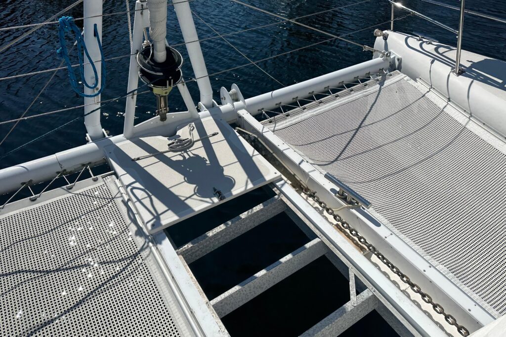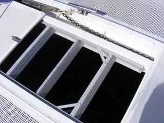 Moving up to the foredeck, decks and cabin top are white with molded nonskid. There are stainless hand rails across the cabin top and opening hatches over the cabins with blue sunbrella covers and bug screens. All the way forward there is a retractable folding bow sprit that carries the screacher sail when in use. Centrally located is the anchor chute and anchor, and a Profurl roller furler that carries the headsail just aft. Outboard there are stainless pulpits with mounted running lights and fold down stainless framed seats with teak slatted removable tops. Stainless stanchions run down both sides with triple nylon coated life lines across all four sides of the boat. Dual trampolines are located inboard of the hulls with a hatch between them giving access to a very convenient retractable ladder for beach boarding. A second hatch just aft houses a spare Fortress anchor. There is a windlass with foot control just forward of the mast with opening lockers on both sides for anchor chain and deck gear storage. The aluminum mast is deck stepped with a stack pack and lazy jacks for ease of sail handling. The cabin house has 180 degree tinted glass windows for excellent visibility.