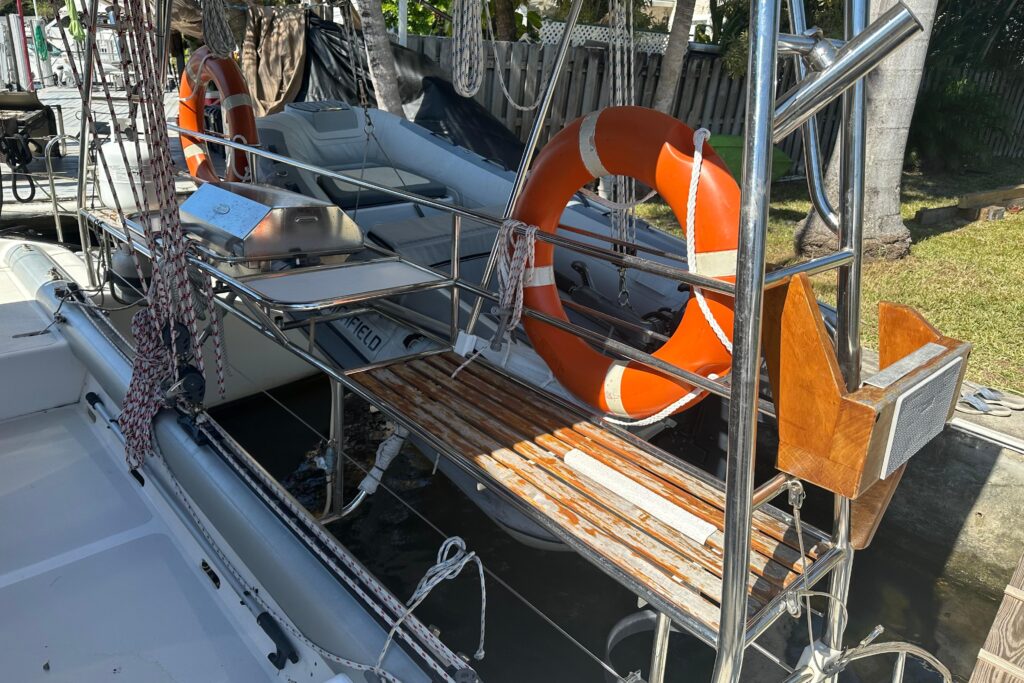 Boarding vessel from the stern, there are sugar scoop transoms with stairs leading to the cockpit on both sides. The port side has a stainless folding swim ladder and a deck shower. Stainless handrails are located in the staircases.