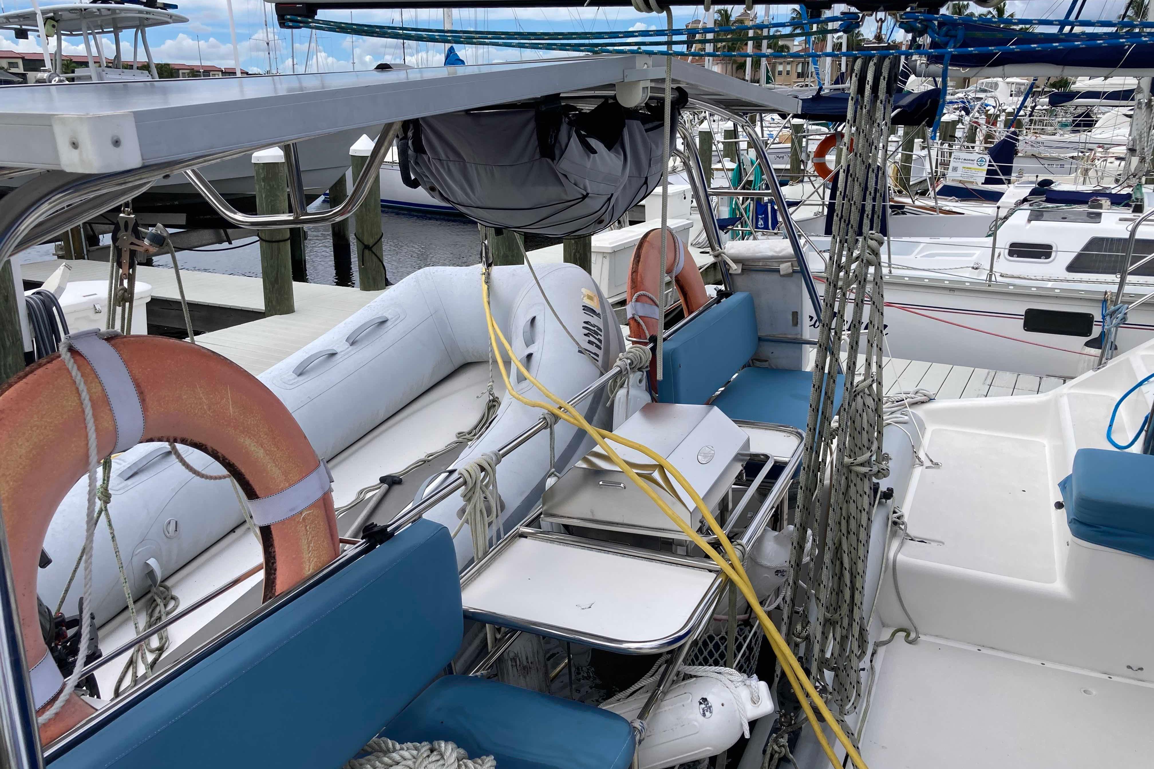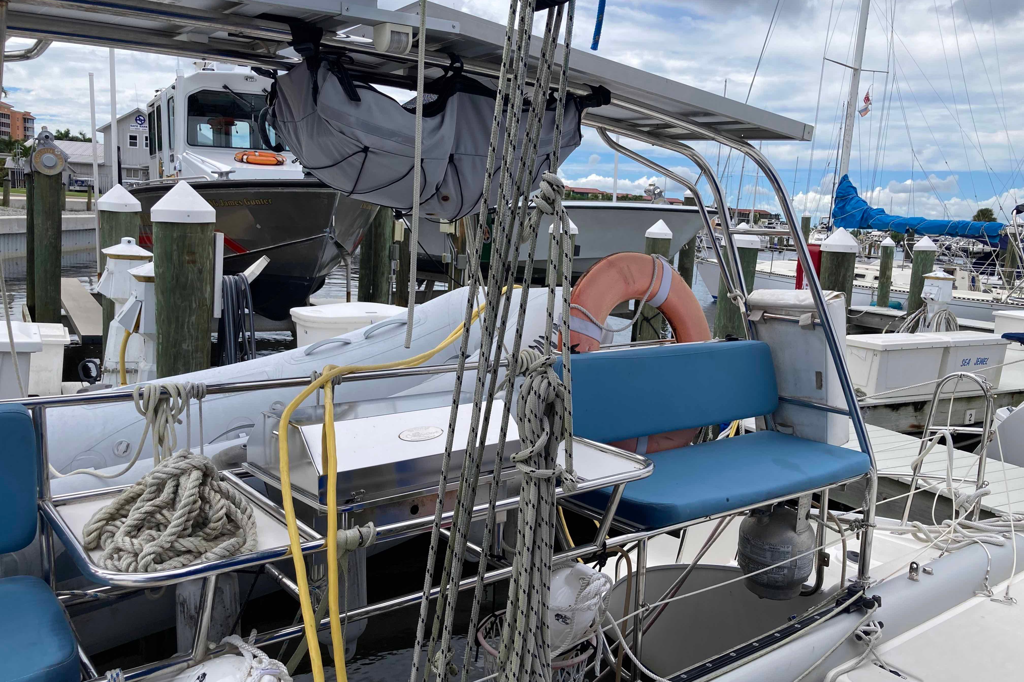 Stepping up to the cockpit, there is a stainless arch aft with solar panels located above, seats located port and stbd, and a central gas grill. Propane bottles are located underneath the seats, and a main sheet traveler is located at deck level. A tender davit system with blocks and tackle is located behind the arch. There is a stainless framed bimini top and extension panel that meets the aft arch located above. Port and stbd helms are located aft of the house with the stbd side having the engine controls and electronics. Seats are located at each helm with opening lids to access the outboard engines. All Halyards and sheets are lead aft to the cockpit for ease of sail handling, with two speed winches located on the cabin top, and winch handles in pockets at the helm seats. The cockpit is spacious due to no fixed table in this area.