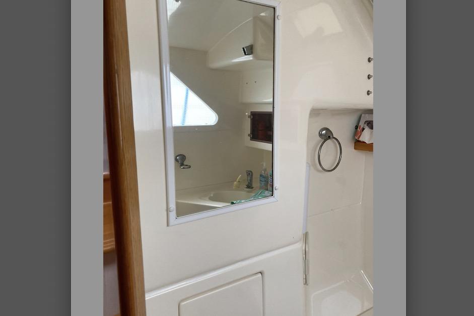 Moving down the port companionway, which also can be closed up, into the port side hull, at the top of the stairs aft is an opening cabinet with access to the steering gear, and lightning disconnect switches. Once below, all the way aft is the head with an electric toilet, handheld shower and sink basin.