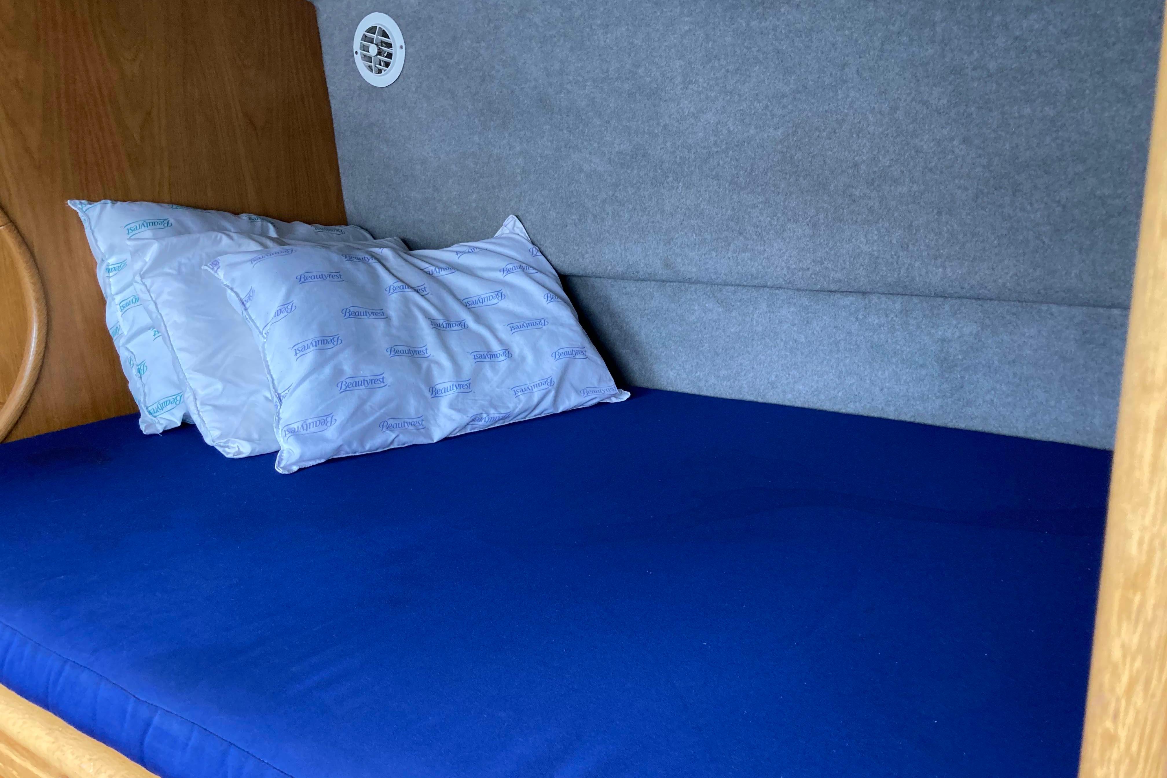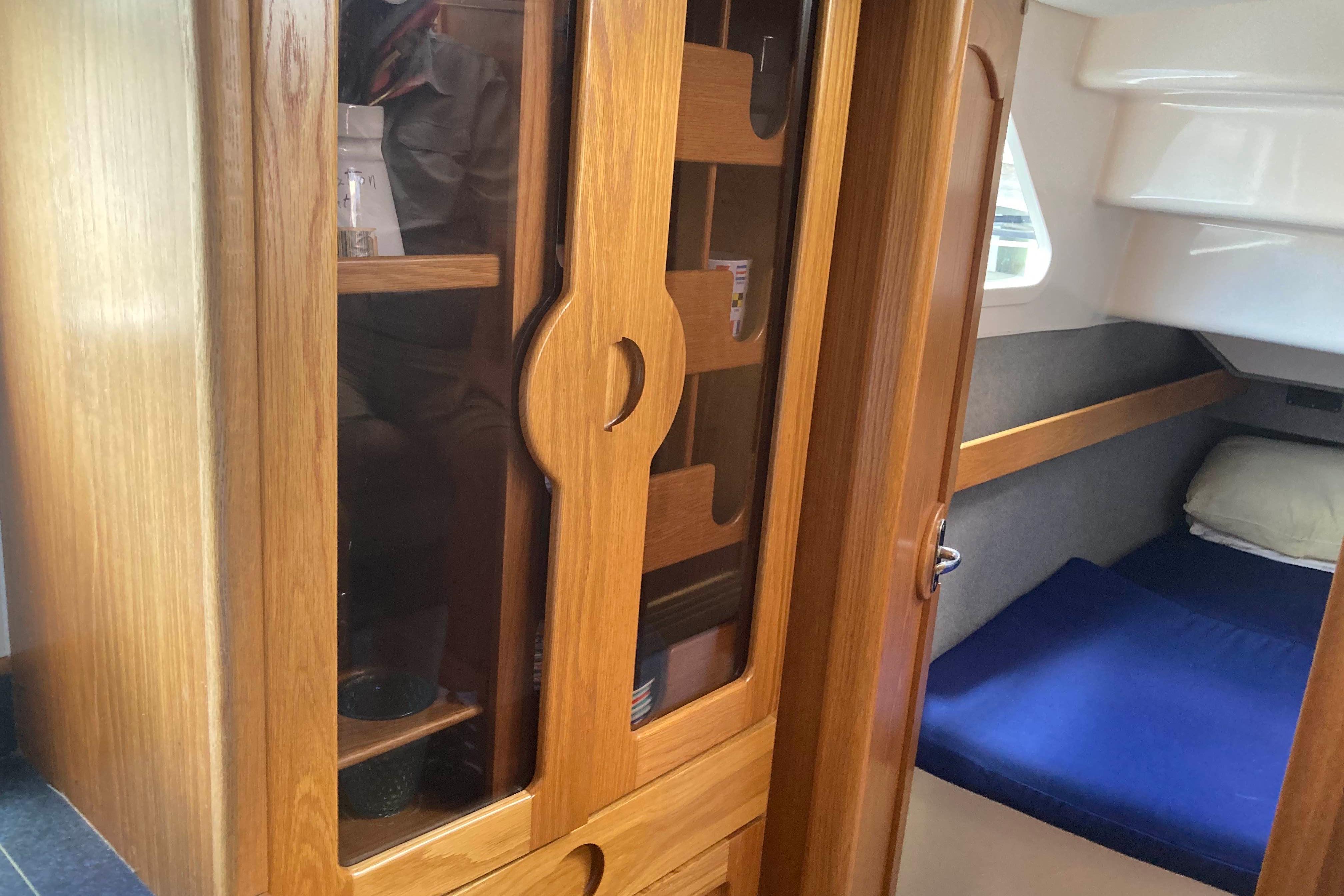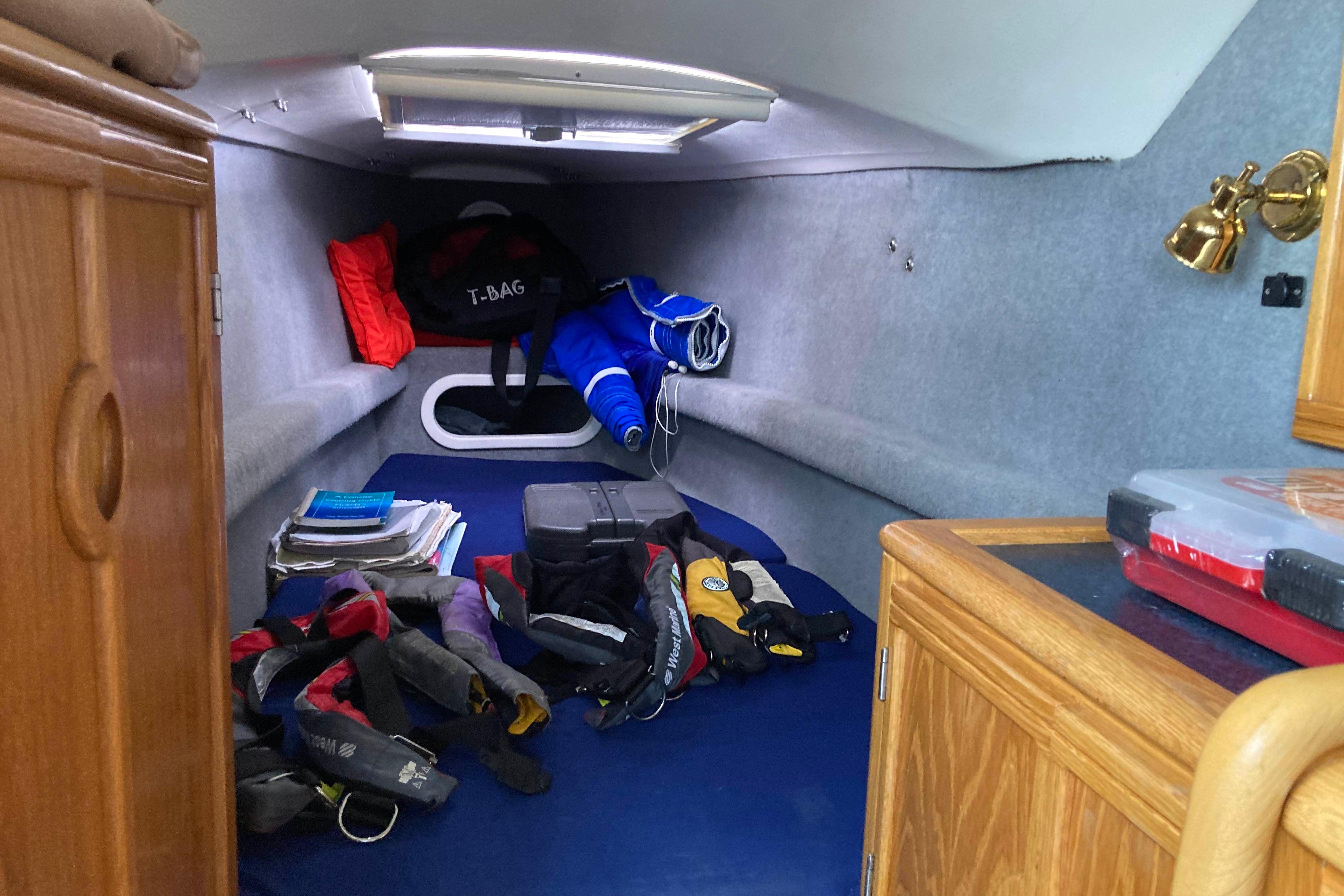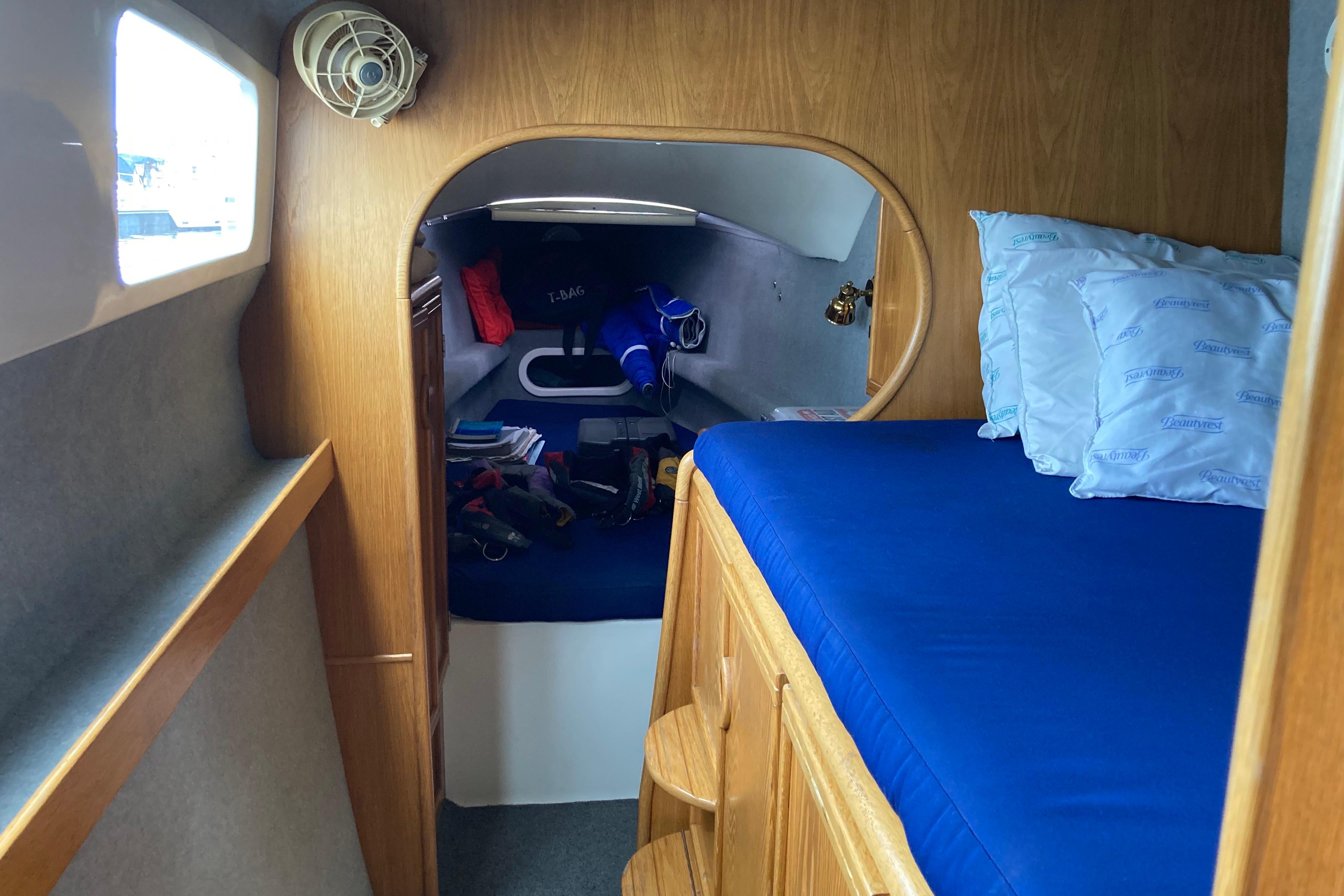 Forward of the Master is a single berth with an overhead opening hatch and inboard and outboard storage lockers.