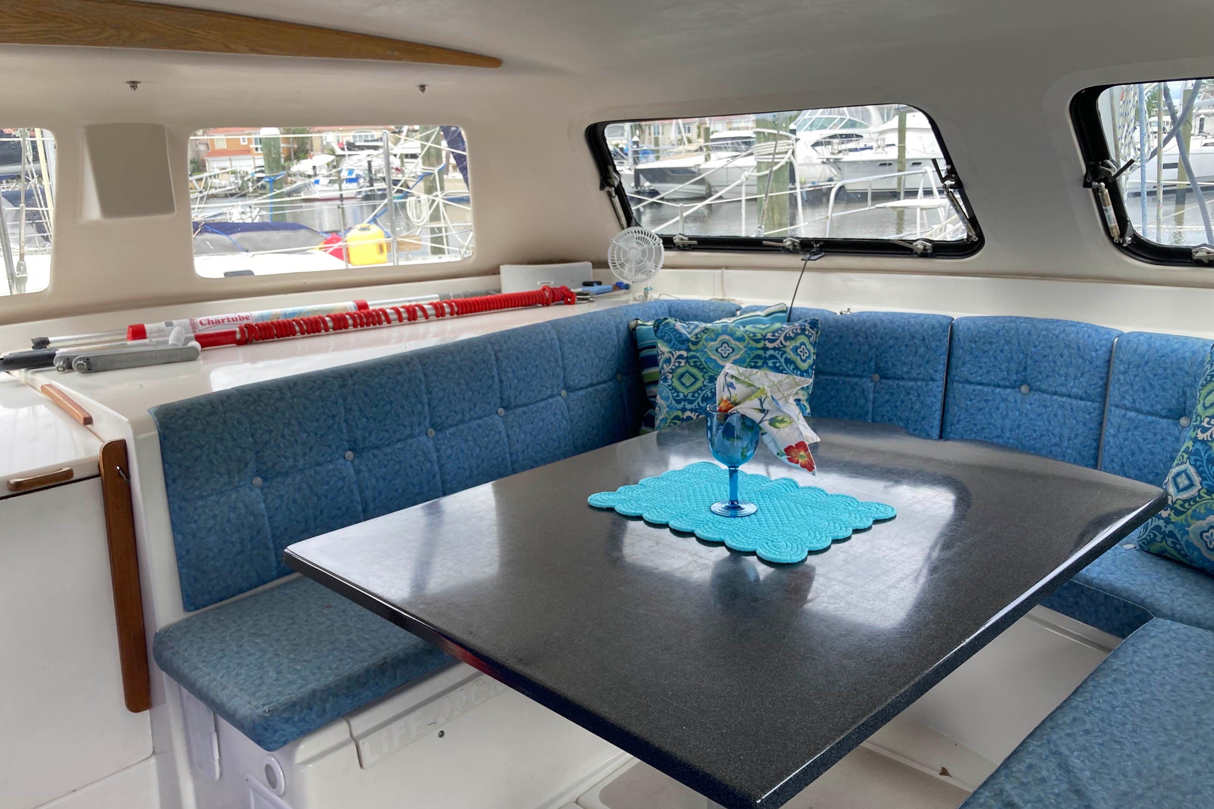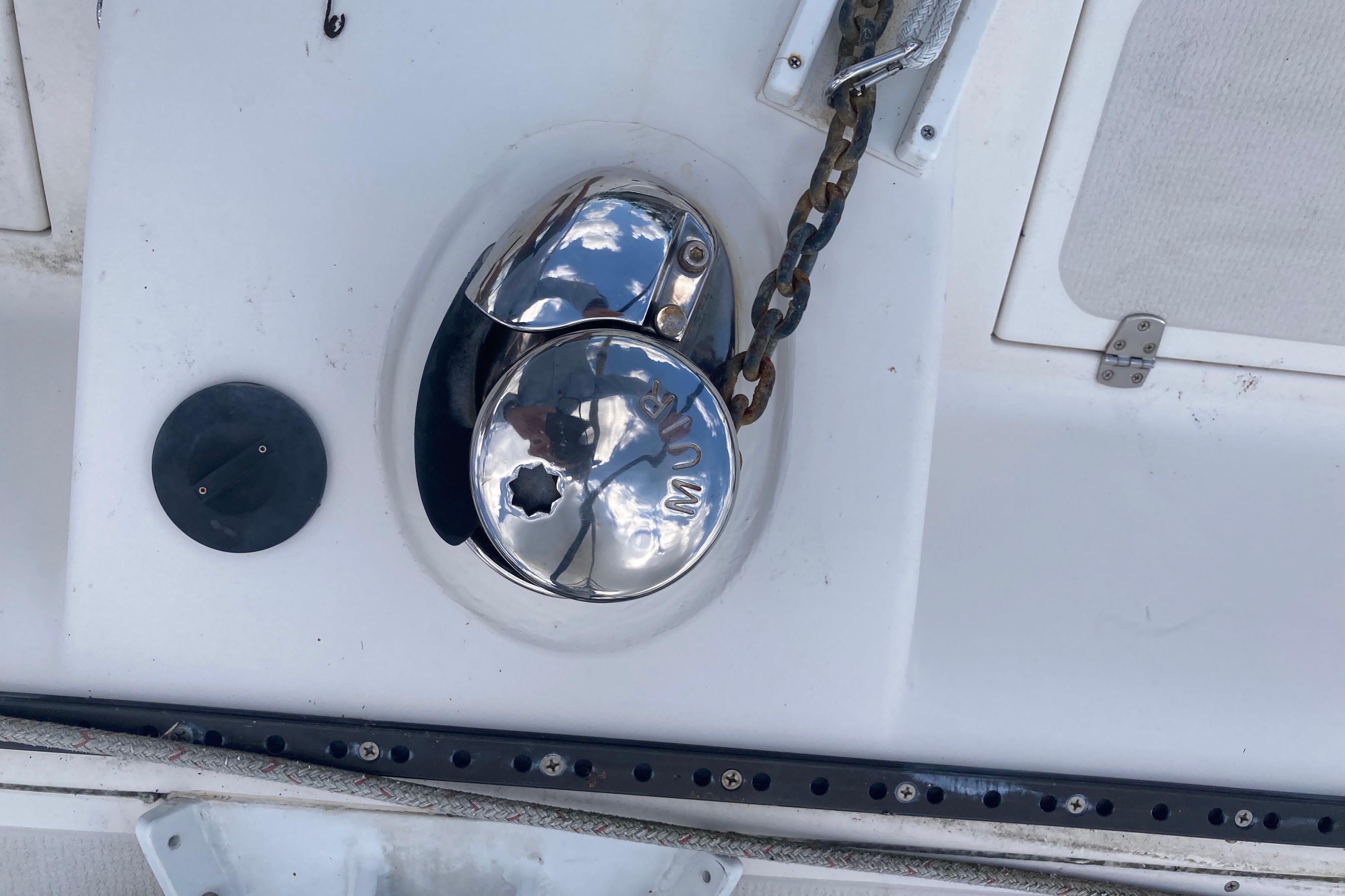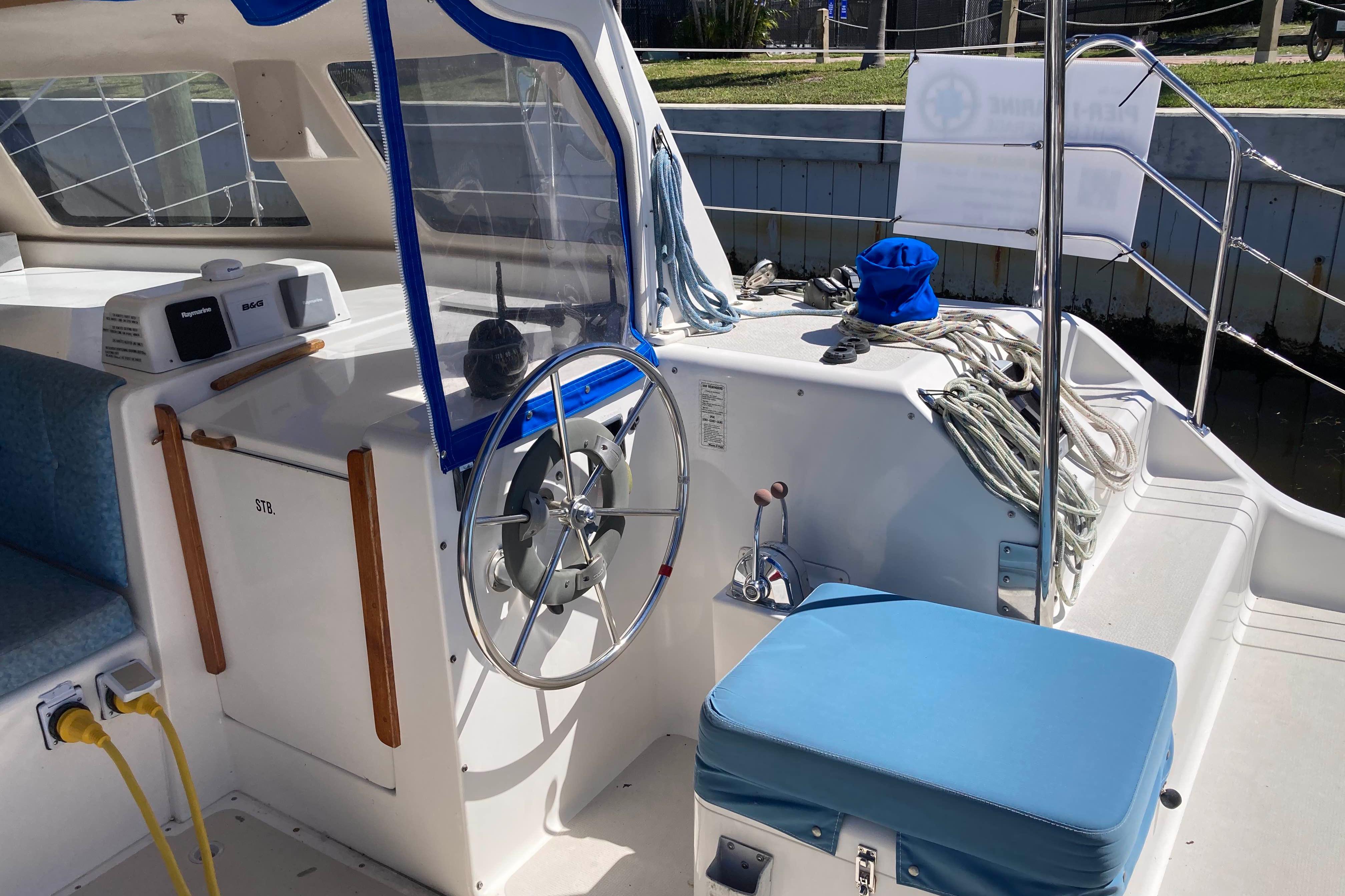 The Seawind Catamaran was designed specifically for ease of sailing and all-weather protection offering dual helms behind the bulkhead and canopy protection. All lines lead to the cockpit, there is 360 degree visibility, and a nice open air salon to the cockpit with great ventilation throughout the boat. The bright open galley is down in the starboard hull allowing for a bigger galley with more storage which allows for more space in the salon. The aft cockpit has no fixed table allowing for more usable deck space. She also offers a unique hide away drop-down bow ladder for beach boarding. Another unique feature is she was designed and constructed with wheel chair access in mind. Loading and unloading a wheel chair bound individual is done with the specialized rigging onboard this Seawind.