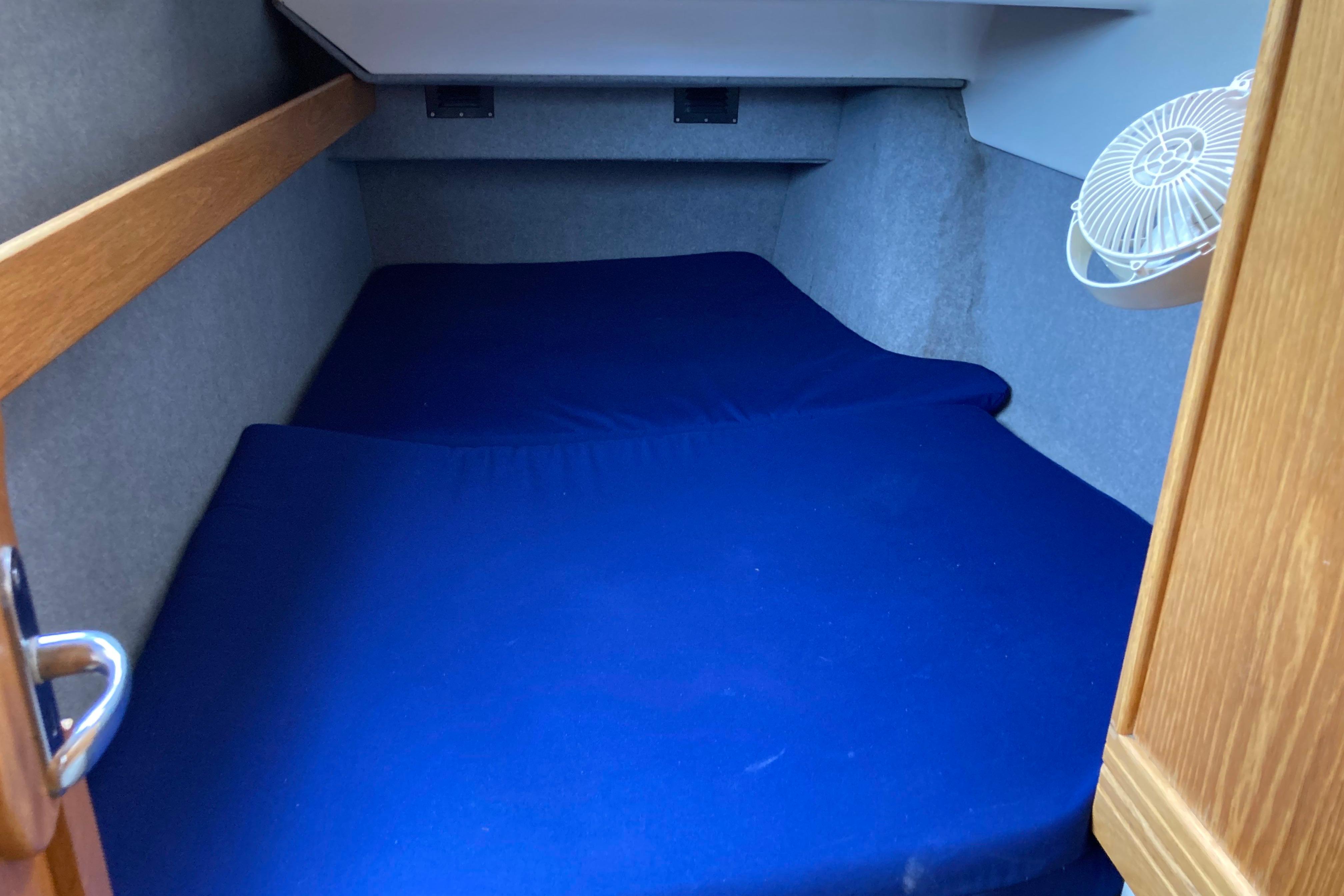 Moving forward the sole is Amtico. There is a hand-held fire extinguisher on the bulkhead and a door to close off the master cabin. Entering the master cabin on the inboard side is a raised double berth with storage under, a 12v LED reading light, and a fan on the bulkhead above the berth. Outboard there is a shelf along the hull.