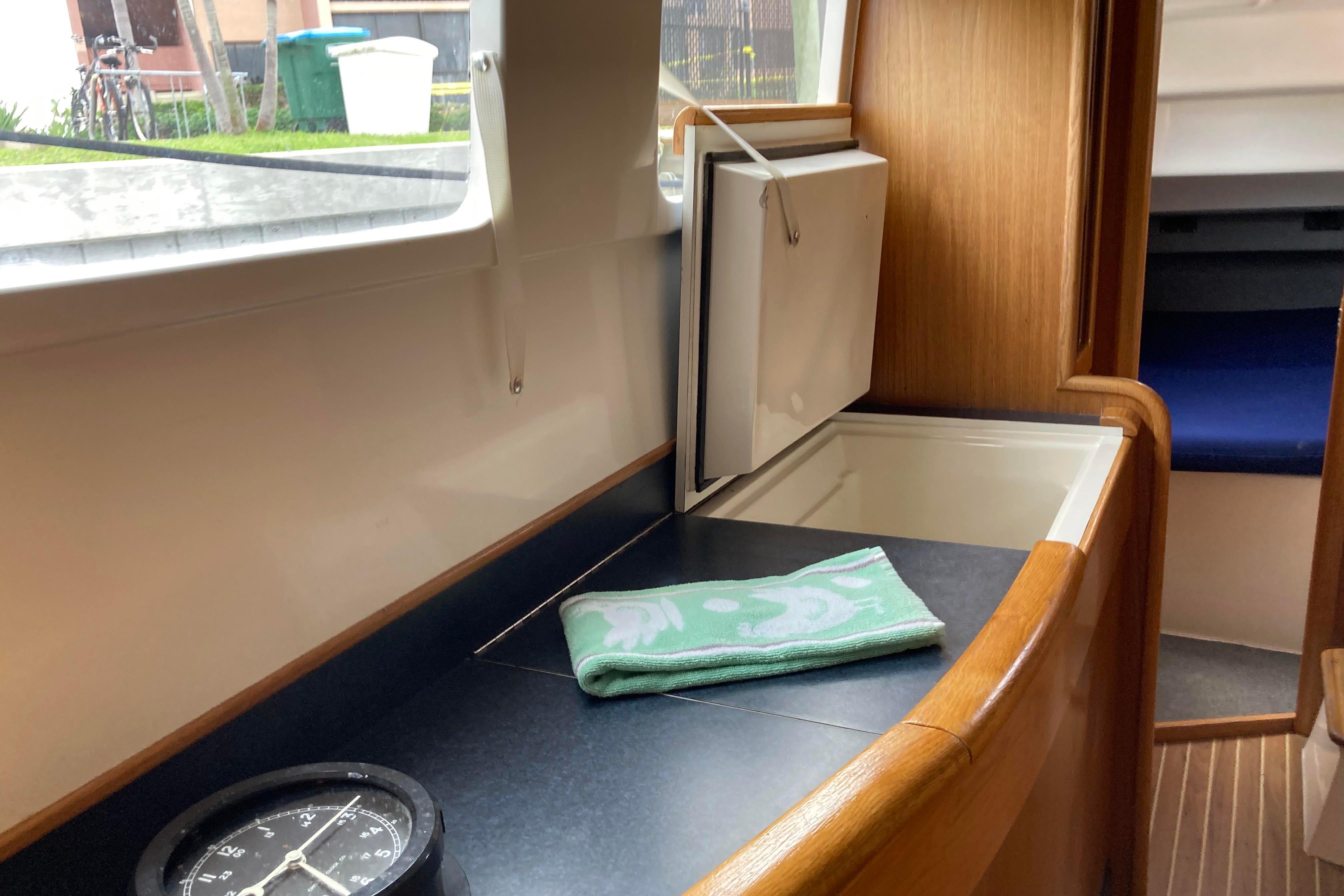 Moving into the open salon area, there is a U shaped dinette with upholstered cushions and a large dining table that will drop down and convert into a King size berth for extra guests. 12v LED lighting is located above and storage is located beneath the settees. Access to fuel tanks is located under the sole beneath the table. The overhead is fiberglass with varnished wood decor planks running fore and aft. The salon is surrounded 180 degrees by tinted glass windows which gives excellent visibility to both the helmsman and guests. There are two large opening windows centrally located forward in the salon offering great ventilation. There are opening lockers at the fwd end of the settee that contain the house and engine batteries with a selector switch to separate banks.