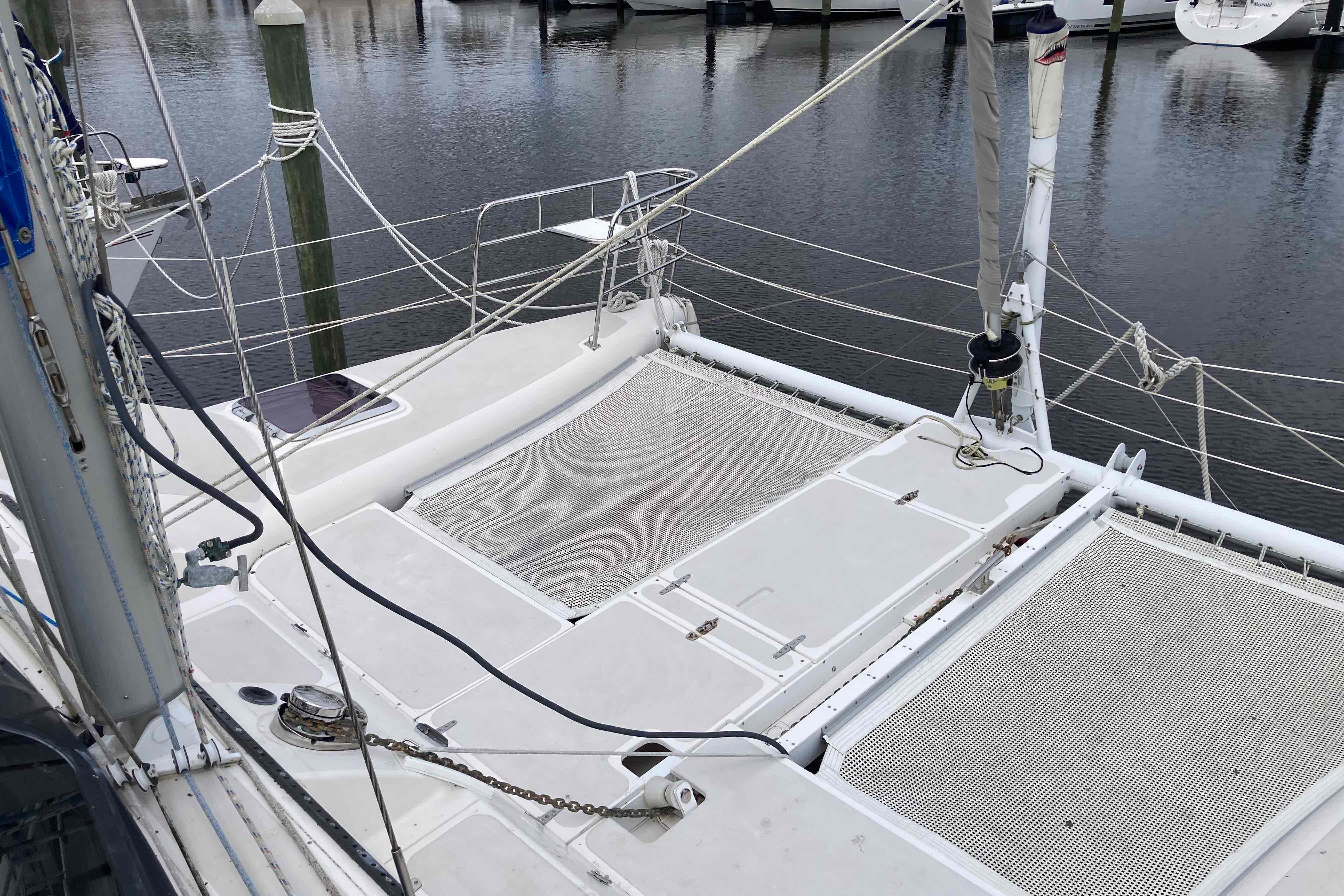 Moving up to the foredeck, decks and cabin top are white with molded nonskid. There are stainless hand rails across the cabin top and opening hatches over the cabins with sunbrella covers and bug screens. All the way forward there is a retractable folding bow sprit that carries the screecher sail when in use. Centrally located is the anchor chute and anchor, just aft is the roller furling headsail. Outboard there are stainless pulpits with mounted running lights and stainless framed starboard seats. Stainless stanchions with life lines and some railing areas surround all deck areas. Dual trampolines are located inboard of the hulls with a hatch between them giving access to a very convenient retractable ladder for beach boarding. A second hatch just aft houses a spare anchor. There is a windlass with foot control just forward of the mast with opening lockers on both sides for anchor chain and deck gear storage. The aluminum mast is deck stepped with a stack pack and lazy jacks for ease of sail handling. The cabin house has 180 degree tinted glass windows for excellent visibility.