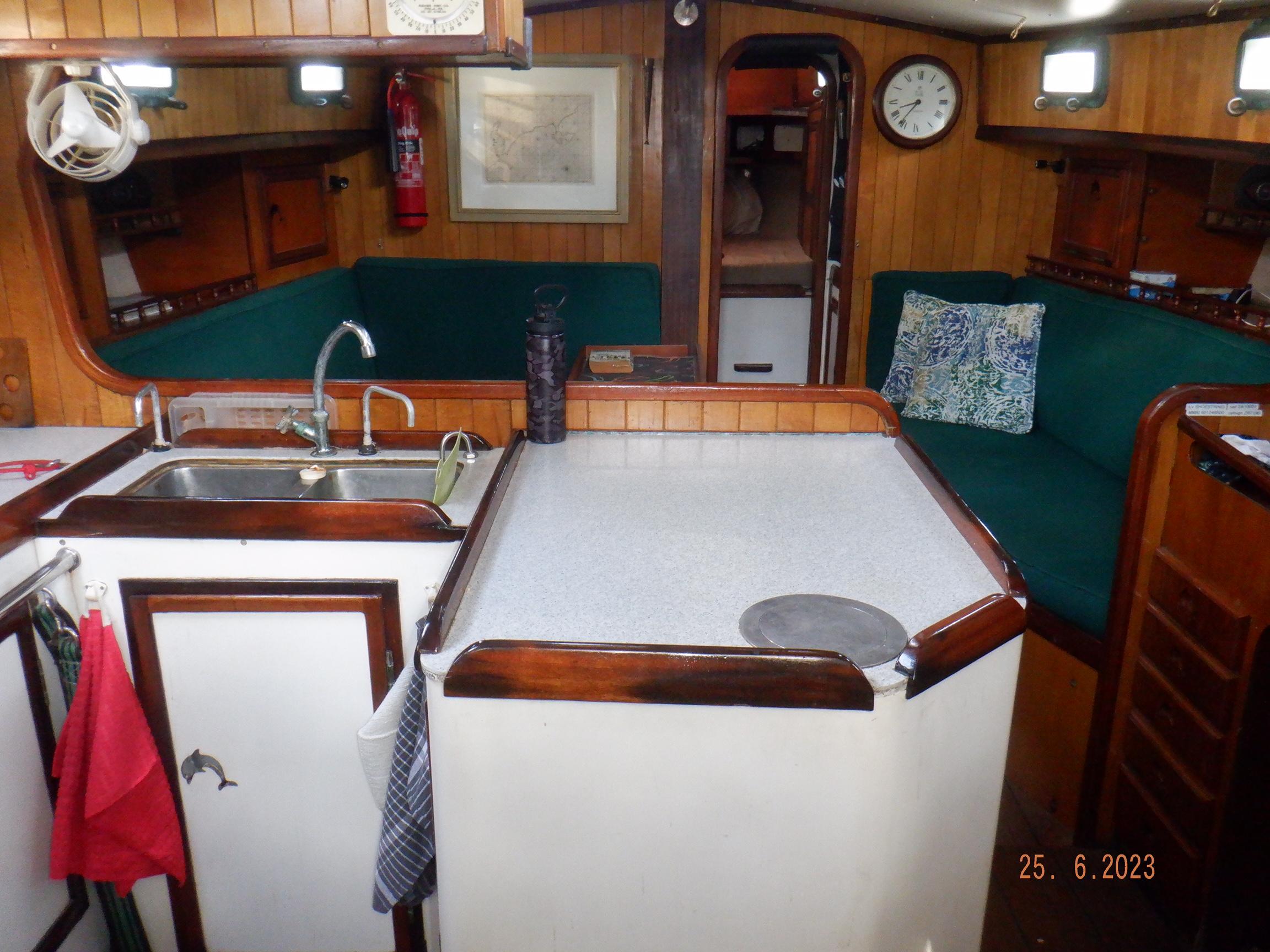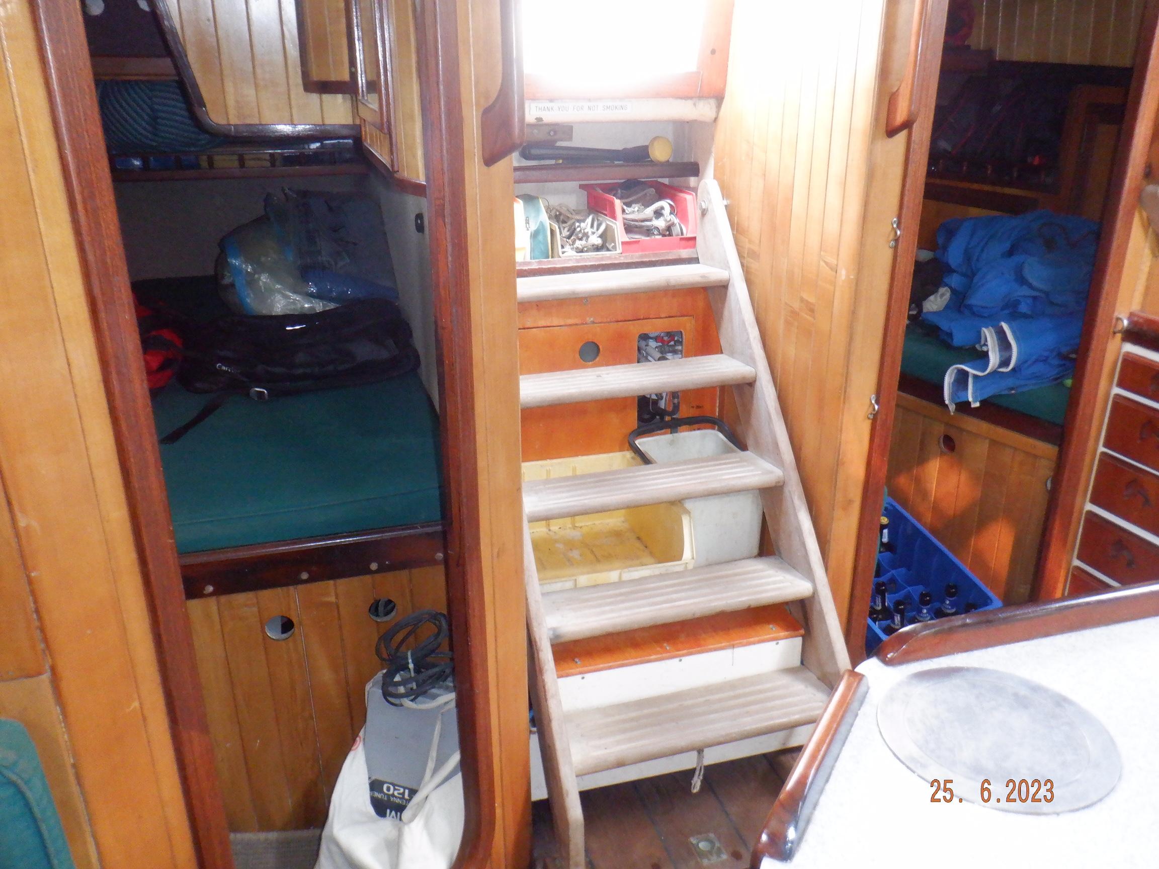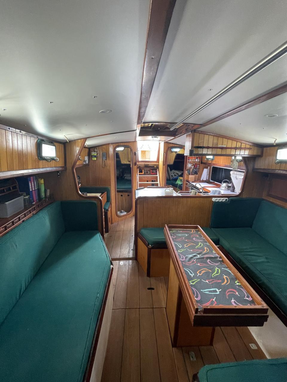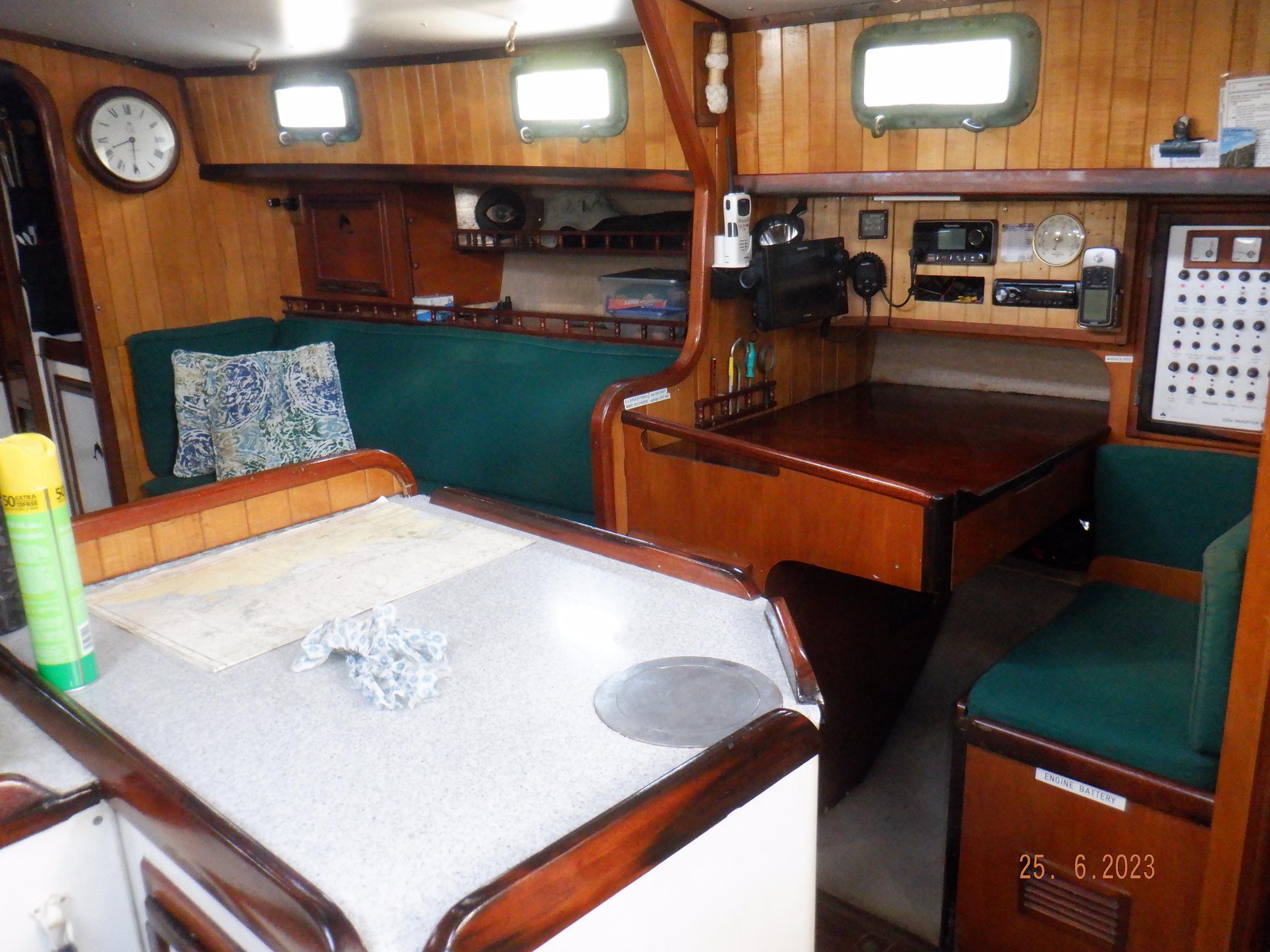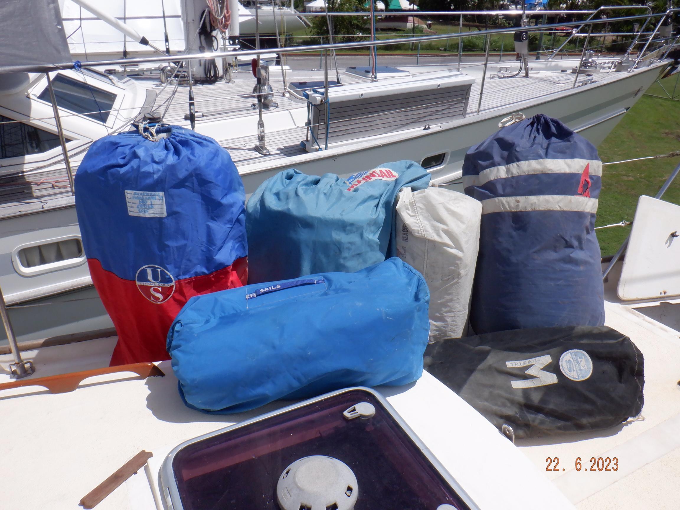 Equipment List Rig/Sails Sparcraft mast and boom, twin spreader. Cutter rigged with masthead staysail. Mast steps up to lower spreaders then a single pair at mast head to provide stability when working at masthead. Removable running backstays Twin backstays 3 forestays. Main forestay to bowsprit end with Profurl furler for genoa. Masthead. Inner forestay to bowsprit base for hank-on staysail. Masthead, making for a well secured mast. Highfield Quick release lever at base. Inner inner forestay to upper spreaders for storm jib. Also Highfield quick release lever at base. Bellamy kicker. Traveller 6 halyards with double purchace main halyard. Grannybar on starboard, with goody-bag designed for easy storage of winchhandle, sail ties, short lines etc. Spinaker pole, plus jockeypole. Ullman stackpack with adjustable lazyjacks. North fully battened mainsail with two reefs Ullman 110% genoa. North heavyduty #3 hank-on staysail, with 4 battens. (my favoured sail when on passage) Quantum reaching gennaker (good condition but colour has run) Storm trysail plus storm jib All sails in good working order. WINCHES IN COCKPIT Lewmar 56st primaries Lewmar 46st secondaries Portside cabintop:- Barlow 25 for toppinglift, reefing lines Starboard side cabintop:- Lewmar 46st for mainsheet, kicker, Cunningham ON MAST Port:- Lewmar 30st for staysail halyard, port spinaker halyard. Starboard :- Lewmar 30st for main halyard, genoa halyard, starboard spinaker halyard, stormjib halyard. Under boom:- for outhaul, plus can use for reefing lines, etc. ENGINE Yanmar 3JH40 common- rail diesel 40hp (hours currently 284hr June 2023) Installed late 2018 KM35 transmission, Vetus Bullflex coupling 30mm s/s propshaft. Fixed blade 17×13 propshaft TENDER/DINGHY ZODIAC 2.5m PVC inflatable (near the end of its life) Inflatable keel, grp over honeycomb floor panels MERCURY 5hp outboard with remote fueltank Paddles and pump, anchor and rode ELECTRONICS (all installed 2016/7) AT NAVSTATION Raymarine eS97 chartplotter/MFD Raymarine Ray60 vhf radio with DSC AIS 650 transceiver Raymarine ACU200 autopilot control (Robertson HLD2000 Mk2L hydraulic ram at rudder quadrant) Garmin GPSmap76 handheld (old & never used, but working. Uniden Atlantis250 handheld VHF (old and battery failing) IN COCKPIT Raymarine eS75 chartplotter/MFD Raymarine P70 autopilot control Raymarine i60 wind instrument Raymarine i70 multipurpose instrument Raymic VHF handheld plus active speaker ON MAST Raymarine Quantum radar ELECTRICS Eclectic Energy D400 wind generator with Xantrex charge/load controller 300w solar panel with Victron MPPT 100/15 controller Xantrex battery monitor 2 off Lifeline AGM GPL-8DL 255ah house batteries 1off xStream Power MF115D31R 85ah cranking amps 830amps engine start battery. Victron blue-smart 30a battery charger Victron Phoenix 12/800 inverter Four electric bilge-pumps in bilge, for quick clearance of water. One extra large manual bilgepump in saloon area. WINDLASS/GROUNDTACKLE Maxwell RC10/10 1200w 12v vertical axis, with capstan. Maxwell Autoachor 710/6 cordless remote control. Secondary Up/Down control box out of forecabin(thru hatch). Keeps switching equipment away from damp environments except when in use. VULCAN 20kg galvanized anchor FOB HP 20kg galvanized backup anchor CHAIN/RODE:- (connected) 70m of 10mm galvanized chain (backup) 30m of 10mm galvanised chain plus 50m of rode. Stored underforepeak bunk in separate locker, with tubular feed up into anchor locker on deck, connected permanently for quick access. ON DECK 2 dorades ahead of traveller feeding fresh air to galley and starboard aft cabin. Teak mounting brackets for boathook/paddles/oars/battens/etc. Sampsonpost with s/steel plate atop, useful when cutting/drilling etc. Ample cleats, fairleads, clutches etc. Pressurised seawater deckwash outlet on portside deck. Various fenders, docklines. 2x 25liter diesel jugs. 1x 10liter petrol jug. GALLEY Force 10 2burner stove with oven/grille. Adjustable Potholder brackets, Gimballed. Replaced Jan 2020. Ample pots, pans, baking/roasting trays, pressure cooker, s/steel kettle. Full range of chefs equipment, knives, ladles, tongs, graters, etc etc etc. Six-piece cutlery (s/steel) crockery (melaware), mugs and glasses, with spares of certain items. Ample airtight containers for in-use ingredients, plus food storage. Double sink, fed by pressurised cold fresh water, footpumped drinking water, and footpumped seawater. HEADS Vaillant gas waterheater to handbasin, never used but tested from time to time. JABSCO compact electric toilet Pressurised hot/cold water to handbasin. Handshower incorporated into tap unit. SAFETY EQUIPMENT Viking 4man cassette liferaft, mounted in quick release bracket on deck. MOB horseshoe life-ring with danbouy. 4 x PFDs 6 x life jackets Waterproof canister with flares, smoke signals, mirror, etc. 2 off 2.5kg drypowder fire extinguishers. 1 off 2.0kg CO2 fire extinguisher. Rigging Shears (1/2 inch/ 12.7mm) capacity, brand new in box. Ullman sail repair kit MISCELLANEOUS Nikon 12×50 binoculars 2x goggles, 2x snorkels, 2x flippers Spareair 15min scuba tank 1 x scuba bottle (almost full, used to fill Spareair. 2 x sleeping bags Fitted sheets for all bunks, pillows and pillowslips 8 x scatter cushions for saloon Various bath towels, hand towels, beach towels, kitchen dish towels and hand towels. Gas braai/barbecue mounted on pushpit. Coldwater handshower in cockpit. Bosuns chair Rope climbing kit for solo mast climbing 12v air compressor 2 x boathooks Full set of handtools (all mounted) to carry out any repairs/service. Makita 18v cordless anglegrinder Makita 18v cordless 13mm drill Makita 18v cordless 10mm angledrill Makita 18v cordless orbital sander Makita 18v cordless jigsaw 220v/18v Makita charger 12v/18v Makita charger. 2off Makita 18v 5ahr batteries 1off Makita 18v 1.5ahr battery Makita18v cordless airblower Makita 18v cordless hand vacuum. Bench vice attached to workbench. Various spare belts, filters, nuts