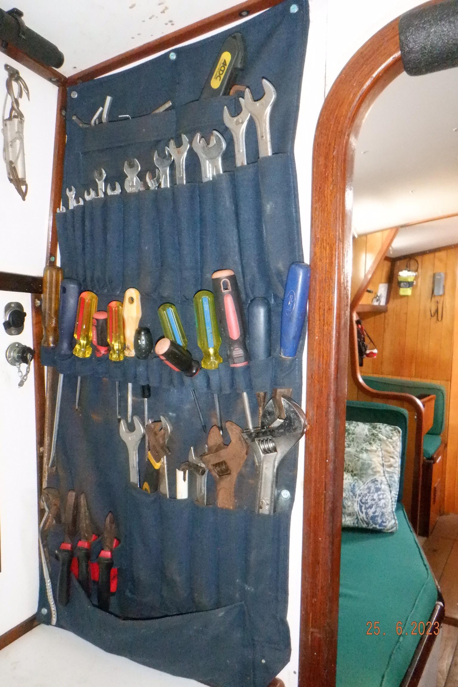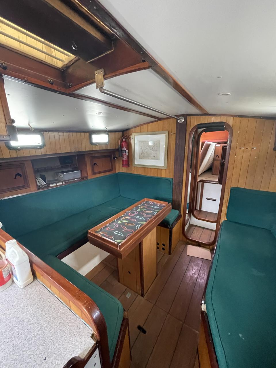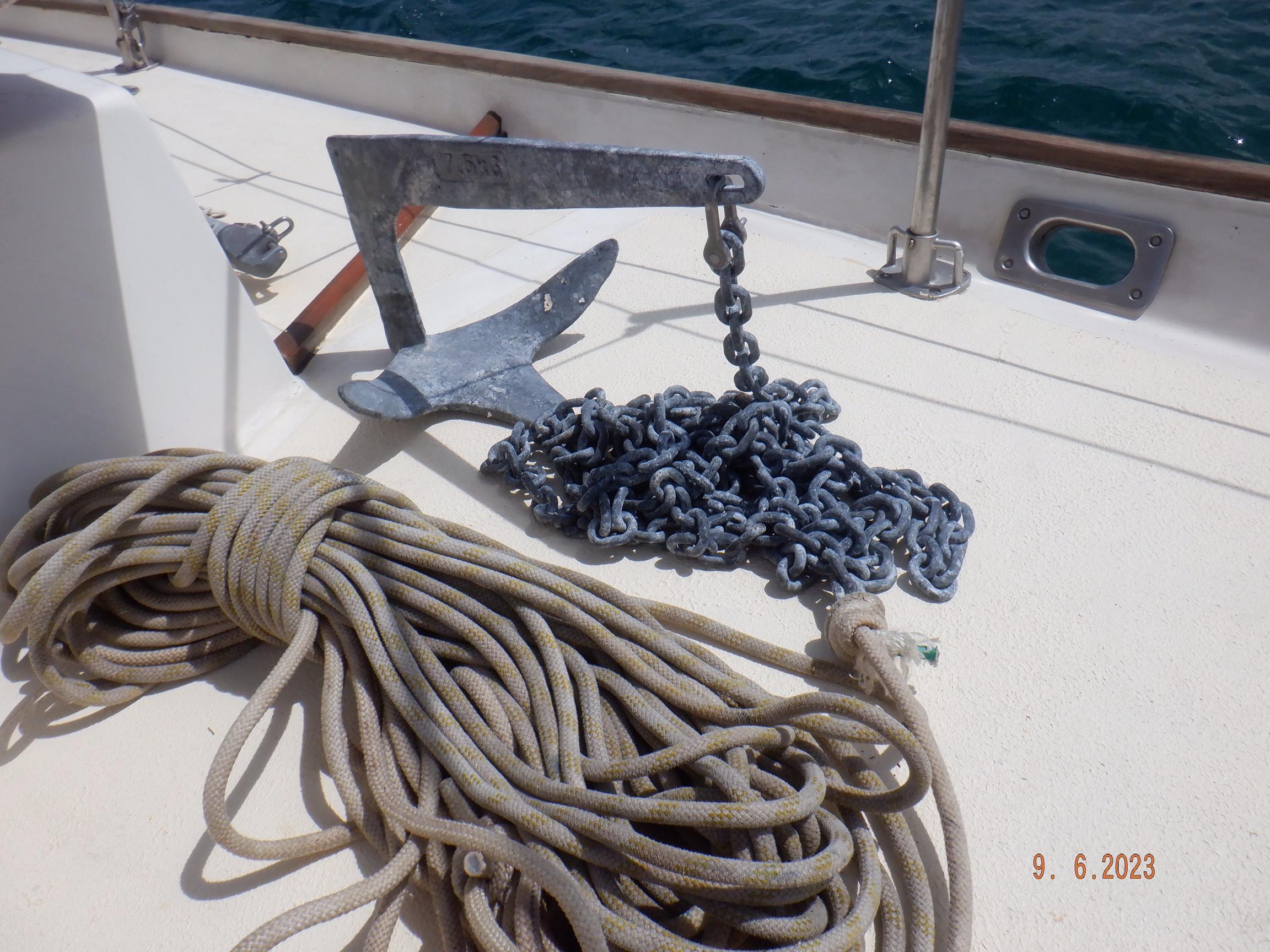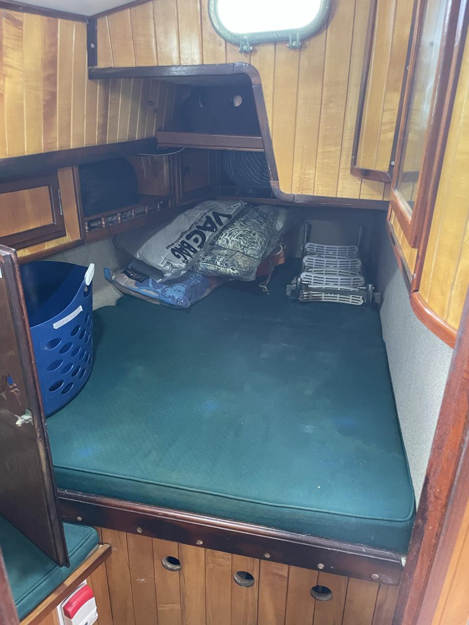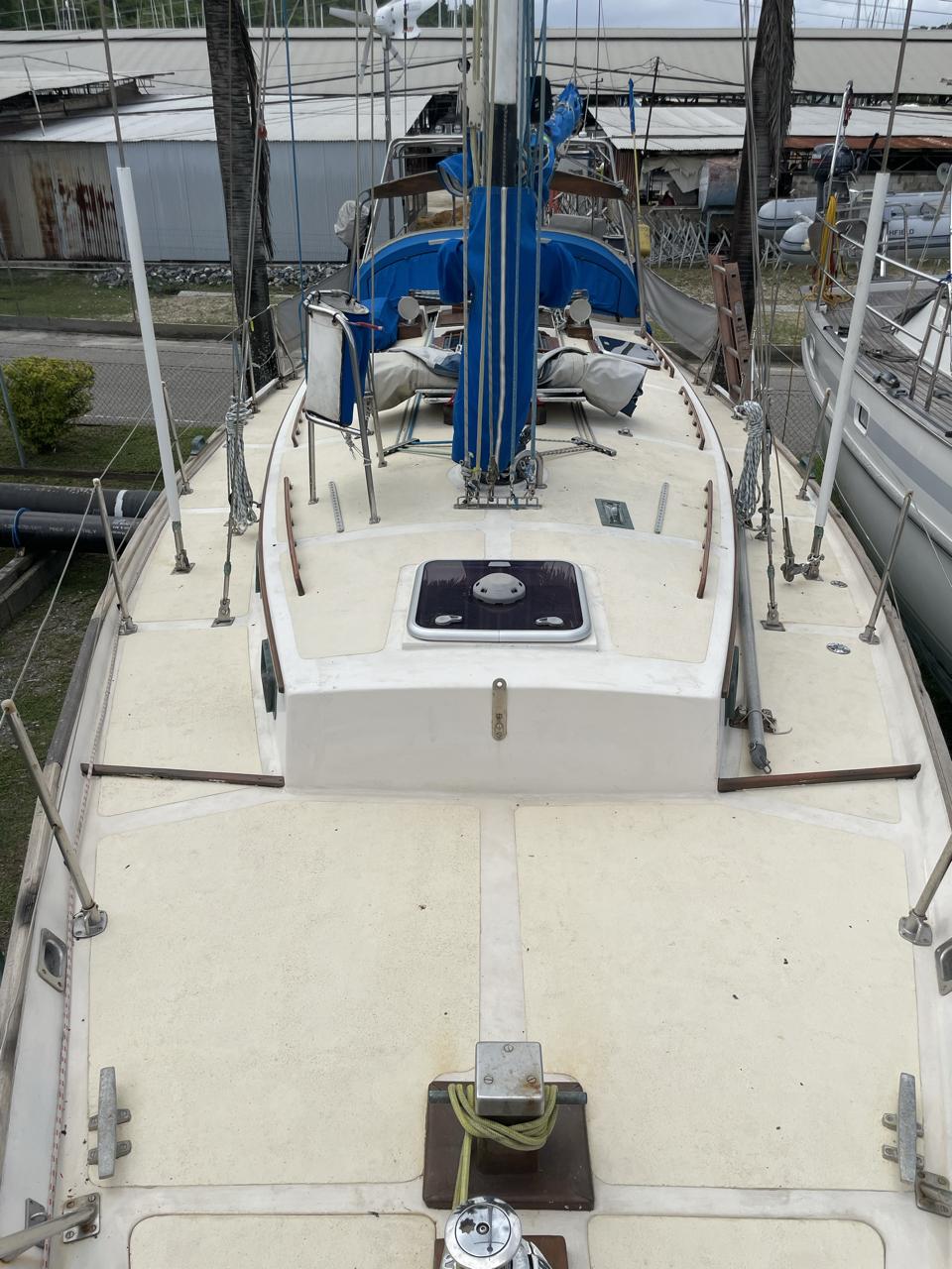 Equipment List Rig/Sails Sparcraft mast and boom, twin spreader. Cutter rigged with masthead staysail. Mast steps up to lower spreaders then a single pair at mast head to provide stability when working at masthead. Removable running backstays Twin backstays 3 forestays. Main forestay to bowsprit end with Profurl furler for genoa. Masthead. Inner forestay to bowsprit base for hank-on staysail. Masthead, making for a well secured mast. Highfield Quick release lever at base. Inner inner forestay to upper spreaders for storm jib. Also Highfield quick release lever at base. Bellamy kicker. Traveller 6 halyards with double purchace main halyard. Grannybar on starboard, with goody-bag designed for easy storage of winchhandle, sail ties, short lines etc. Spinaker pole, plus jockeypole. Ullman stackpack with adjustable lazyjacks. North fully battened mainsail with two reefs Ullman 110% genoa. North heavyduty #3 hank-on staysail, with 4 battens. (my favoured sail when on passage) Quantum reaching gennaker (good condition but colour has run) Storm trysail plus storm jib All sails in good working order. WINCHES IN COCKPIT Lewmar 56st primaries Lewmar 46st secondaries Portside cabintop:- Barlow 25 for toppinglift, reefing lines Starboard side cabintop:- Lewmar 46st for mainsheet, kicker, Cunningham ON MAST Port:- Lewmar 30st for staysail halyard, port spinaker halyard. Starboard :- Lewmar 30st for main halyard, genoa halyard, starboard spinaker halyard, stormjib halyard. Under boom:- for outhaul, plus can use for reefing lines, etc. ENGINE Yanmar 3JH40 common- rail diesel 40hp (hours currently 284hr June 2023) Installed late 2018 KM35 transmission, Vetus Bullflex coupling 30mm s/s propshaft. Fixed blade 17×13 propshaft TENDER/DINGHY ZODIAC 2.5m PVC inflatable (near the end of its life) Inflatable keel, grp over honeycomb floor panels MERCURY 5hp outboard with remote fueltank Paddles and pump, anchor and rode ELECTRONICS (all installed 2016/7) AT NAVSTATION Raymarine eS97 chartplotter/MFD Raymarine Ray60 vhf radio with DSC AIS 650 transceiver Raymarine ACU200 autopilot control (Robertson HLD2000 Mk2L hydraulic ram at rudder quadrant) Garmin GPSmap76 handheld (old & never used, but working. Uniden Atlantis250 handheld VHF (old and battery failing) IN COCKPIT Raymarine eS75 chartplotter/MFD Raymarine P70 autopilot control Raymarine i60 wind instrument Raymarine i70 multipurpose instrument Raymic VHF handheld plus active speaker ON MAST Raymarine Quantum radar ELECTRICS Eclectic Energy D400 wind generator with Xantrex charge/load controller 300w solar panel with Victron MPPT 100/15 controller Xantrex battery monitor 2 off Lifeline AGM GPL-8DL 255ah house batteries 1off xStream Power MF115D31R 85ah cranking amps 830amps engine start battery. Victron blue-smart 30a battery charger Victron Phoenix 12/800 inverter Four electric bilge-pumps in bilge, for quick clearance of water. One extra large manual bilgepump in saloon area. WINDLASS/GROUNDTACKLE Maxwell RC10/10 1200w 12v vertical axis, with capstan. Maxwell Autoachor 710/6 cordless remote control. Secondary Up/Down control box out of forecabin(thru hatch). Keeps switching equipment away from damp environments except when in use. VULCAN 20kg galvanized anchor FOB HP 20kg galvanized backup anchor CHAIN/RODE:- (connected) 70m of 10mm galvanized chain (backup) 30m of 10mm galvanised chain plus 50m of rode. Stored underforepeak bunk in separate locker, with tubular feed up into anchor locker on deck, connected permanently for quick access. ON DECK 2 dorades ahead of traveller feeding fresh air to galley and starboard aft cabin. Teak mounting brackets for boathook/paddles/oars/battens/etc. Sampsonpost with s/steel plate atop, useful when cutting/drilling etc. Ample cleats, fairleads, clutches etc. Pressurised seawater deckwash outlet on portside deck. Various fenders, docklines. 2x 25liter diesel jugs. 1x 10liter petrol jug. GALLEY Force 10 2burner stove with oven/grille. Adjustable Potholder brackets, Gimballed. Replaced Jan 2020. Ample pots, pans, baking/roasting trays, pressure cooker, s/steel kettle. Full range of chefs equipment, knives, ladles, tongs, graters, etc etc etc. Six-piece cutlery (s/steel) crockery (melaware), mugs and glasses, with spares of certain items. Ample airtight containers for in-use ingredients, plus food storage. Double sink, fed by pressurised cold fresh water, footpumped drinking water, and footpumped seawater. HEADS Vaillant gas waterheater to handbasin, never used but tested from time to time. JABSCO compact electric toilet Pressurised hot/cold water to handbasin. Handshower incorporated into tap unit. SAFETY EQUIPMENT Viking 4man cassette liferaft, mounted in quick release bracket on deck. MOB horseshoe life-ring with danbouy. 4 x PFDs 6 x life jackets Waterproof canister with flares, smoke signals, mirror, etc. 2 off 2.5kg drypowder fire extinguishers. 1 off 2.0kg CO2 fire extinguisher. Rigging Shears (1/2 inch/ 12.7mm) capacity, brand new in box. Ullman sail repair kit MISCELLANEOUS Nikon 12×50 binoculars 2x goggles, 2x snorkels, 2x flippers Spareair 15min scuba tank 1 x scuba bottle (almost full, used to fill Spareair. 2 x sleeping bags Fitted sheets for all bunks, pillows and pillowslips 8 x scatter cushions for saloon Various bath towels, hand towels, beach towels, kitchen dish towels and hand towels. Gas braai/barbecue mounted on pushpit. Coldwater handshower in cockpit. Bosuns chair Rope climbing kit for solo mast climbing 12v air compressor 2 x boathooks Full set of handtools (all mounted) to carry out any repairs/service. Makita 18v cordless anglegrinder Makita 18v cordless 13mm drill Makita 18v cordless 10mm angledrill Makita 18v cordless orbital sander Makita 18v cordless jigsaw 220v/18v Makita charger 12v/18v Makita charger. 2off Makita 18v 5ahr batteries 1off Makita 18v 1.5ahr battery Makita18v cordless airblower Makita 18v cordless hand vacuum. Bench vice attached to workbench. Various spare belts, filters, nuts
