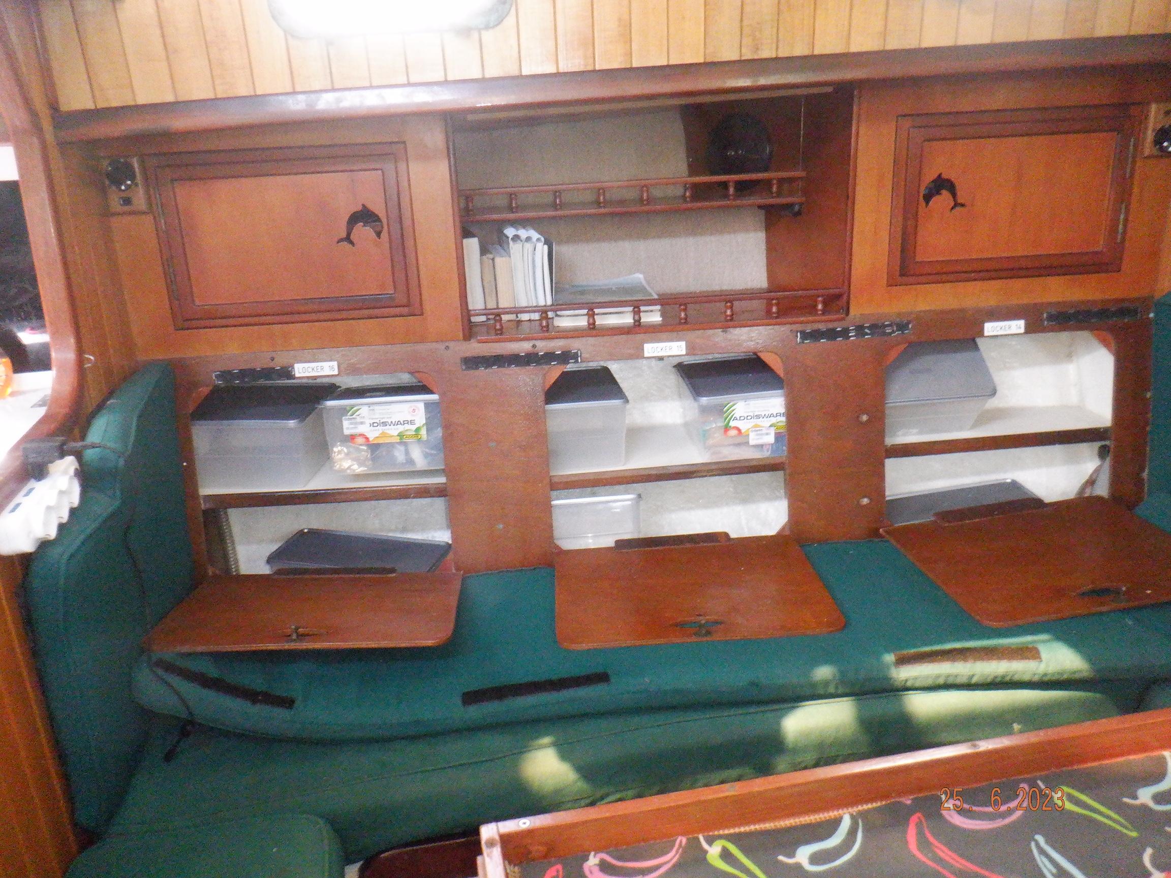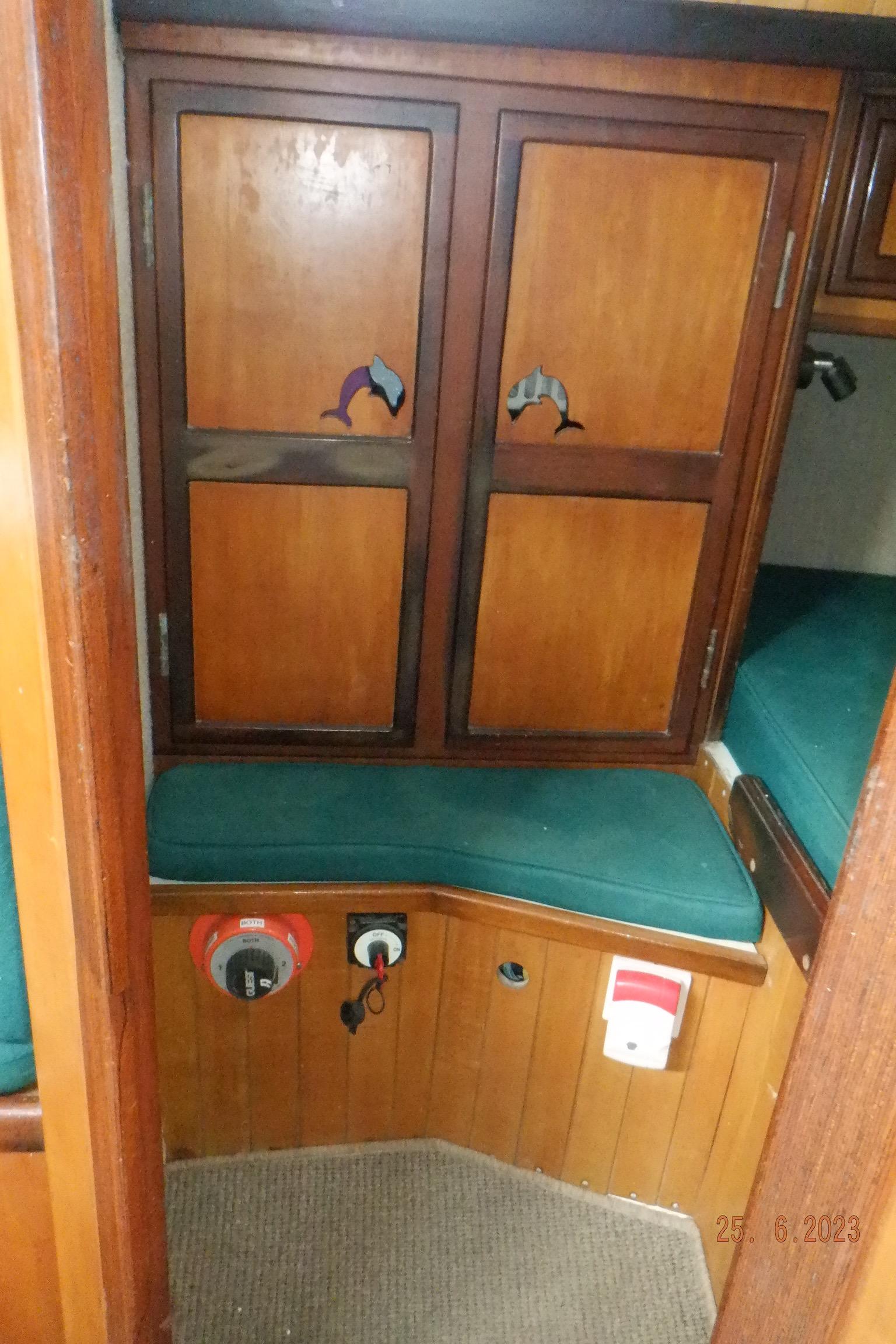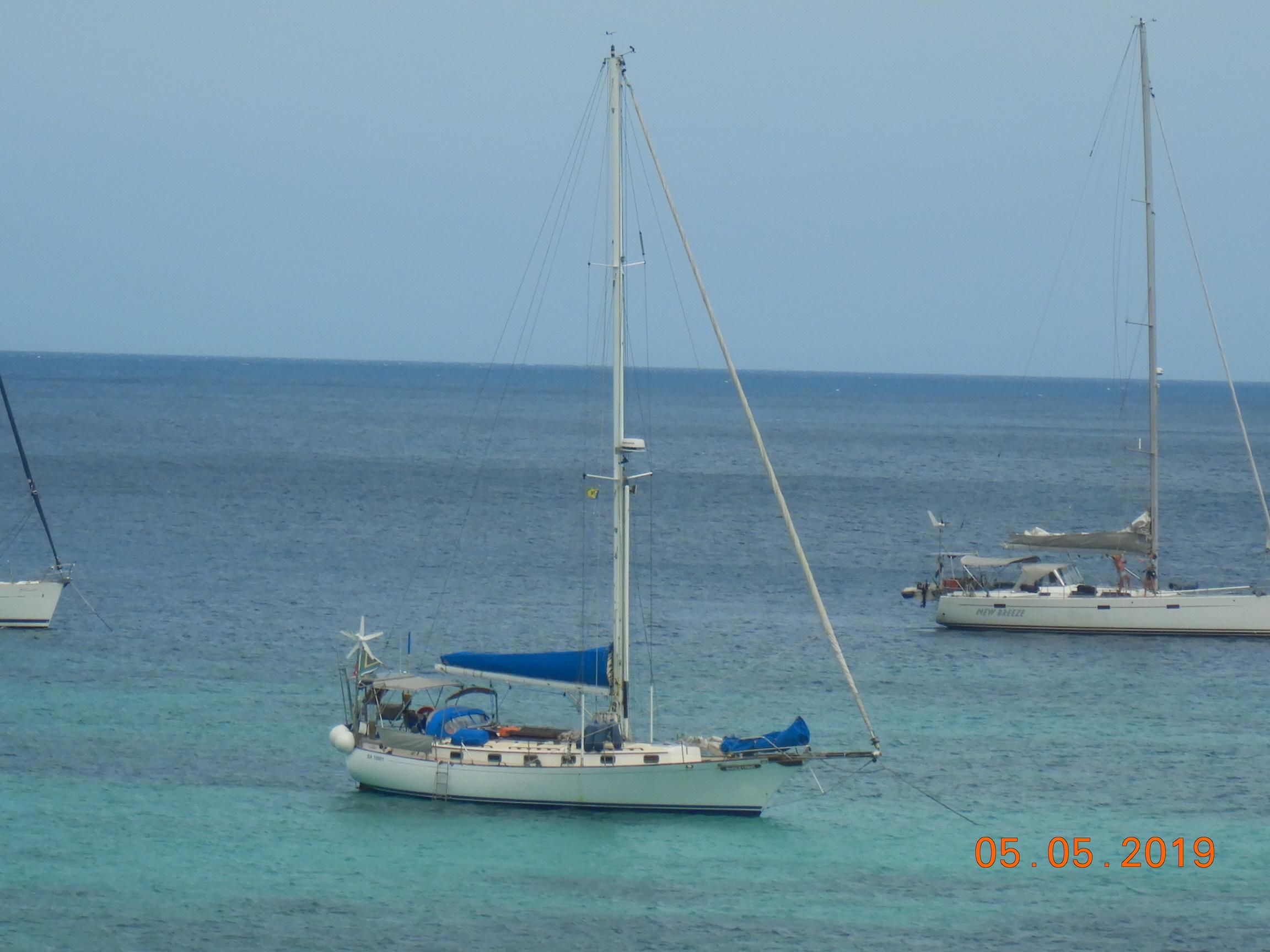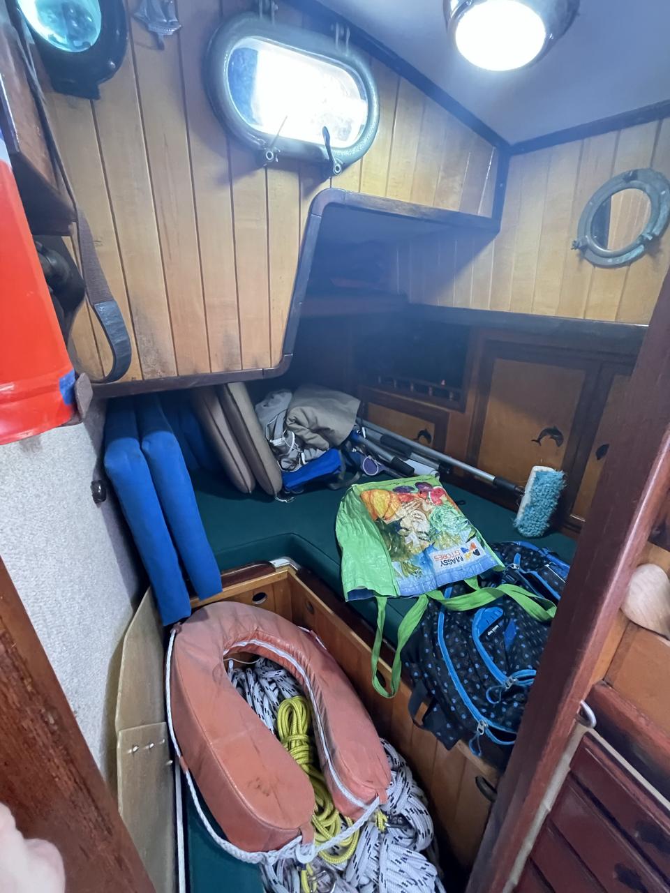 Equipment List Rig/Sails Sparcraft mast and boom, twin spreader. Cutter rigged with masthead staysail. Mast steps up to lower spreaders then a single pair at mast head to provide stability when working at masthead. Removable running backstays Twin backstays 3 forestays. Main forestay to bowsprit end with Profurl furler for genoa. Masthead. Inner forestay to bowsprit base for hank-on staysail. Masthead, making for a well secured mast. Highfield Quick release lever at base. Inner inner forestay to upper spreaders for storm jib. Also Highfield quick release lever at base. Bellamy kicker. Traveller 6 halyards with double purchace main halyard. Grannybar on starboard, with goody-bag designed for easy storage of winchhandle, sail ties, short lines etc. Spinaker pole, plus jockeypole. Ullman stackpack with adjustable lazyjacks. North fully battened mainsail with two reefs Ullman 110% genoa. North heavyduty #3 hank-on staysail, with 4 battens. (my favoured sail when on passage) Quantum reaching gennaker (good condition but colour has run) Storm trysail plus storm jib All sails in good working order. WINCHES IN COCKPIT Lewmar 56st primaries Lewmar 46st secondaries Portside cabintop:- Barlow 25 for toppinglift, reefing lines Starboard side cabintop:- Lewmar 46st for mainsheet, kicker, Cunningham ON MAST Port:- Lewmar 30st for staysail halyard, port spinaker halyard. Starboard :- Lewmar 30st for main halyard, genoa halyard, starboard spinaker halyard, stormjib halyard. Under boom:- for outhaul, plus can use for reefing lines, etc. ENGINE Yanmar 3JH40 common- rail diesel 40hp (hours currently 284hr June 2023) Installed late 2018 KM35 transmission, Vetus Bullflex coupling 30mm s/s propshaft. Fixed blade 17×13 propshaft TENDER/DINGHY ZODIAC 2.5m PVC inflatable (near the end of its life) Inflatable keel, grp over honeycomb floor panels MERCURY 5hp outboard with remote fueltank Paddles and pump, anchor and rode ELECTRONICS (all installed 2016/7) AT NAVSTATION Raymarine eS97 chartplotter/MFD Raymarine Ray60 vhf radio with DSC AIS 650 transceiver Raymarine ACU200 autopilot control (Robertson HLD2000 Mk2L hydraulic ram at rudder quadrant) Garmin GPSmap76 handheld (old & never used, but working. Uniden Atlantis250 handheld VHF (old and battery failing) IN COCKPIT Raymarine eS75 chartplotter/MFD Raymarine P70 autopilot control Raymarine i60 wind instrument Raymarine i70 multipurpose instrument Raymic VHF handheld plus active speaker ON MAST Raymarine Quantum radar ELECTRICS Eclectic Energy D400 wind generator with Xantrex charge/load controller 300w solar panel with Victron MPPT 100/15 controller Xantrex battery monitor 2 off Lifeline AGM GPL-8DL 255ah house batteries 1off xStream Power MF115D31R 85ah cranking amps 830amps engine start battery. Victron blue-smart 30a battery charger Victron Phoenix 12/800 inverter Four electric bilge-pumps in bilge, for quick clearance of water. One extra large manual bilgepump in saloon area. WINDLASS/GROUNDTACKLE Maxwell RC10/10 1200w 12v vertical axis, with capstan. Maxwell Autoachor 710/6 cordless remote control. Secondary Up/Down control box out of forecabin(thru hatch). Keeps switching equipment away from damp environments except when in use. VULCAN 20kg galvanized anchor FOB HP 20kg galvanized backup anchor CHAIN/RODE:- (connected) 70m of 10mm galvanized chain (backup) 30m of 10mm galvanised chain plus 50m of rode. Stored underforepeak bunk in separate locker, with tubular feed up into anchor locker on deck, connected permanently for quick access. ON DECK 2 dorades ahead of traveller feeding fresh air to galley and starboard aft cabin. Teak mounting brackets for boathook/paddles/oars/battens/etc. Sampsonpost with s/steel plate atop, useful when cutting/drilling etc. Ample cleats, fairleads, clutches etc. Pressurised seawater deckwash outlet on portside deck. Various fenders, docklines. 2x 25liter diesel jugs. 1x 10liter petrol jug. GALLEY Force 10 2burner stove with oven/grille. Adjustable Potholder brackets, Gimballed. Replaced Jan 2020. Ample pots, pans, baking/roasting trays, pressure cooker, s/steel kettle. Full range of chefs equipment, knives, ladles, tongs, graters, etc etc etc. Six-piece cutlery (s/steel) crockery (melaware), mugs and glasses, with spares of certain items. Ample airtight containers for in-use ingredients, plus food storage. Double sink, fed by pressurised cold fresh water, footpumped drinking water, and footpumped seawater. HEADS Vaillant gas waterheater to handbasin, never used but tested from time to time. JABSCO compact electric toilet Pressurised hot/cold water to handbasin. Handshower incorporated into tap unit. SAFETY EQUIPMENT Viking 4man cassette liferaft, mounted in quick release bracket on deck. MOB horseshoe life-ring with danbouy. 4 x PFDs 6 x life jackets Waterproof canister with flares, smoke signals, mirror, etc. 2 off 2.5kg drypowder fire extinguishers. 1 off 2.0kg CO2 fire extinguisher. Rigging Shears (1/2 inch/ 12.7mm) capacity, brand new in box. Ullman sail repair kit MISCELLANEOUS Nikon 12×50 binoculars 2x goggles, 2x snorkels, 2x flippers Spareair 15min scuba tank 1 x scuba bottle (almost full, used to fill Spareair. 2 x sleeping bags Fitted sheets for all bunks, pillows and pillowslips 8 x scatter cushions for saloon Various bath towels, hand towels, beach towels, kitchen dish towels and hand towels. Gas braai/barbecue mounted on pushpit. Coldwater handshower in cockpit. Bosuns chair Rope climbing kit for solo mast climbing 12v air compressor 2 x boathooks Full set of handtools (all mounted) to carry out any repairs/service. Makita 18v cordless anglegrinder Makita 18v cordless 13mm drill Makita 18v cordless 10mm angledrill Makita 18v cordless orbital sander Makita 18v cordless jigsaw 220v/18v Makita charger 12v/18v Makita charger. 2off Makita 18v 5ahr batteries 1off Makita 18v 1.5ahr battery Makita18v cordless airblower Makita 18v cordless hand vacuum. Bench vice attached to workbench. Various spare belts, filters, nuts