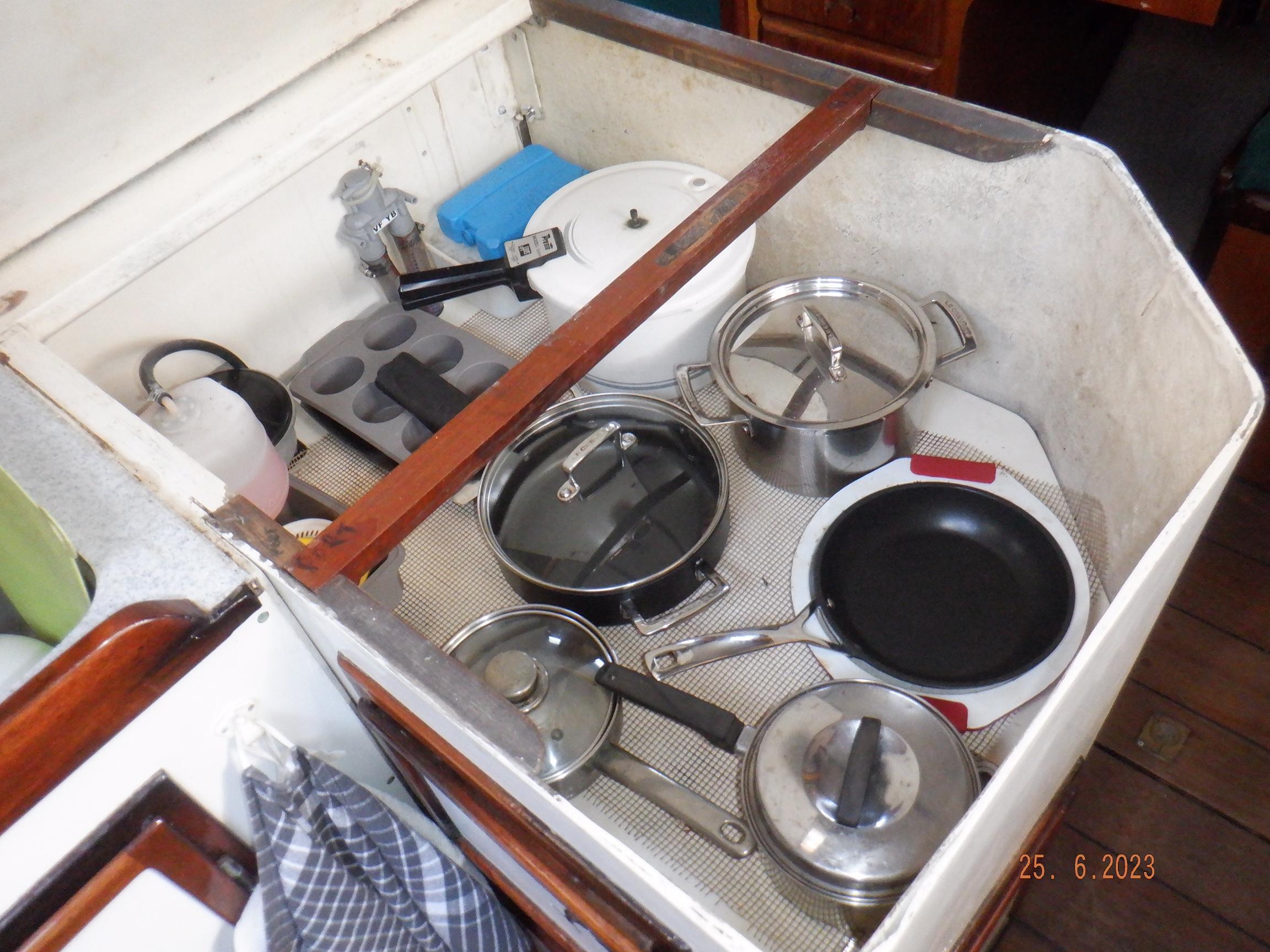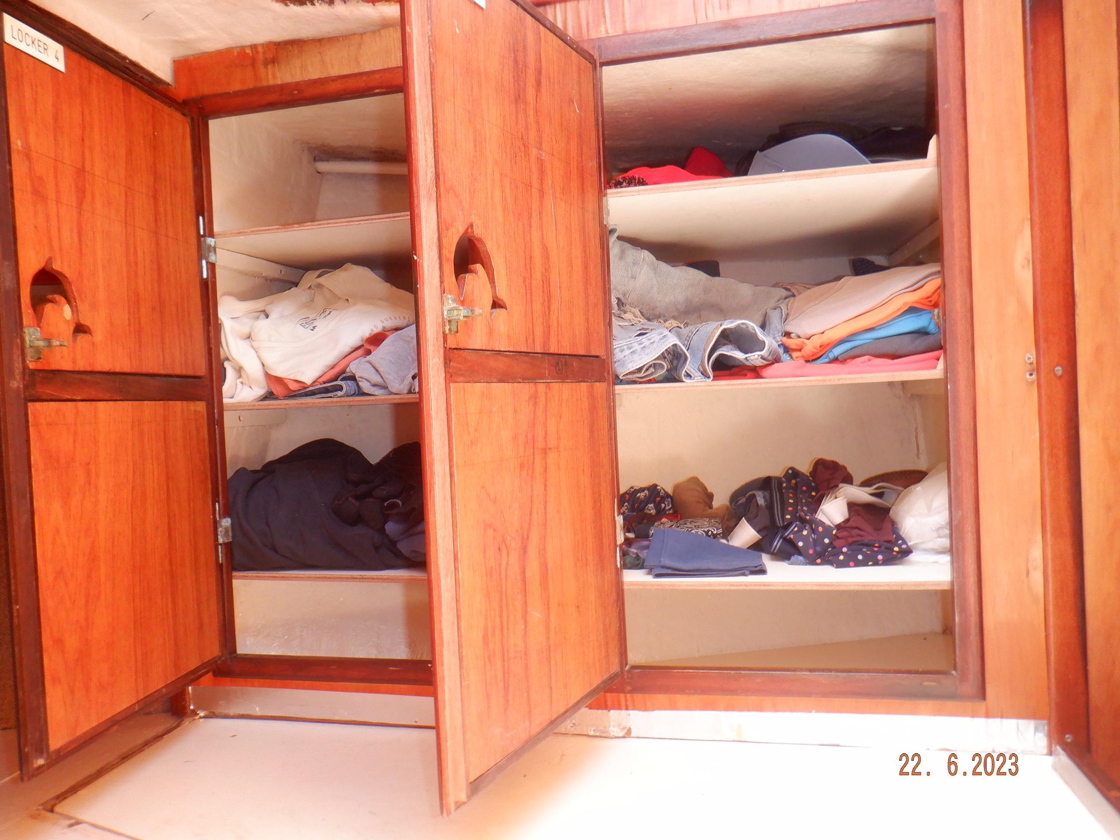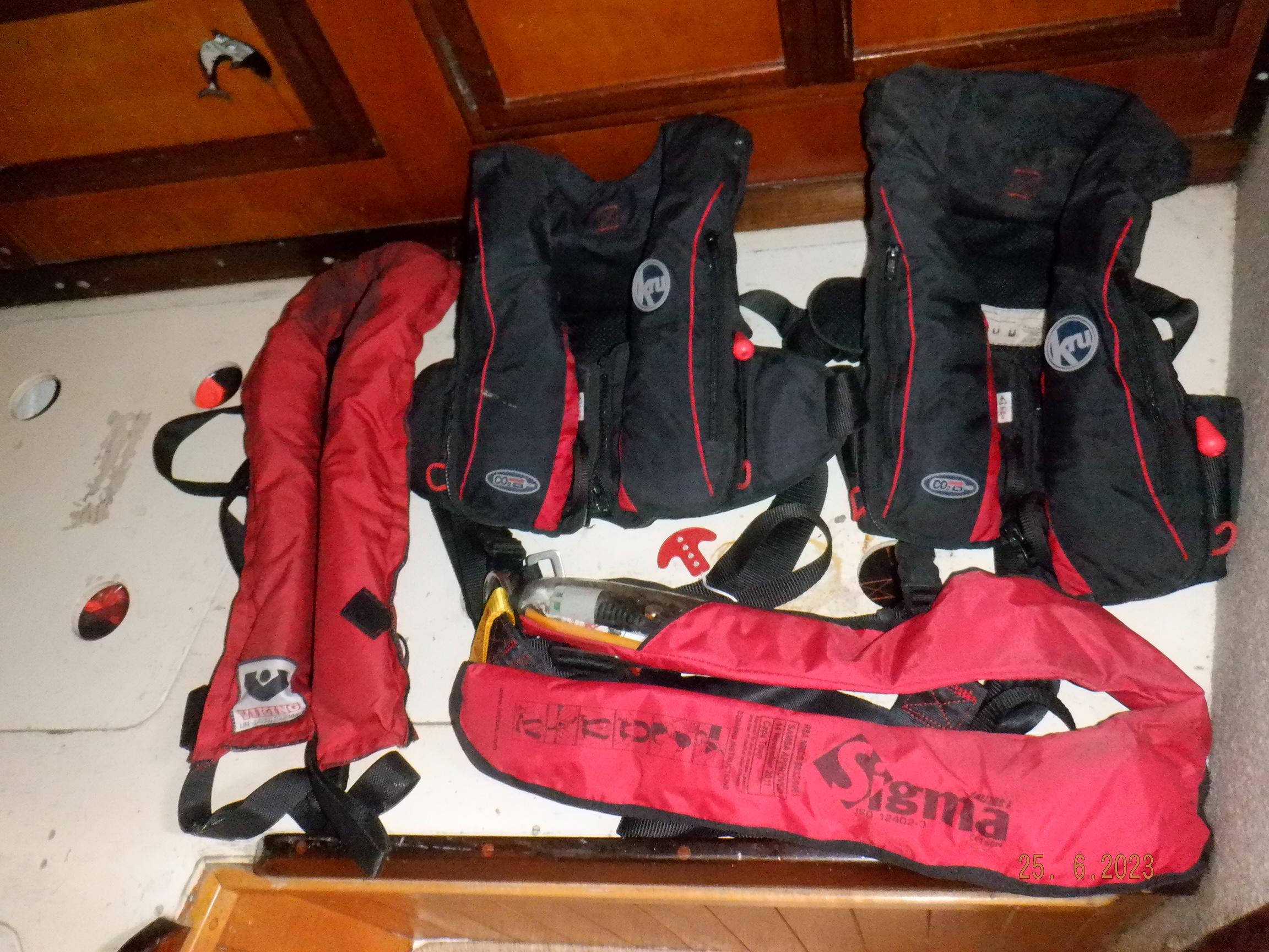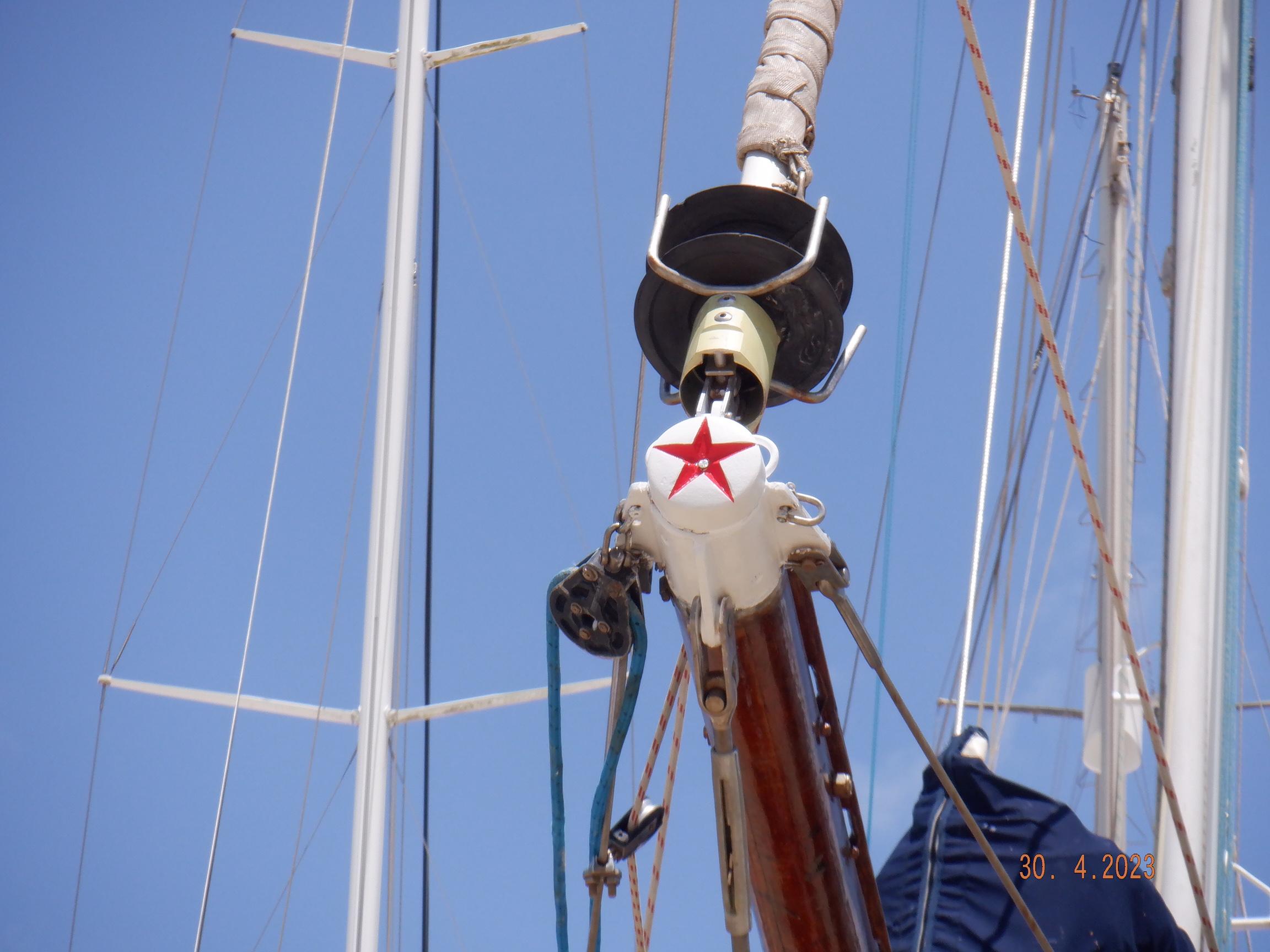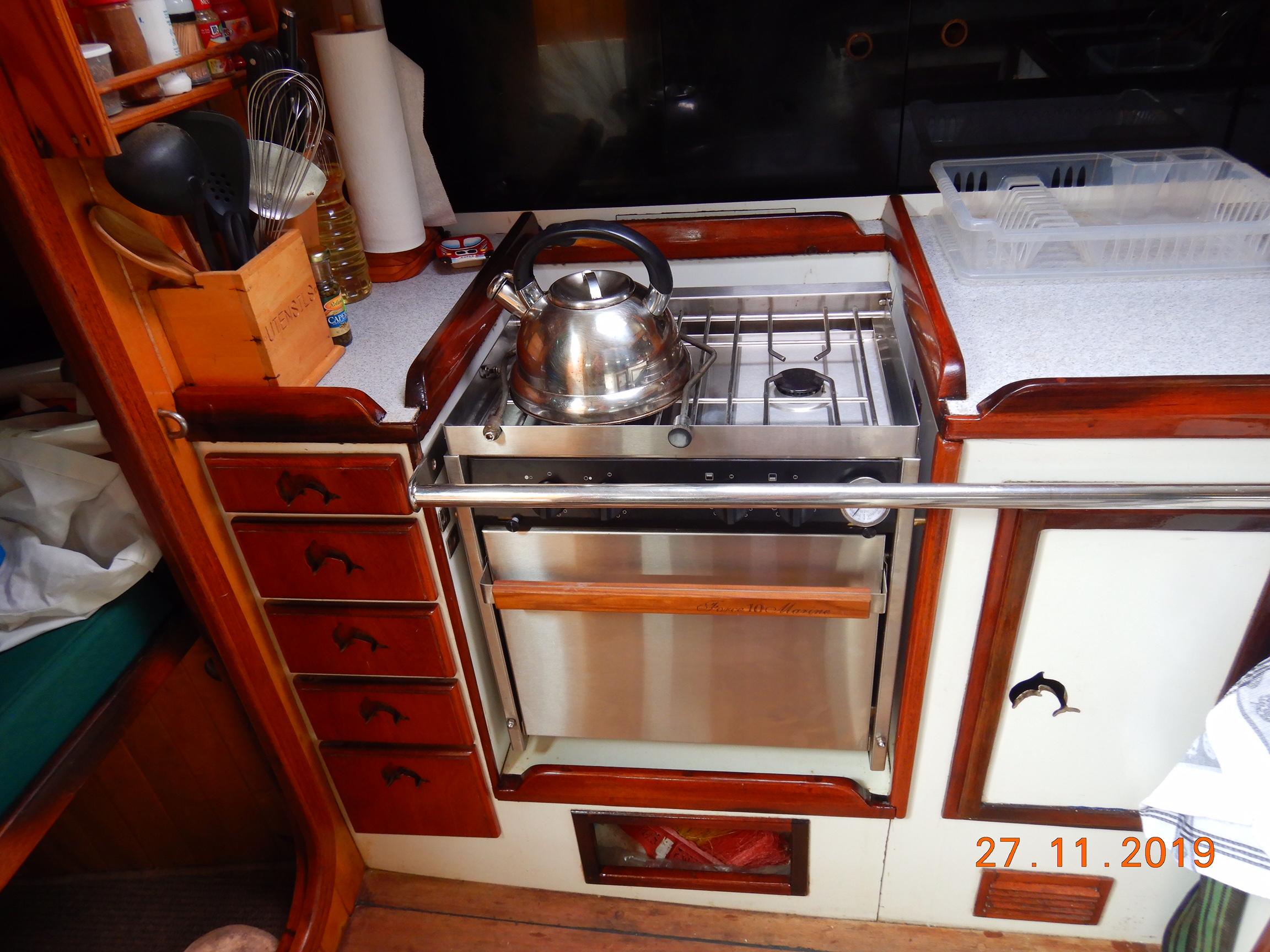 Equipment List Rig/Sails Sparcraft mast and boom, twin spreader. Cutter rigged with masthead staysail. Mast steps up to lower spreaders then a single pair at mast head to provide stability when working at masthead. Removable running backstays Twin backstays 3 forestays. Main forestay to bowsprit end with Profurl furler for genoa. Masthead. Inner forestay to bowsprit base for hank-on staysail. Masthead, making for a well secured mast. Highfield Quick release lever at base. Inner inner forestay to upper spreaders for storm jib. Also Highfield quick release lever at base. Bellamy kicker. Traveller 6 halyards with double purchace main halyard. Grannybar on starboard, with goody-bag designed for easy storage of winchhandle, sail ties, short lines etc. Spinaker pole, plus jockeypole. Ullman stackpack with adjustable lazyjacks. North fully battened mainsail with two reefs Ullman 110% genoa. North heavyduty #3 hank-on staysail, with 4 battens. (my favoured sail when on passage) Quantum reaching gennaker (good condition but colour has run) Storm trysail plus storm jib All sails in good working order. WINCHES IN COCKPIT Lewmar 56st primaries Lewmar 46st secondaries Portside cabintop:- Barlow 25 for toppinglift, reefing lines Starboard side cabintop:- Lewmar 46st for mainsheet, kicker, Cunningham ON MAST Port:- Lewmar 30st for staysail halyard, port spinaker halyard. Starboard :- Lewmar 30st for main halyard, genoa halyard, starboard spinaker halyard, stormjib halyard. Under boom:- for outhaul, plus can use for reefing lines, etc. ENGINE Yanmar 3JH40 common- rail diesel 40hp (hours currently 284hr June 2023) Installed late 2018 KM35 transmission, Vetus Bullflex coupling 30mm s/s propshaft. Fixed blade 17×13 propshaft TENDER/DINGHY ZODIAC 2.5m PVC inflatable (near the end of its life) Inflatable keel, grp over honeycomb floor panels MERCURY 5hp outboard with remote fueltank Paddles and pump, anchor and rode ELECTRONICS (all installed 2016/7) AT NAVSTATION Raymarine eS97 chartplotter/MFD Raymarine Ray60 vhf radio with DSC AIS 650 transceiver Raymarine ACU200 autopilot control (Robertson HLD2000 Mk2L hydraulic ram at rudder quadrant) Garmin GPSmap76 handheld (old & never used, but working. Uniden Atlantis250 handheld VHF (old and battery failing) IN COCKPIT Raymarine eS75 chartplotter/MFD Raymarine P70 autopilot control Raymarine i60 wind instrument Raymarine i70 multipurpose instrument Raymic VHF handheld plus active speaker ON MAST Raymarine Quantum radar ELECTRICS Eclectic Energy D400 wind generator with Xantrex charge/load controller 300w solar panel with Victron MPPT 100/15 controller Xantrex battery monitor 2 off Lifeline AGM GPL-8DL 255ah house batteries 1off xStream Power MF115D31R 85ah cranking amps 830amps engine start battery. Victron blue-smart 30a battery charger Victron Phoenix 12/800 inverter Four electric bilge-pumps in bilge, for quick clearance of water. One extra large manual bilgepump in saloon area. WINDLASS/GROUNDTACKLE Maxwell RC10/10 1200w 12v vertical axis, with capstan. Maxwell Autoachor 710/6 cordless remote control. Secondary Up/Down control box out of forecabin(thru hatch). Keeps switching equipment away from damp environments except when in use. VULCAN 20kg galvanized anchor FOB HP 20kg galvanized backup anchor CHAIN/RODE:- (connected) 70m of 10mm galvanized chain (backup) 30m of 10mm galvanised chain plus 50m of rode. Stored underforepeak bunk in separate locker, with tubular feed up into anchor locker on deck, connected permanently for quick access. ON DECK 2 dorades ahead of traveller feeding fresh air to galley and starboard aft cabin. Teak mounting brackets for boathook/paddles/oars/battens/etc. Sampsonpost with s/steel plate atop, useful when cutting/drilling etc. Ample cleats, fairleads, clutches etc. Pressurised seawater deckwash outlet on portside deck. Various fenders, docklines. 2x 25liter diesel jugs. 1x 10liter petrol jug. GALLEY Force 10 2burner stove with oven/grille. Adjustable Potholder brackets, Gimballed. Replaced Jan 2020. Ample pots, pans, baking/roasting trays, pressure cooker, s/steel kettle. Full range of chefs equipment, knives, ladles, tongs, graters, etc etc etc. Six-piece cutlery (s/steel) crockery (melaware), mugs and glasses, with spares of certain items. Ample airtight containers for in-use ingredients, plus food storage. Double sink, fed by pressurised cold fresh water, footpumped drinking water, and footpumped seawater. HEADS Vaillant gas waterheater to handbasin, never used but tested from time to time. JABSCO compact electric toilet Pressurised hot/cold water to handbasin. Handshower incorporated into tap unit. SAFETY EQUIPMENT Viking 4man cassette liferaft, mounted in quick release bracket on deck. MOB horseshoe life-ring with danbouy. 4 x PFDs 6 x life jackets Waterproof canister with flares, smoke signals, mirror, etc. 2 off 2.5kg drypowder fire extinguishers. 1 off 2.0kg CO2 fire extinguisher. Rigging Shears (1/2 inch/ 12.7mm) capacity, brand new in box. Ullman sail repair kit MISCELLANEOUS Nikon 12×50 binoculars 2x goggles, 2x snorkels, 2x flippers Spareair 15min scuba tank 1 x scuba bottle (almost full, used to fill Spareair. 2 x sleeping bags Fitted sheets for all bunks, pillows and pillowslips 8 x scatter cushions for saloon Various bath towels, hand towels, beach towels, kitchen dish towels and hand towels. Gas braai/barbecue mounted on pushpit. Coldwater handshower in cockpit. Bosuns chair Rope climbing kit for solo mast climbing 12v air compressor 2 x boathooks Full set of handtools (all mounted) to carry out any repairs/service. Makita 18v cordless anglegrinder Makita 18v cordless 13mm drill Makita 18v cordless 10mm angledrill Makita 18v cordless orbital sander Makita 18v cordless jigsaw 220v/18v Makita charger 12v/18v Makita charger. 2off Makita 18v 5ahr batteries 1off Makita 18v 1.5ahr battery Makita18v cordless airblower Makita 18v cordless hand vacuum. Bench vice attached to workbench. Various spare belts, filters, nuts