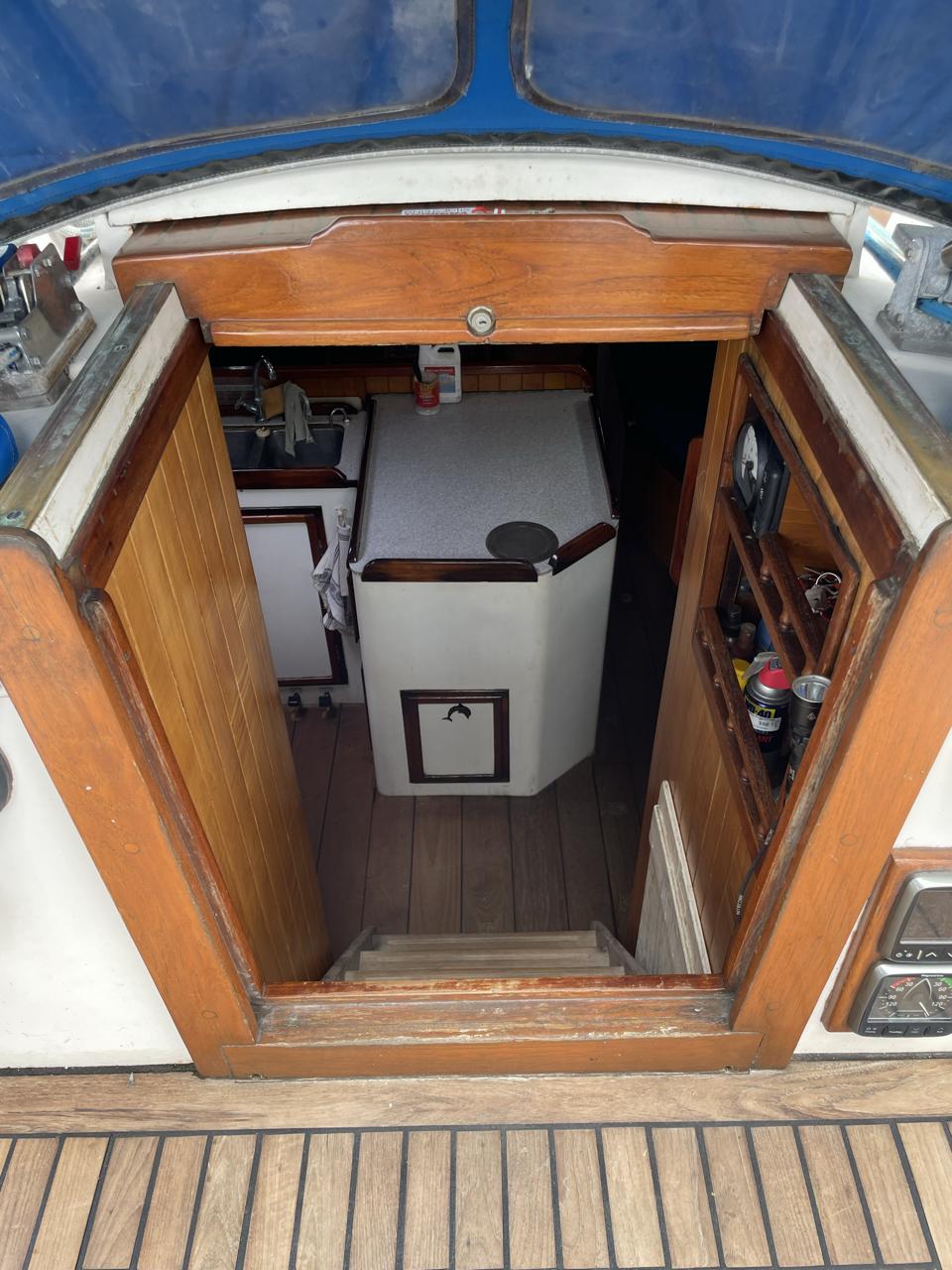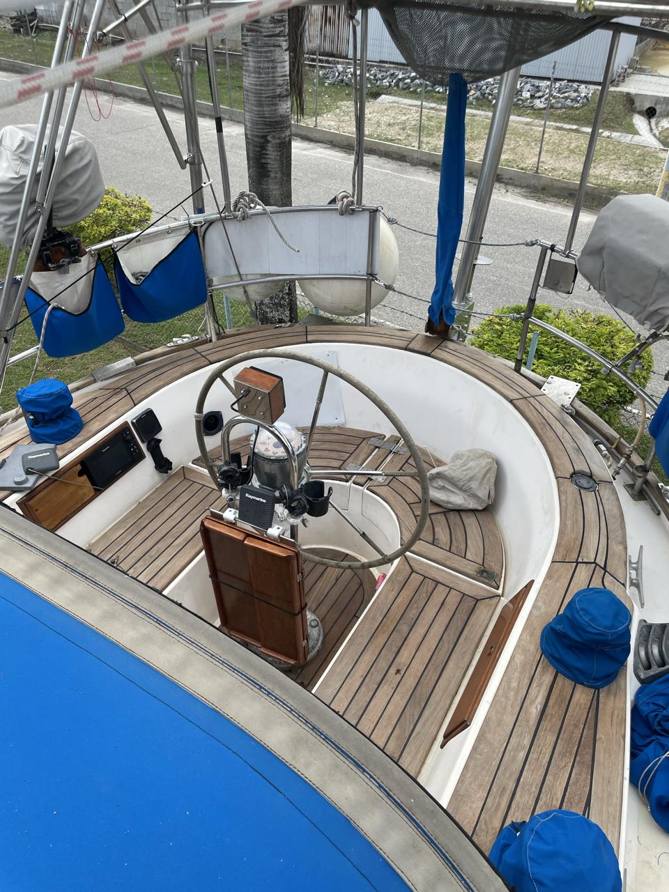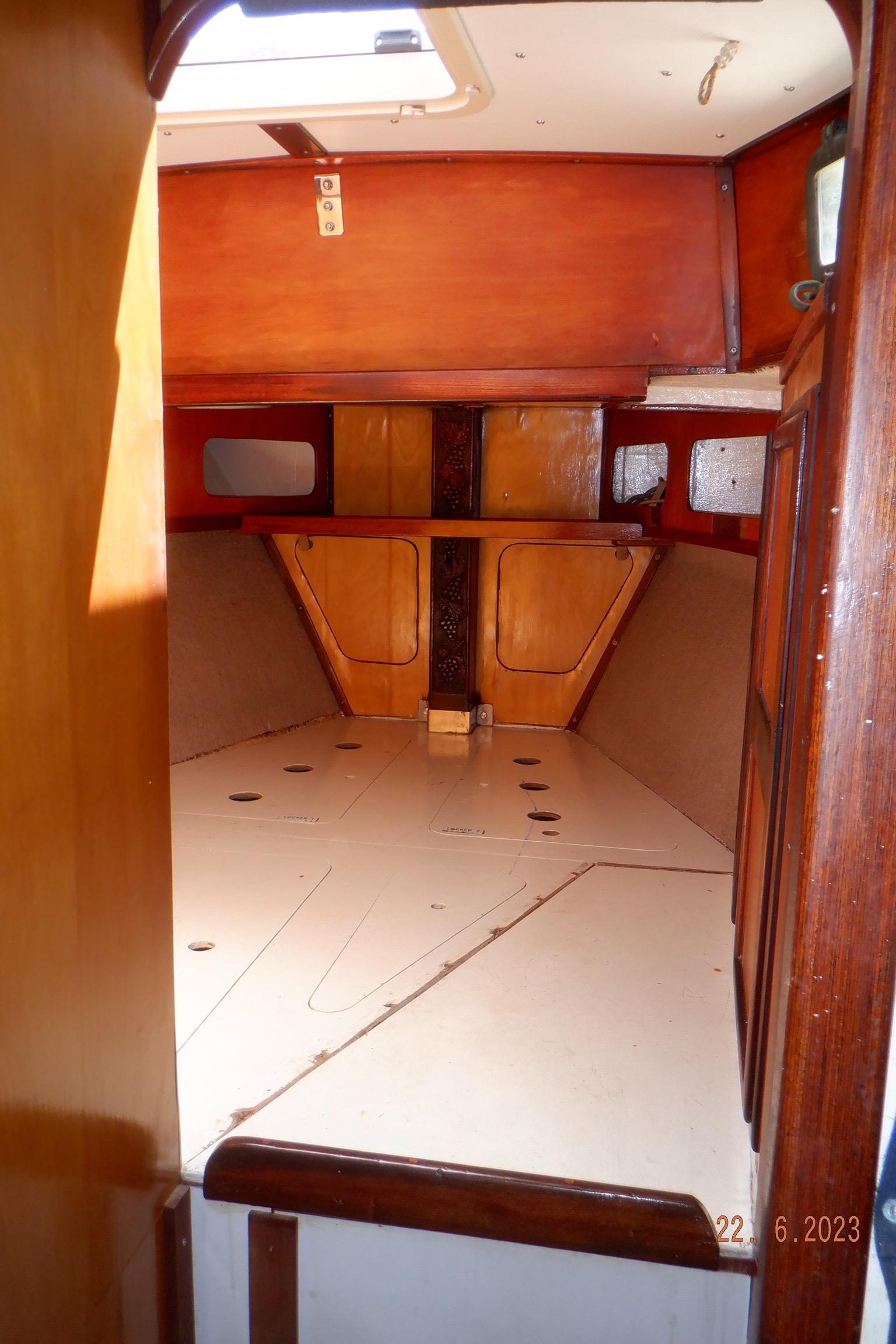 DESCRIPTION General Interior Shoestring has a 3 cabin layout with a single heads, as per the brochure. The forecabins pullman berth has been enlarged to cover the full floorspace, creating an extra sail locker, but this can quite easily be reversed. The starboard quarterberth is a full double, whilst the port quarterberth is a 3/4 cabin. The main saloon settees also make comfortable pilotberths. The bunks average 2meter long. The heads has an electric toilet, and a pressurised gas-heated shower. More than enough lockers, drawers, and cupboards to stow everything. Opposite the heads is a custom workshop, with workbench and vice, and custom tool storage. Foldable dining table in saloon. Saloon hatch is a 115x70cm (45x28inch) two-leaf butterfly hatch with tinted shatterproof glass. Cockpit and deck area Cockpit and cockpit sole lined with 22mm Burmese teak. After 20years is not even half worn yet. Edson pedestal (chain/cable steering to quadrant on rudder), 36inch s/steel leather covered wheel, foldaway table and removable cup/glass holders. Canvas dodger and bimini,. Transom-hung rudder with 4 s/steel steps on either side for boarding (always available in an emergency), emergency tiller permanently mounted on rudder, folded up out of the way. Winch positions and uses all listed in Equipment list. Clutches for all lines. Shoestring is a Category A craft for trans-ocean sailing and is fully equipped for this. There are on-deck teak racks for boathooks, oars, fishing rods, battens, etc.