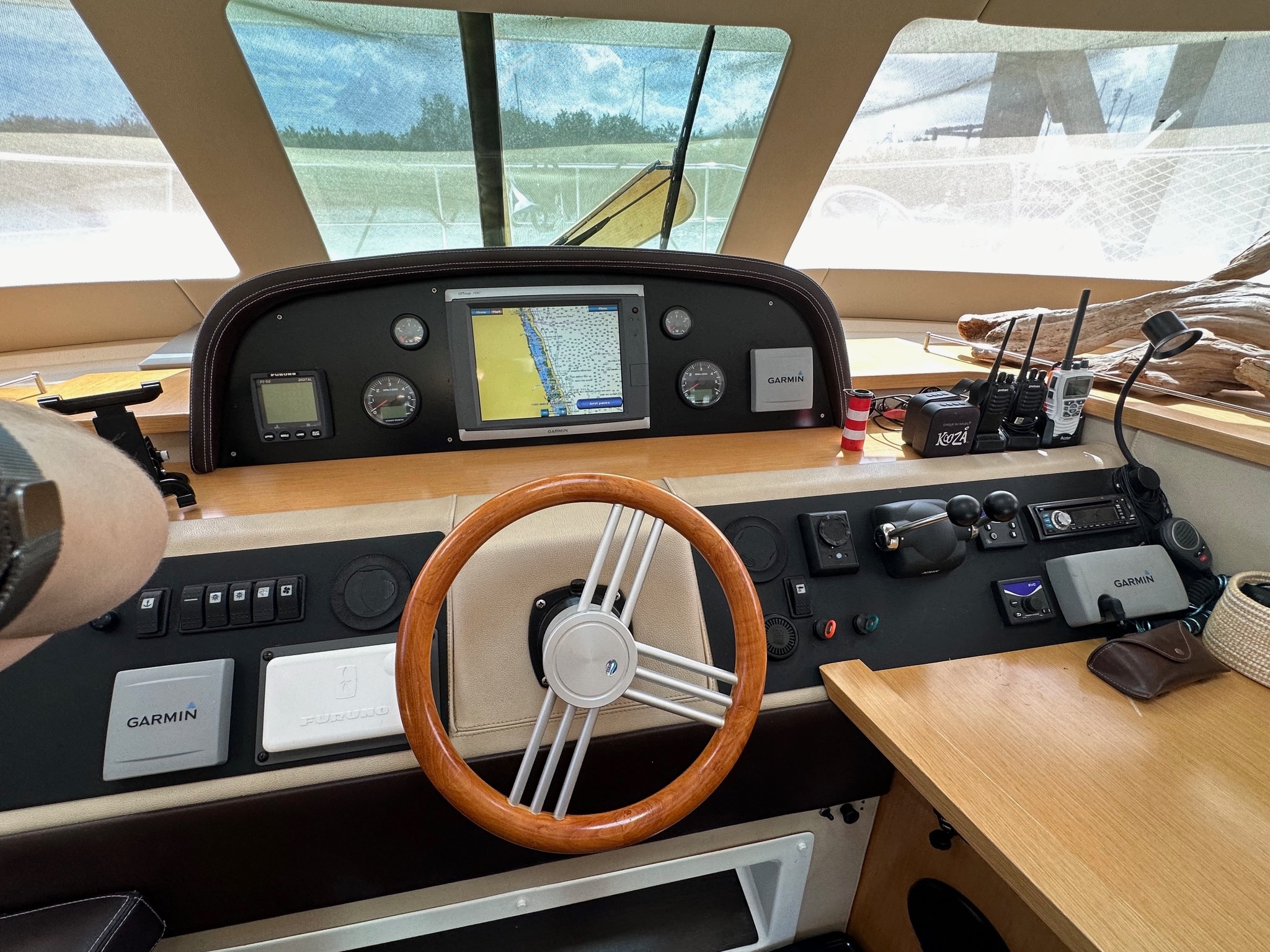 Complete control panels and dual engine controls at helming station and on the flying bridge