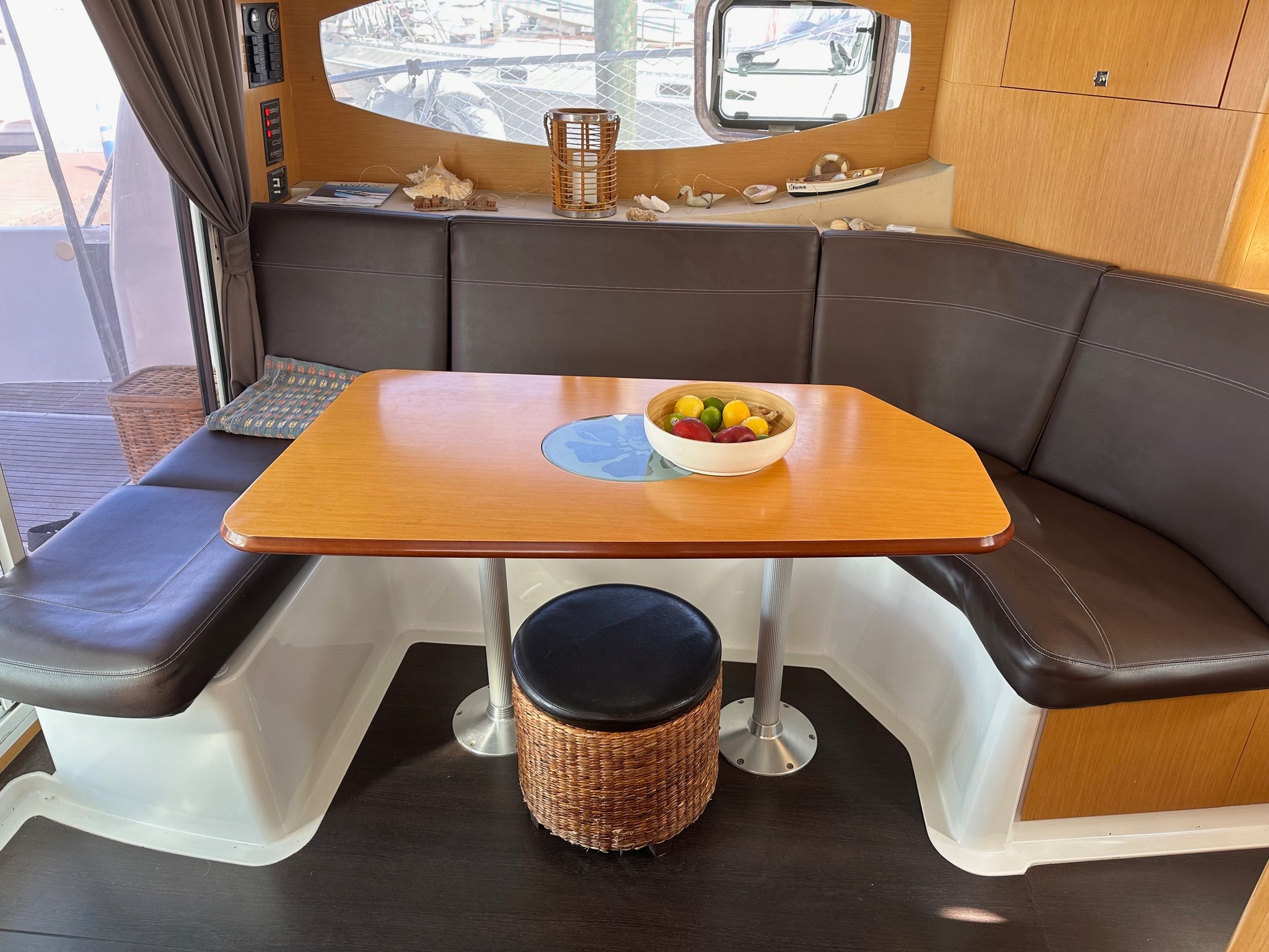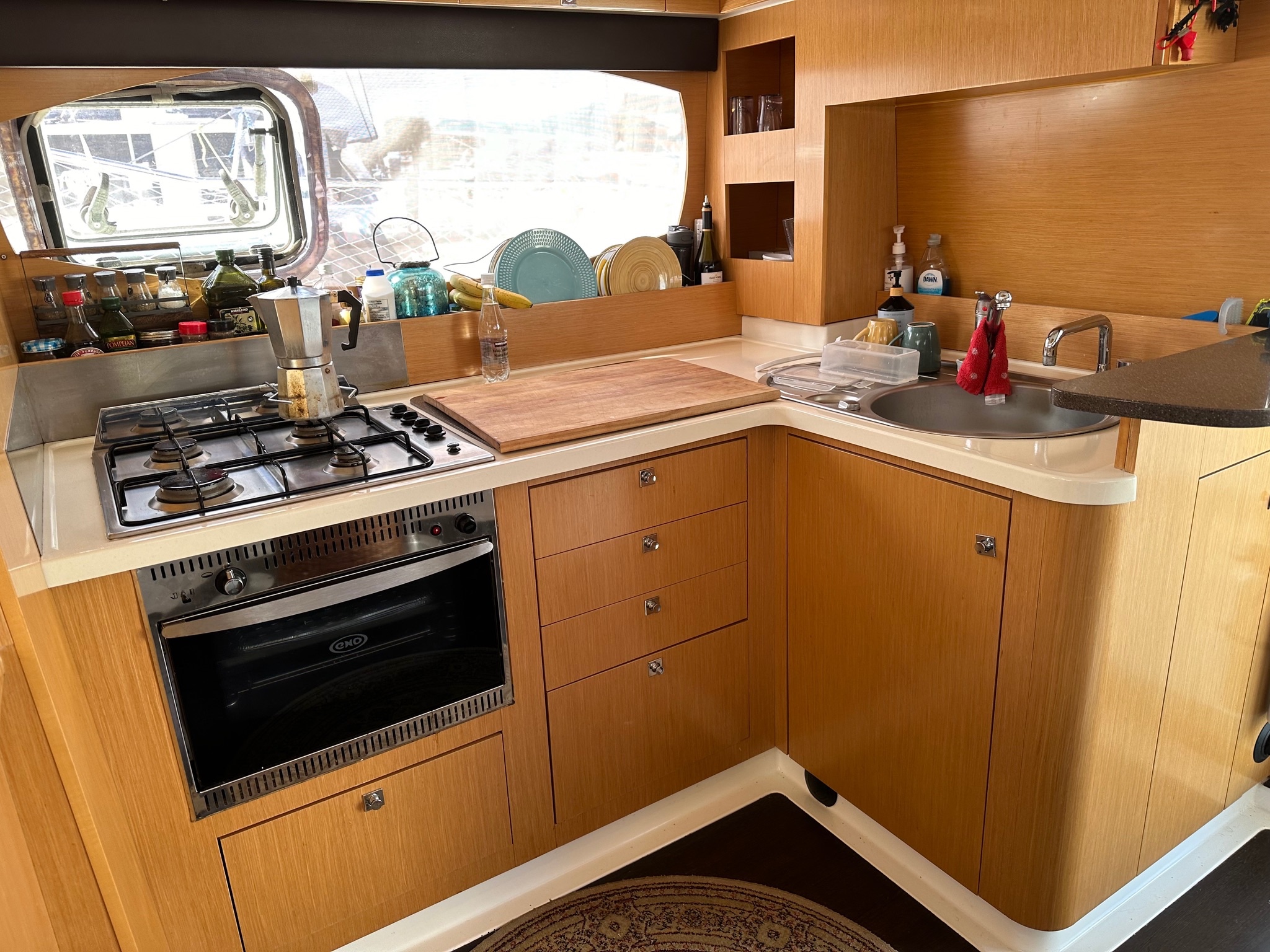The vessels are entered through wide sliding glass doors that lead to a wide and spacious Salon. To Starbd is the U-shaped Galley, and to Port a seating or dining area.