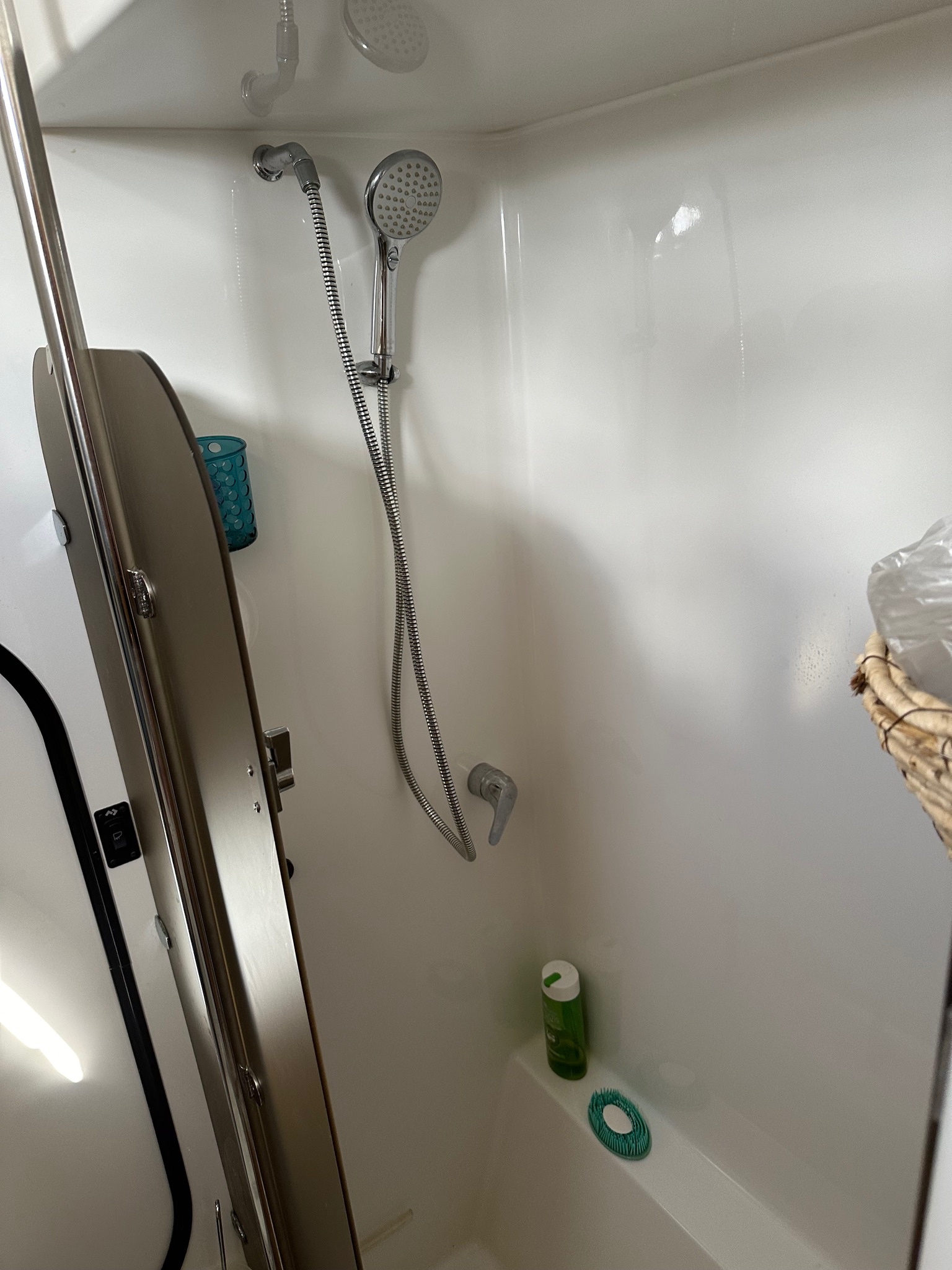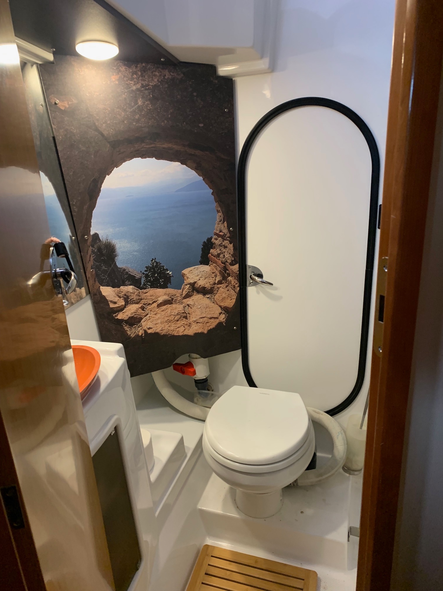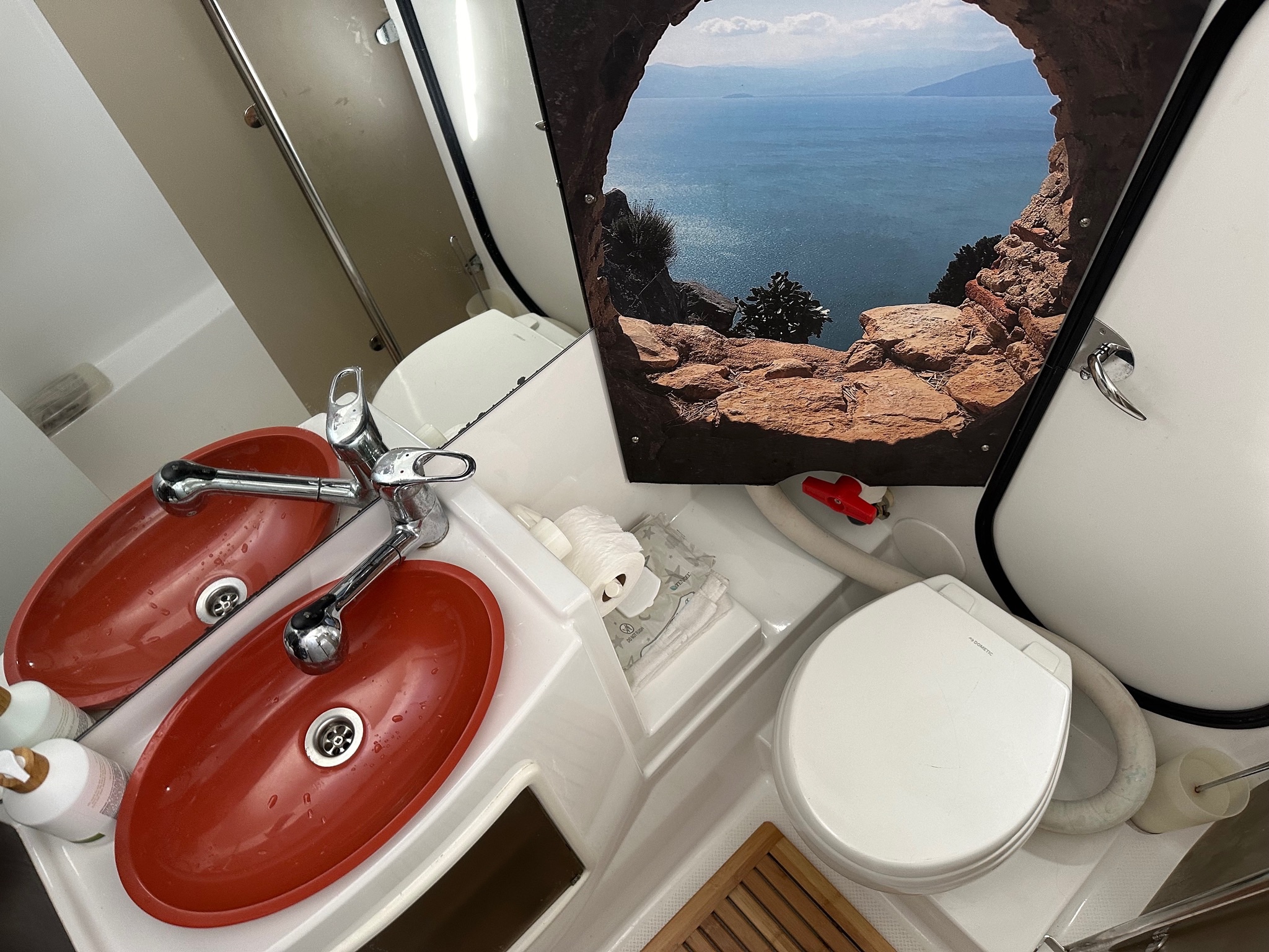 MASTER CABIN: Located in the Starbd Hull – the comfortable Owner’s cabin has a transverse berth, with a view of the sea. There is also a private bathroom with head and shower
