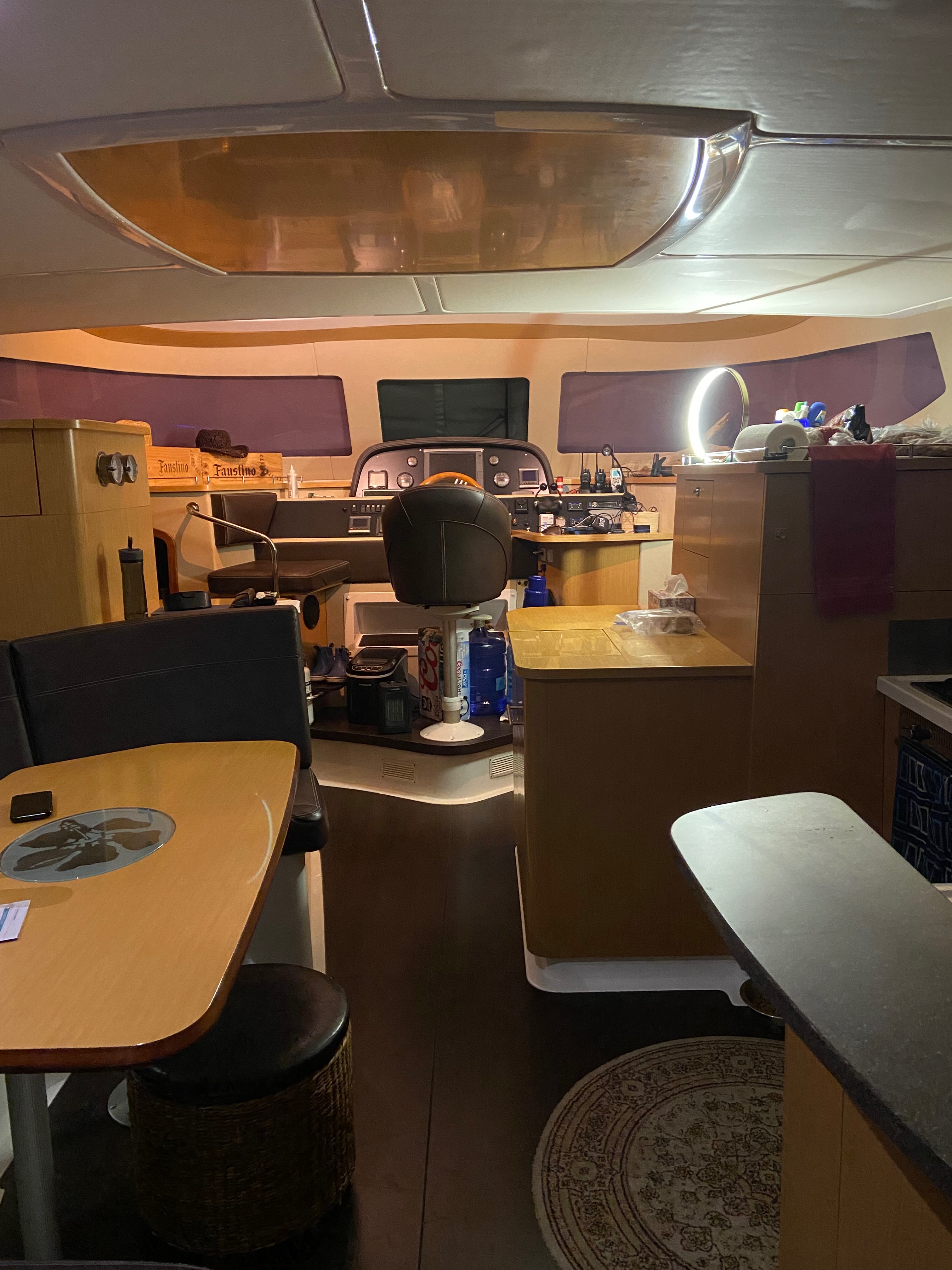 Storage cabinetry separates the aft part of the Salon from the forward area with the lower steering station.