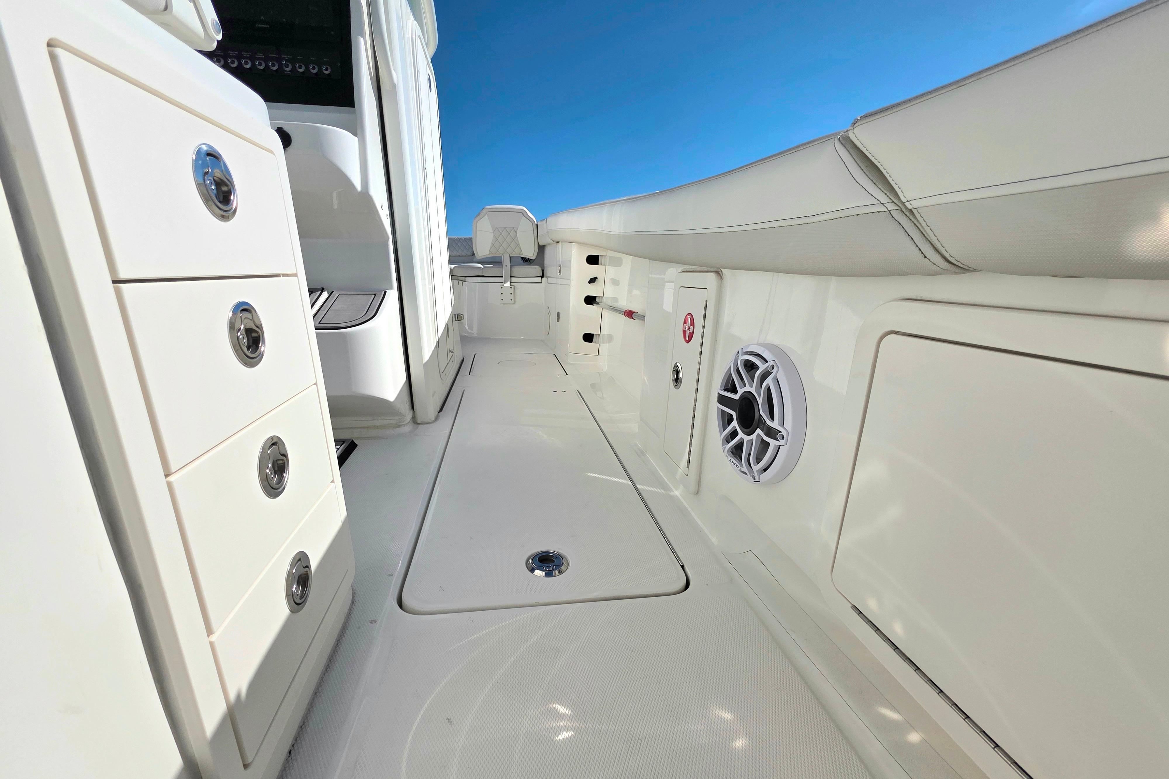The 325DC’s twin-hull platform keeps you stable whether drifting for tuna, cruising to Block Island, or entertaining inshore. The Mercury V10 350s provide reliable speed and excellent fuel economy, with easy maneuverability thanks to joystick piloting.
