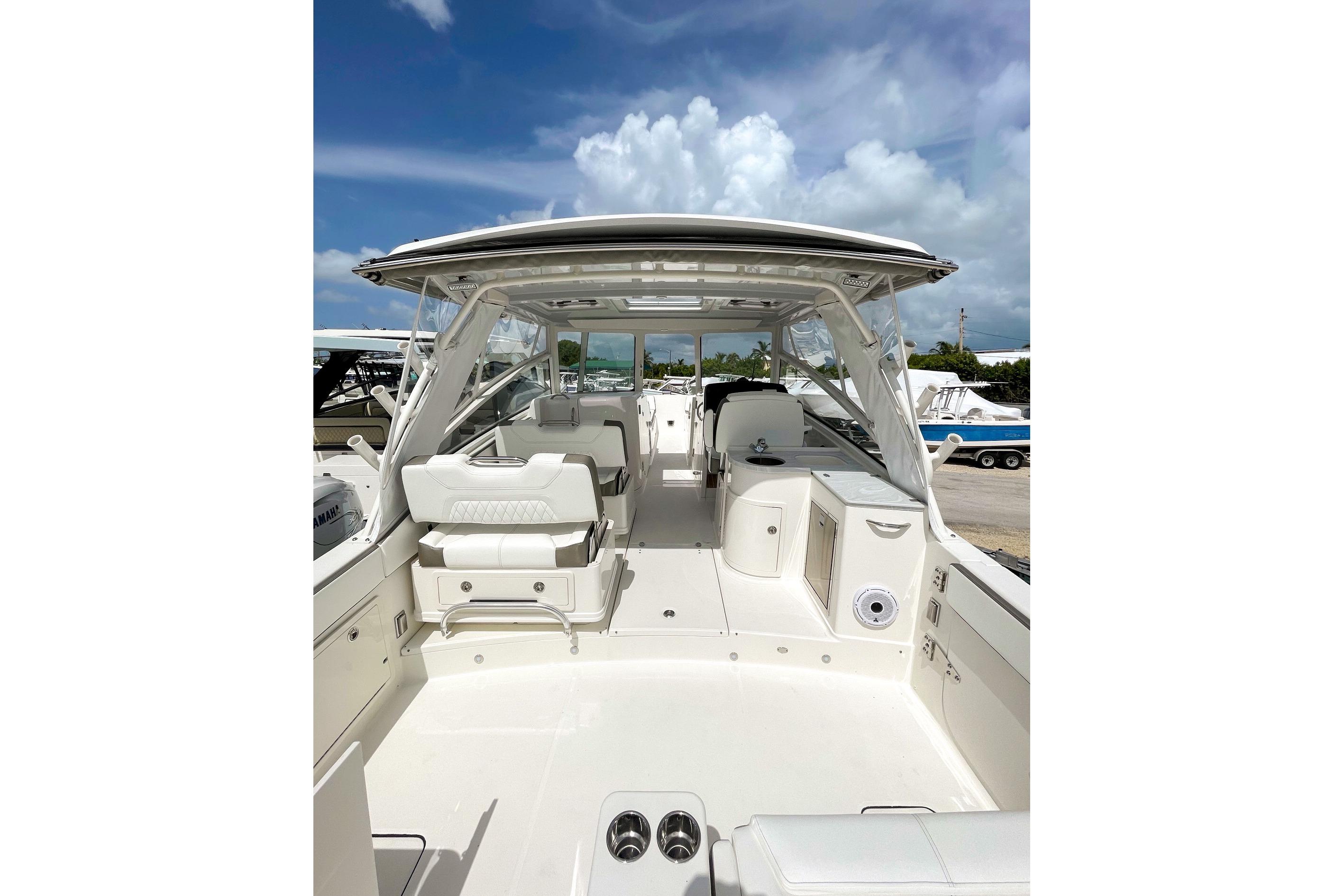 Joystick steering, diesel generator, air conditioned stateroom, head, helm with full Strata Glass enclosure and Electric Retractable Cockpit Sun Shade, Pool Style Dive / Swim Ladder, Live well Fish Box