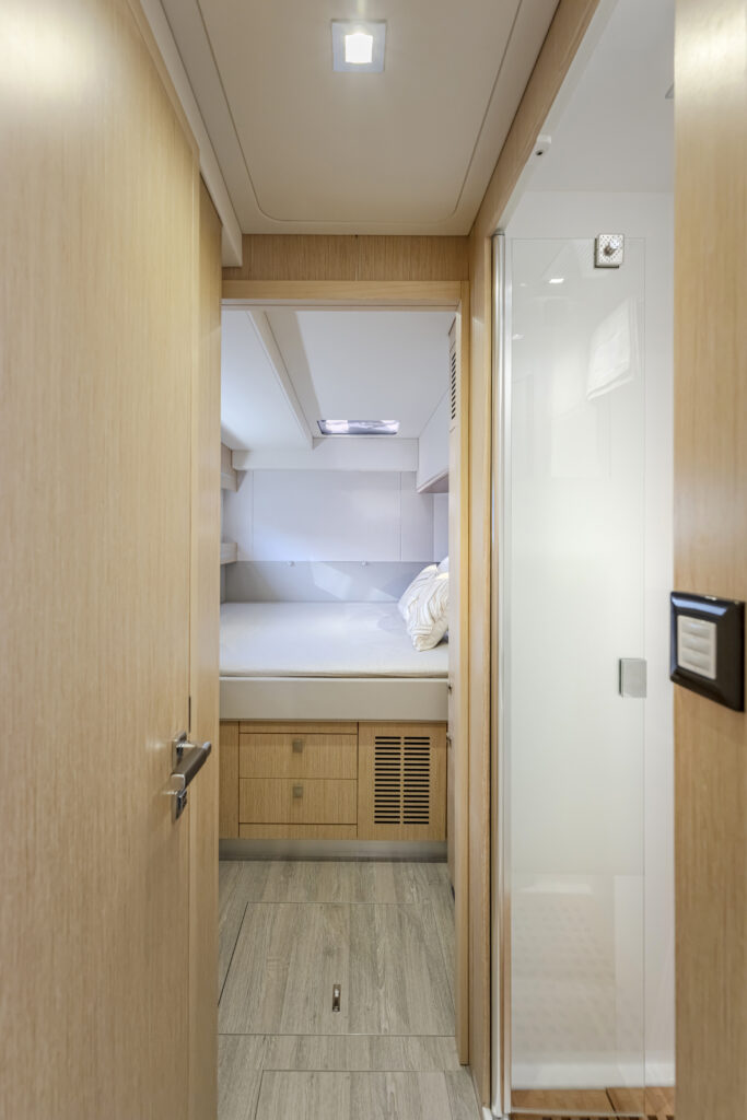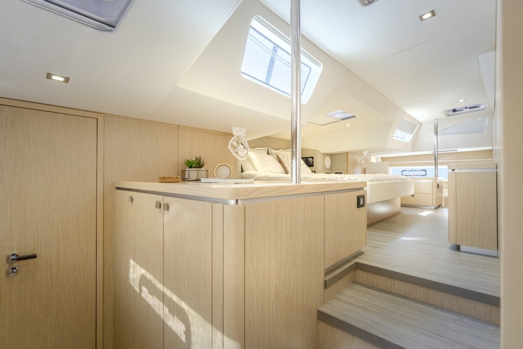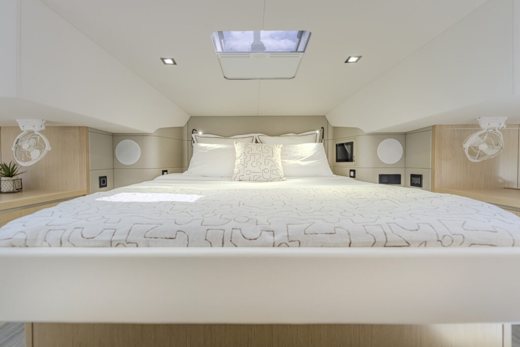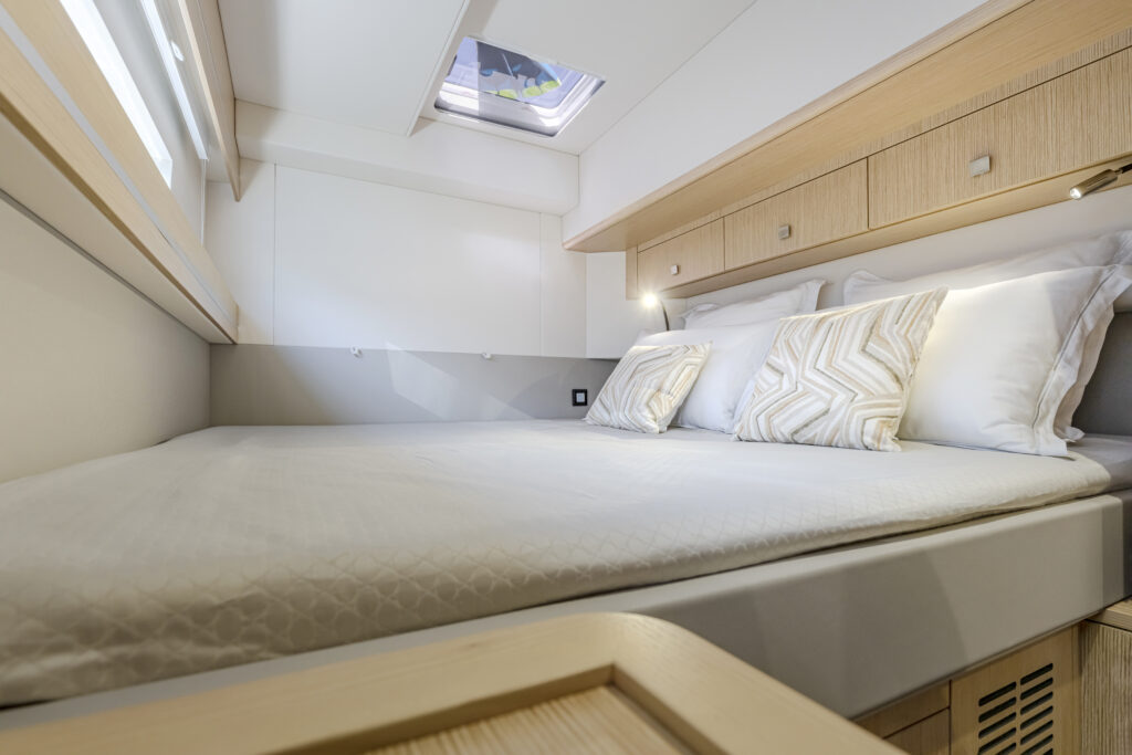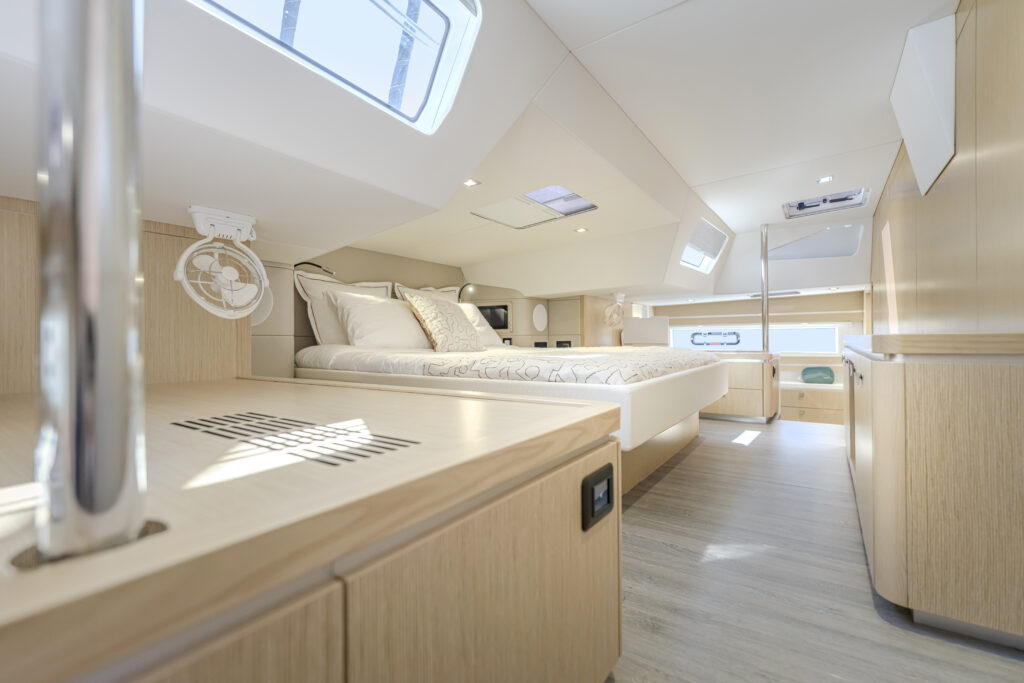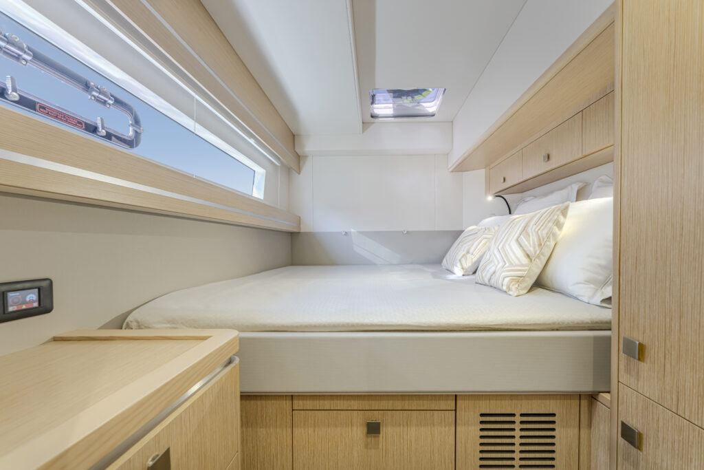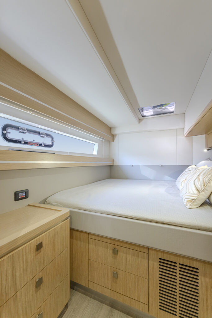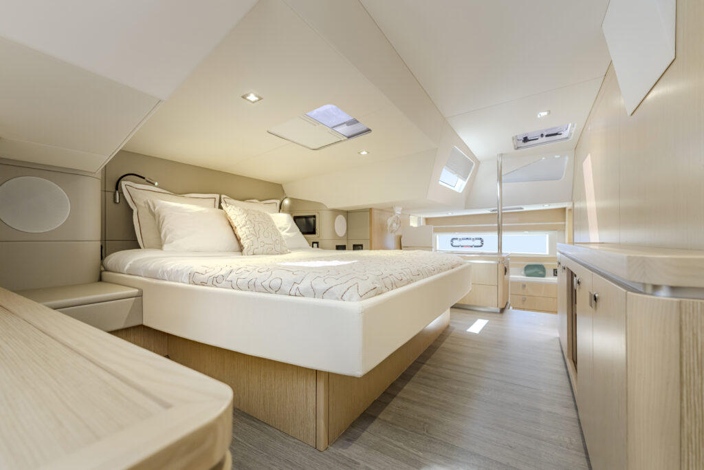 Privilège's interiors are designed by Franck Darnet, who is more accustomed to designing superyachts. You really feel that pedigree onboard, and nowhere more so than in the master cabin. Fine fabrics and immaculate joinery give a real sense of luxury.